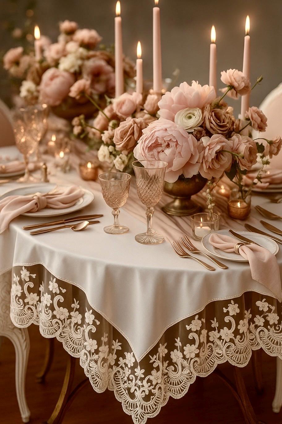 Delightful tablecloth in natural white Italian linen with white decorations, made of fine lace with small glitter lights.