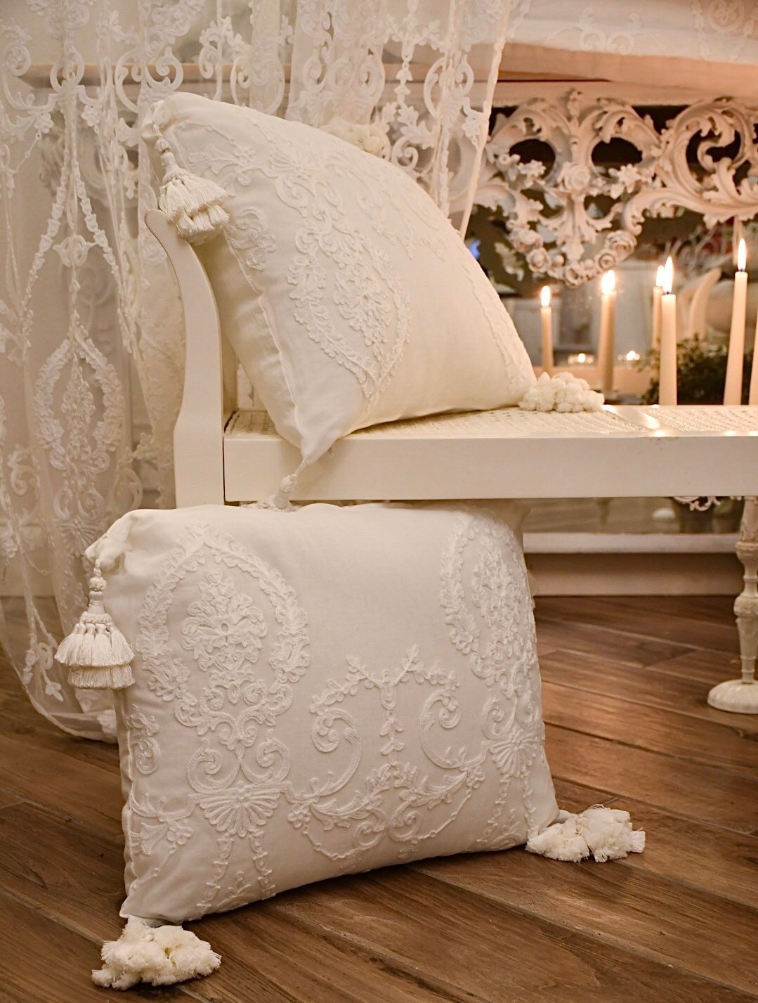 A precious jewel to decorate your home, from the bedroom to the bed, sofa, and armchairs. White embroidered linen and tulle with 4 "burlesque" bows on the 4 corners.