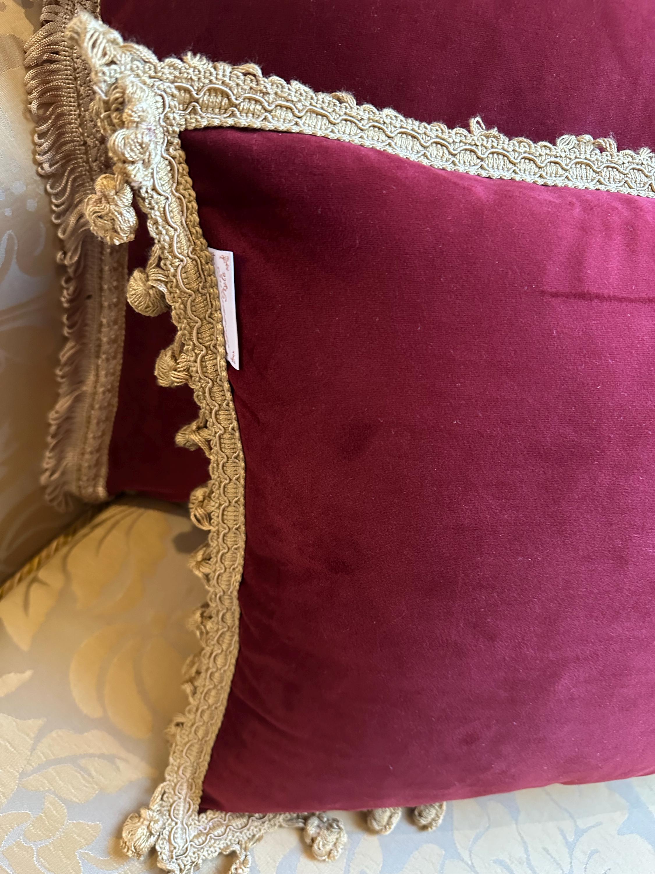 Delightful cushion in fine burgundy velvet and fine gold trimmings, an Italian excellence for quality and high tailoring.