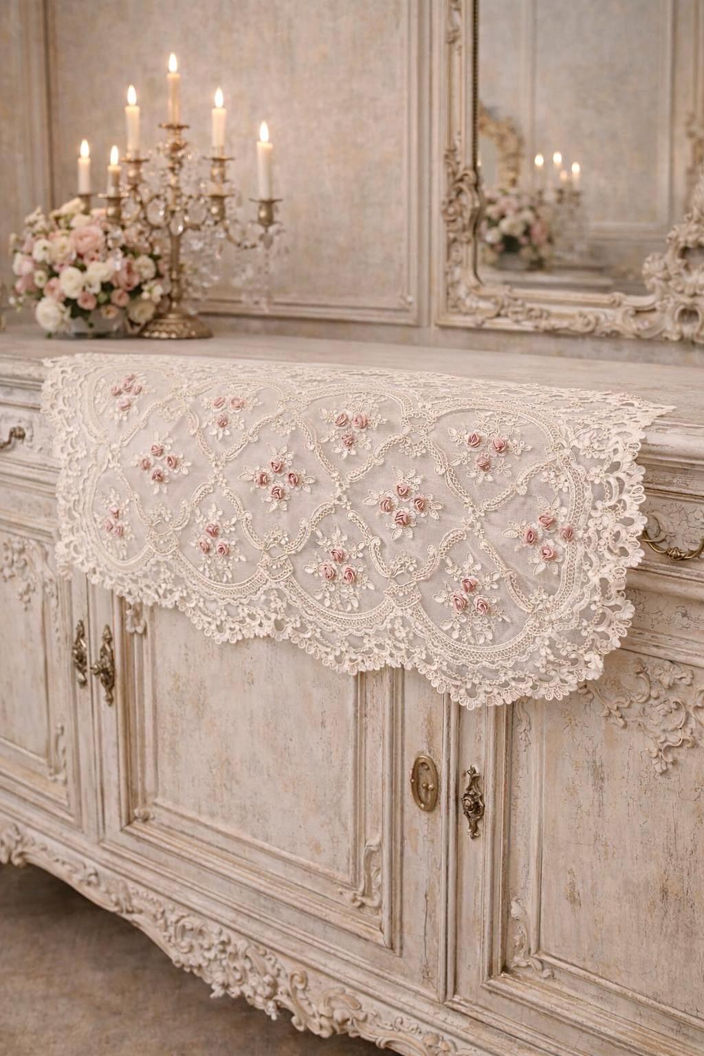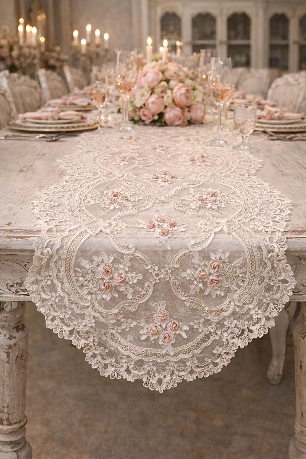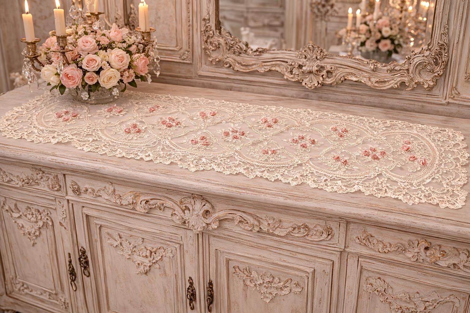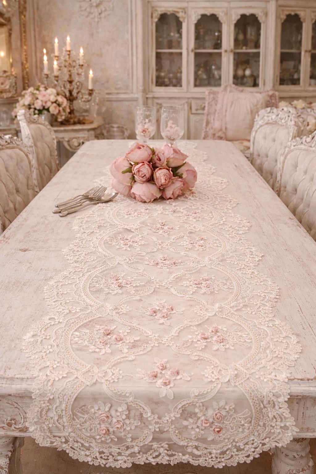 Wonderful runner in rebrodè lace and embossed roses. Handmade in our tailoring workshops, in width 38 cm (14.96 inches), in different length sizes that can be purchased individually or you can purchase the trio consisting of 2 of 38x38 cm and 1 of 38x60. Or purchase them individually.