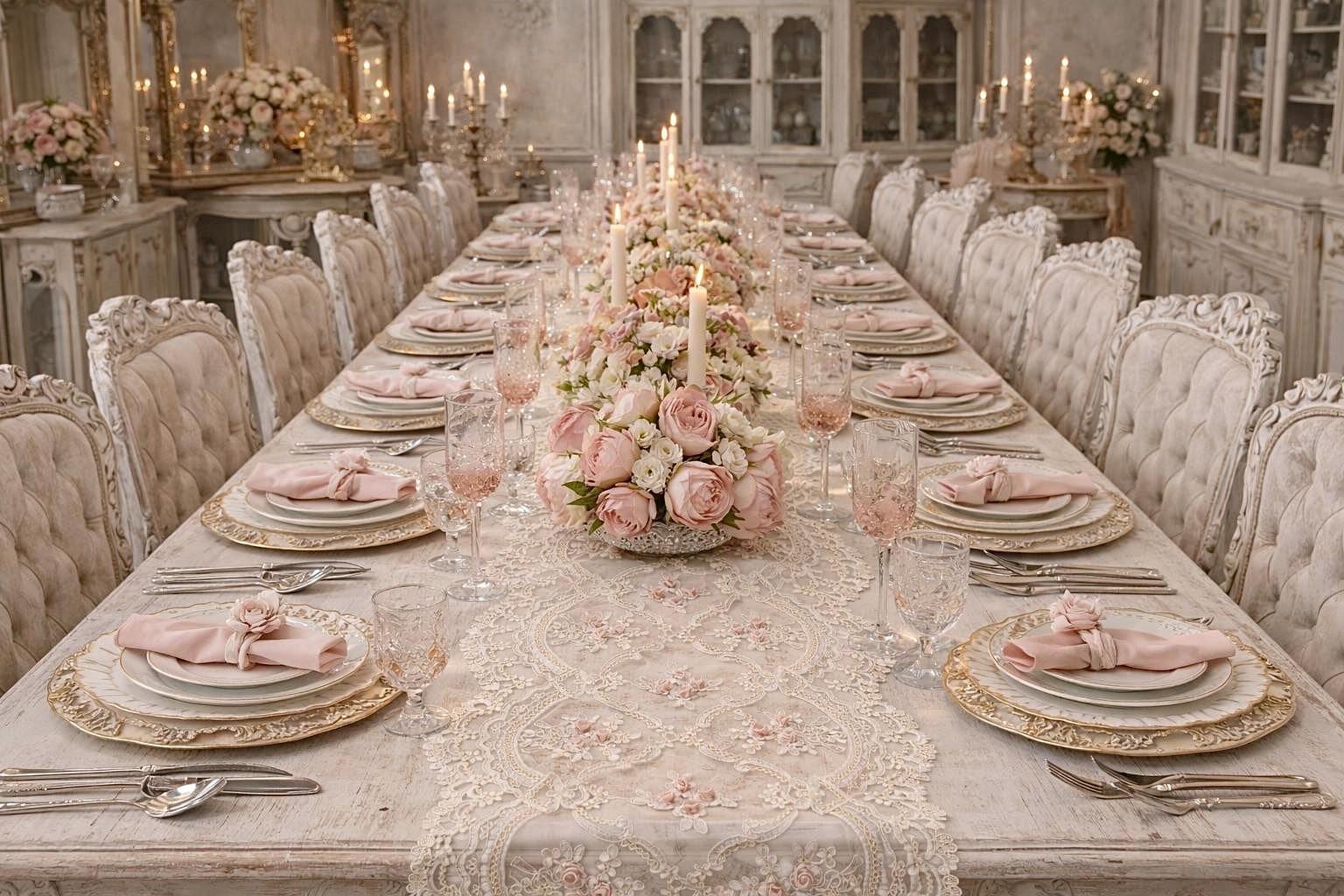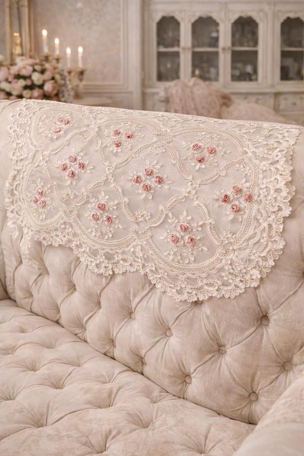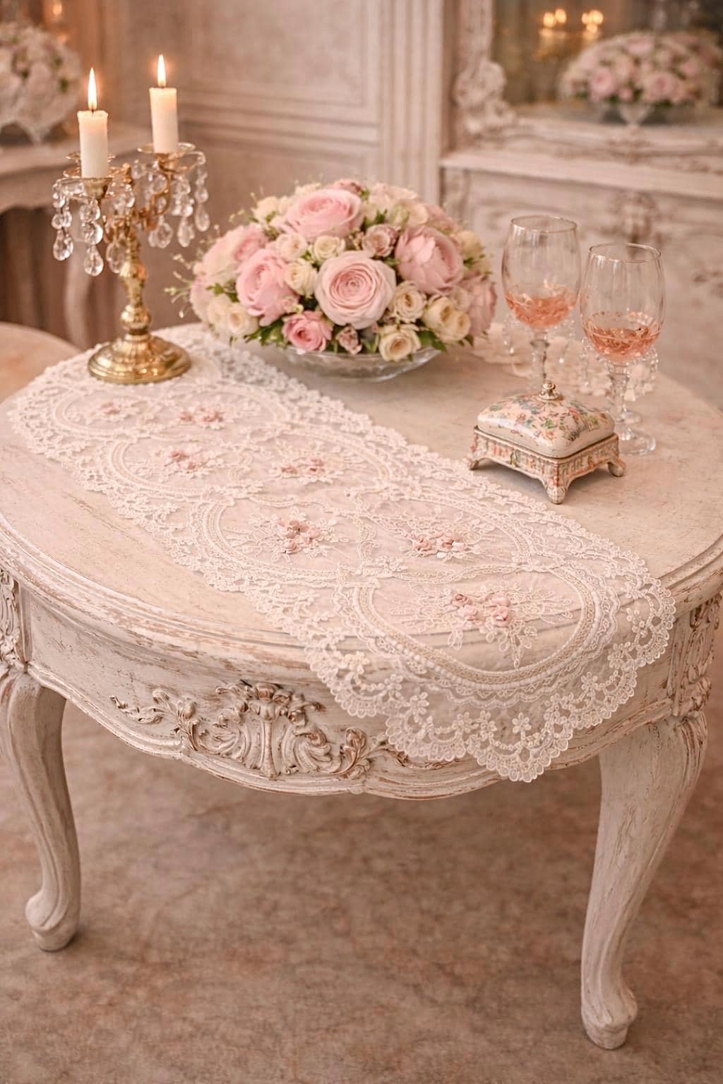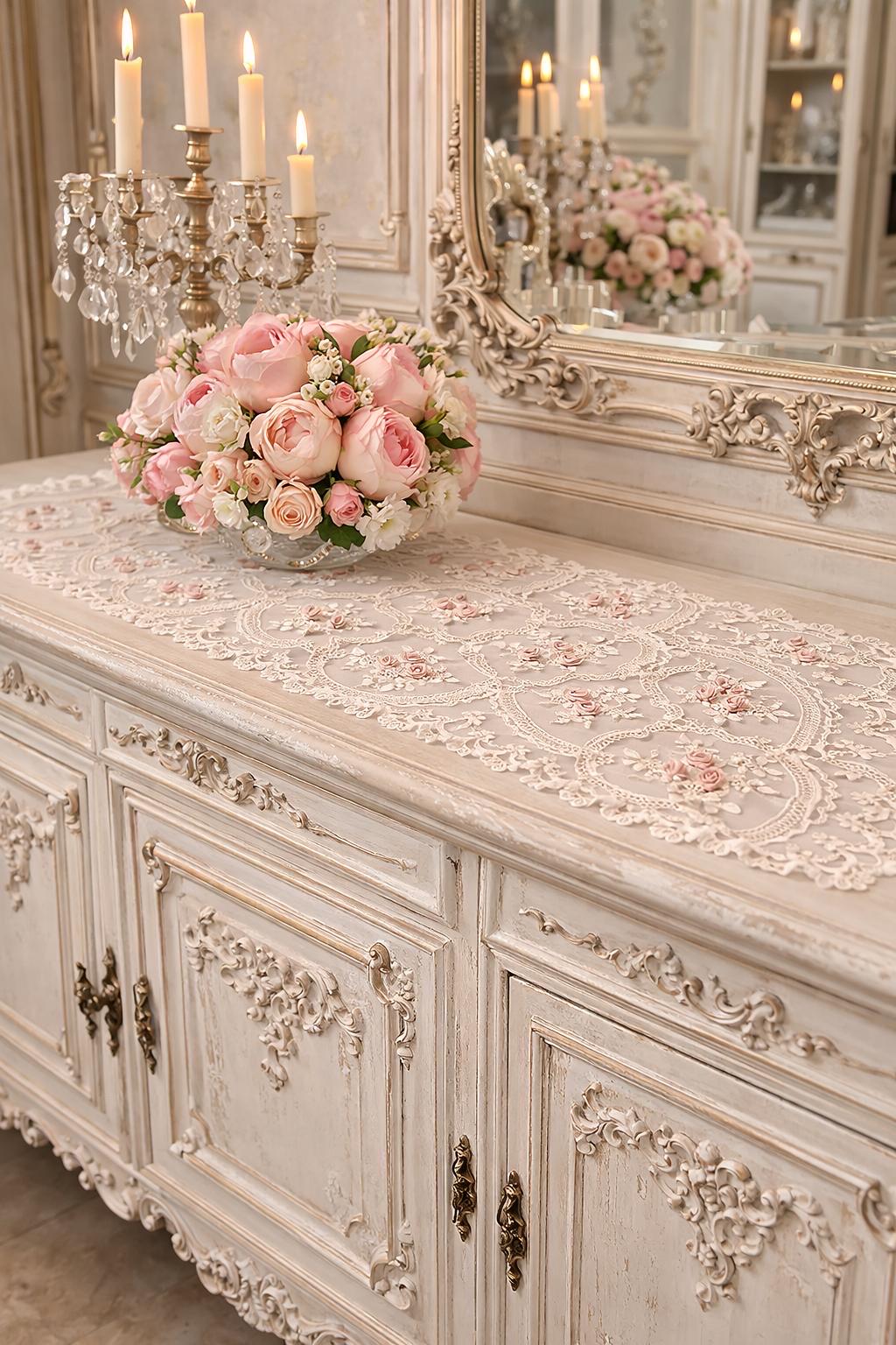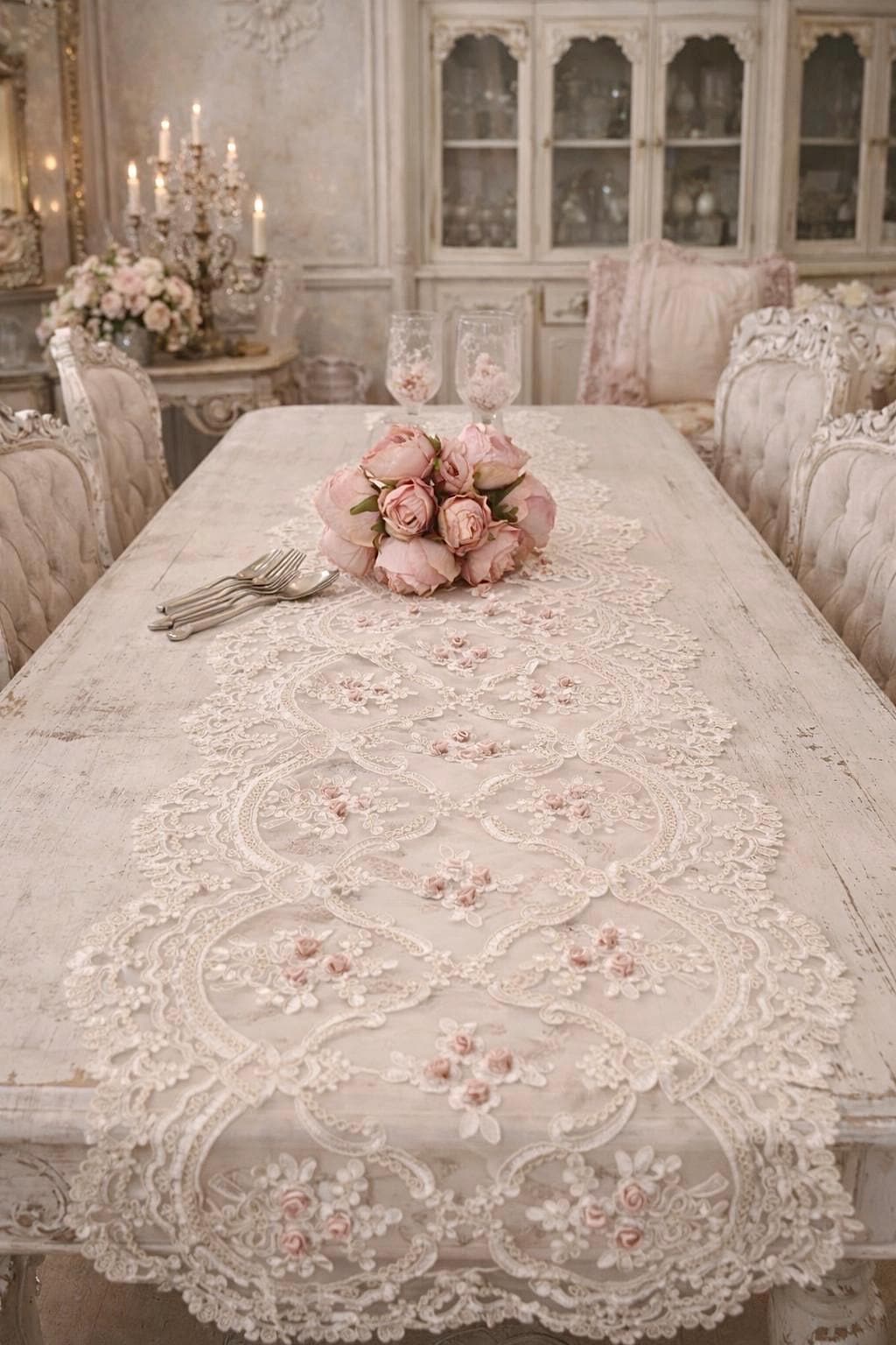 Wonderful runner in rebrodè lace and embossed roses. Handmade in our tailoring workshops, in width 38 cm (14.96 inches), in different length sizes that can be purchased individually or you can purchase the trio consisting of 2 of 38x38 cm and 1 of 38x60. Or purchase them individually.