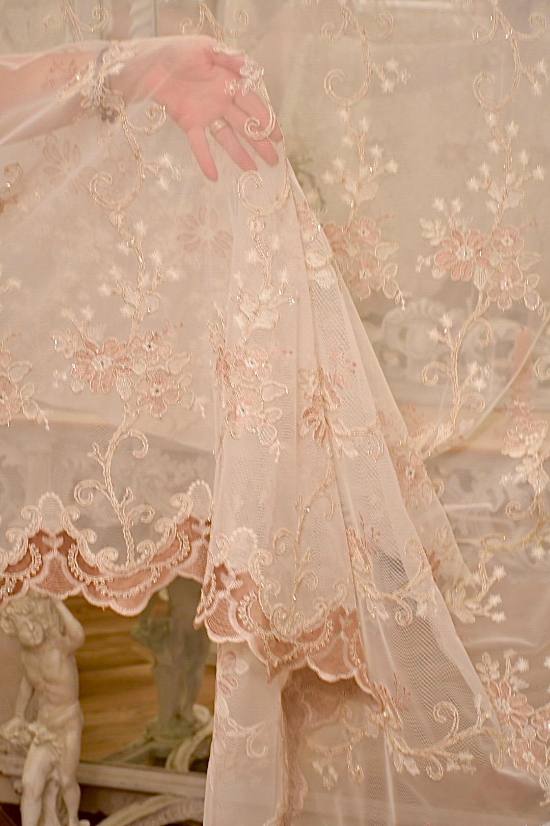 This stunning, almost floor-to-ceiling embroidered tulle is perfect for creating elegant, high-quality curtains. The fabric features a delicate floral embroidery pattern in shades of cream and pale pink, enhanced by sparkling details that catch the light and add a touch of glamour. The bottom edge is finished with a deeper pink velvet, creating a refined and sophisticated contrast.