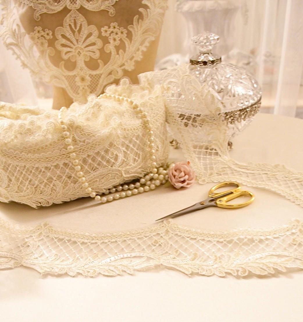 The beige color with subtle gold threads softly catches the light, giving the edge a subtle sheen that makes it perfect for those who appreciate precious yet discreet details. This edge is the very essence of romance and class, ready to enrich any project with timeless elegance.