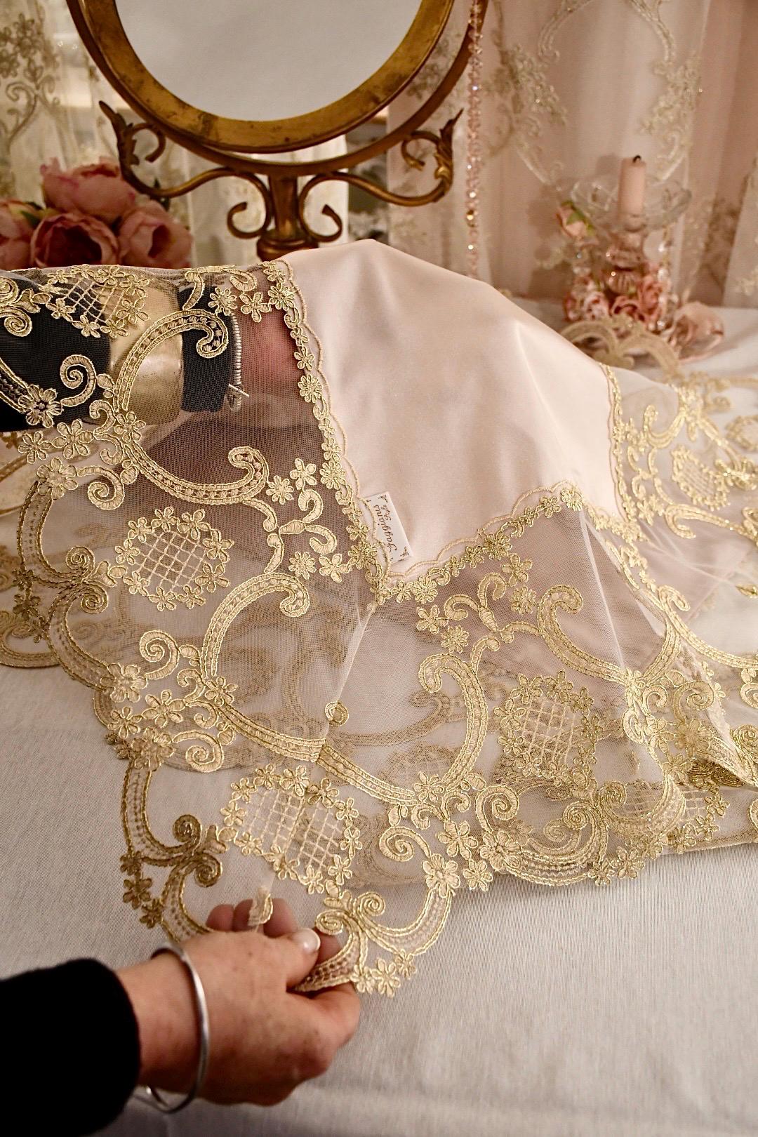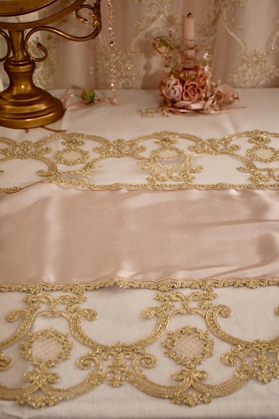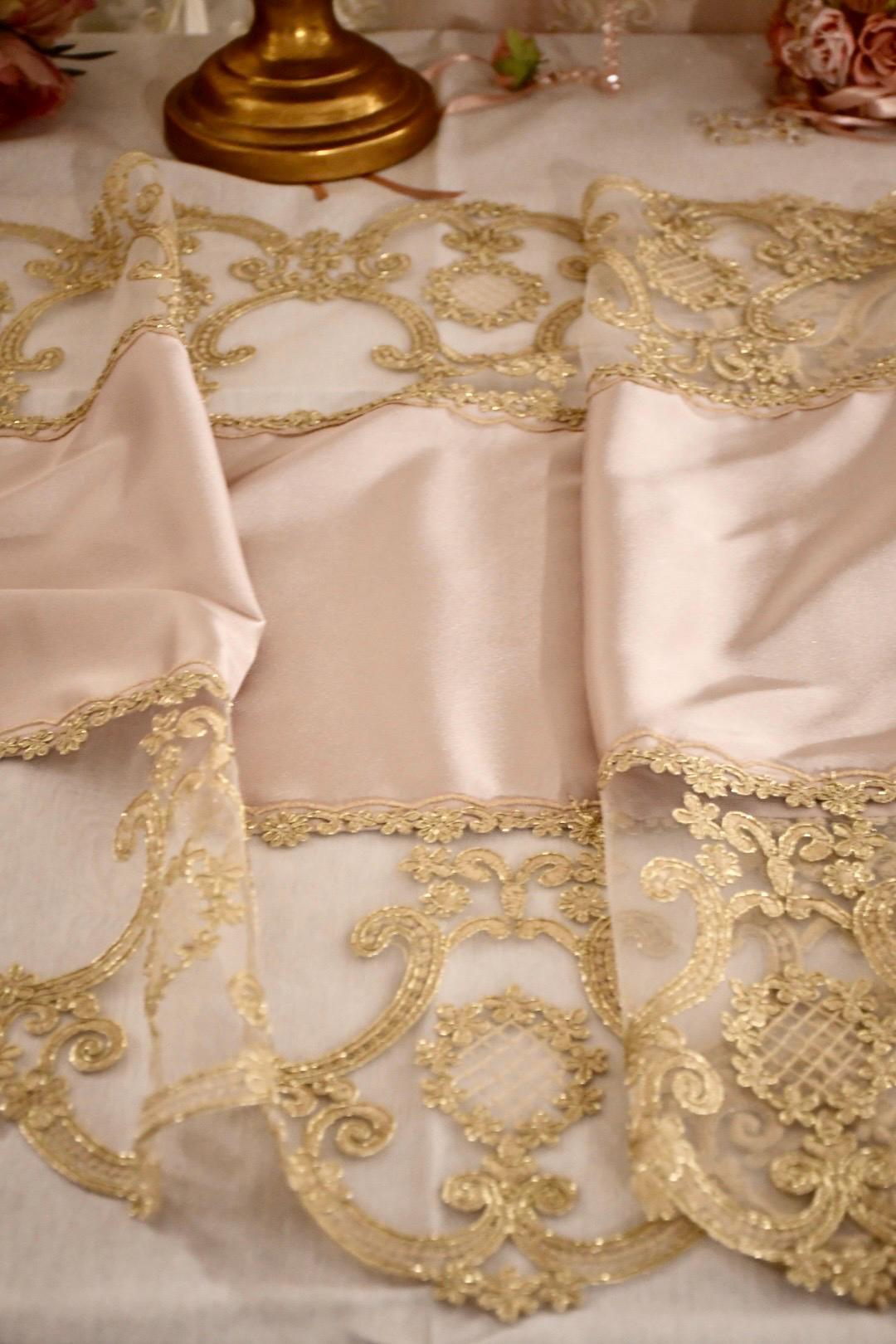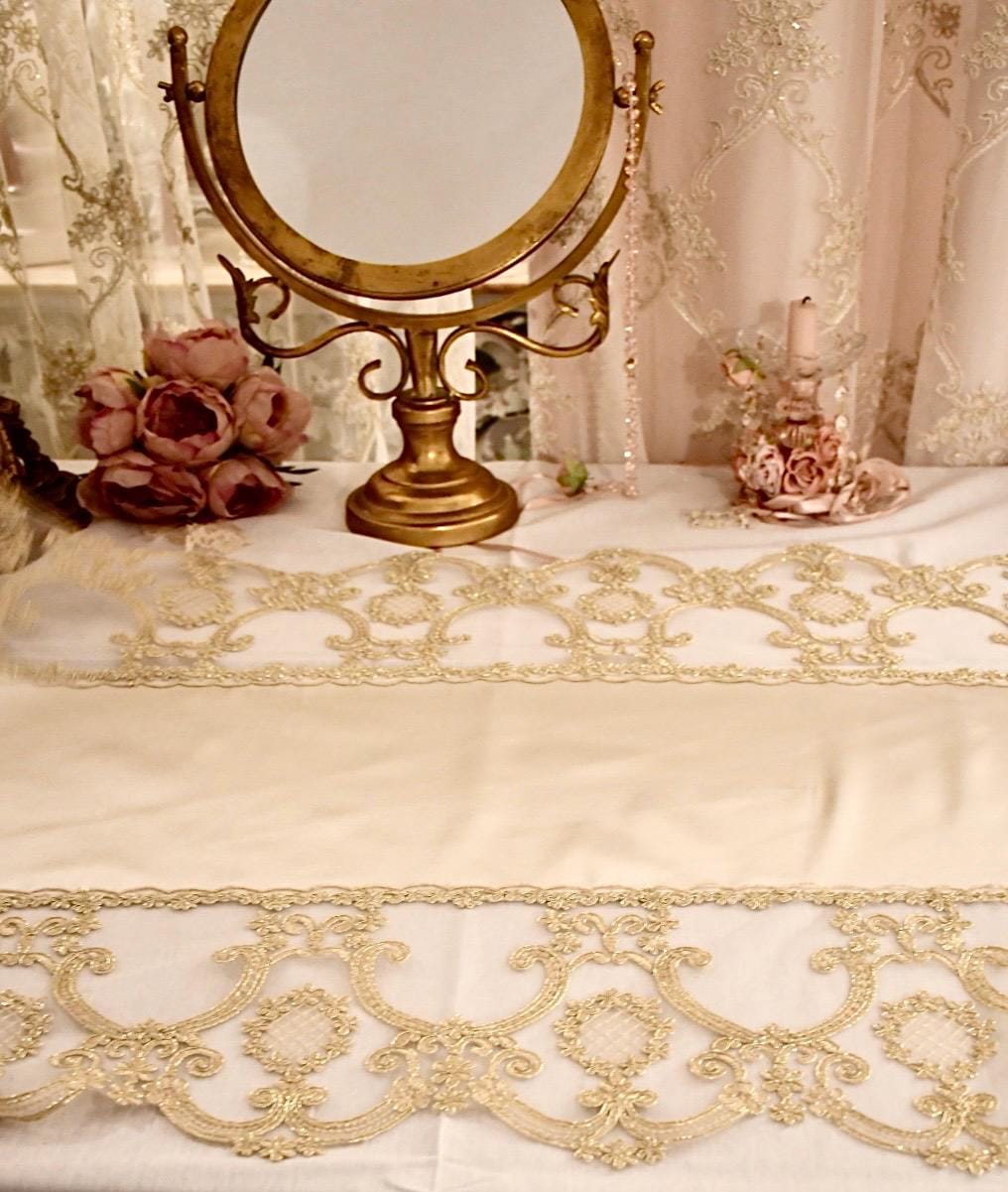 This silk table runner, available in three colorways and featuring gold Renaissance lace, is a highly prized piece of craftsmanship, handcrafted in our workshops. It's ideal for adding a touch of luxury and warmth to any space. The combination of silk and delicate gold Renaissance-style lace creates a captivating contrast, making it perfect for special occasions and Christmas decorations.