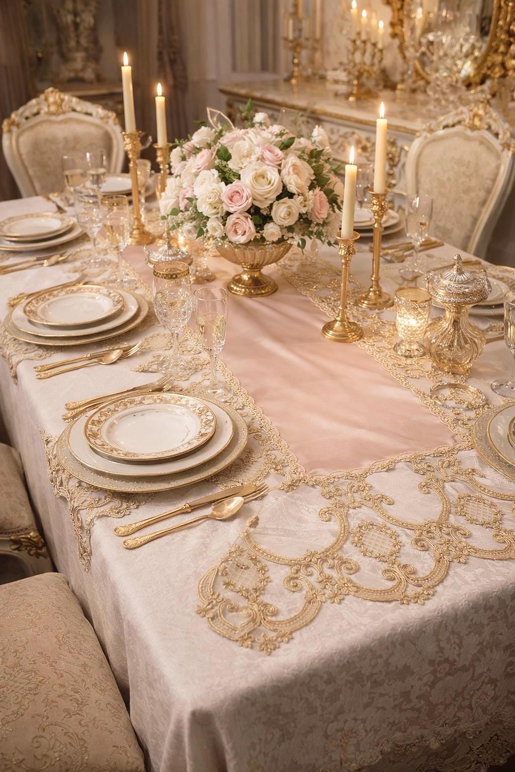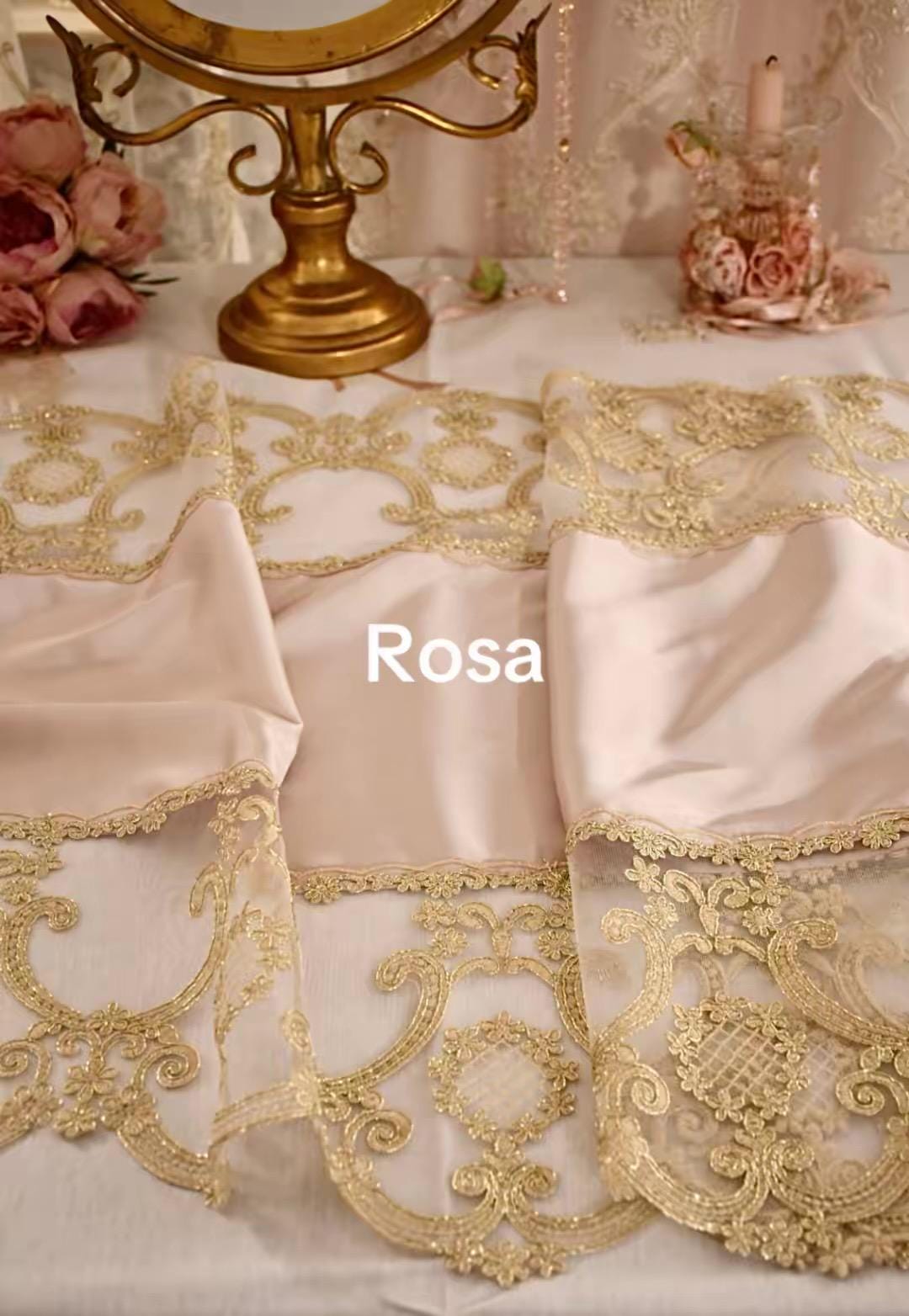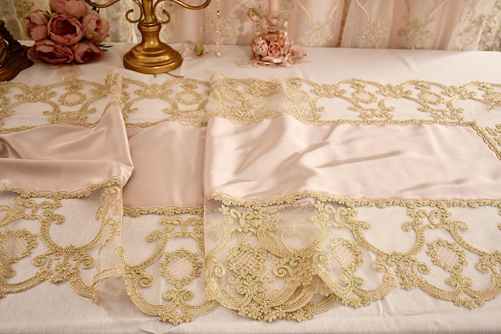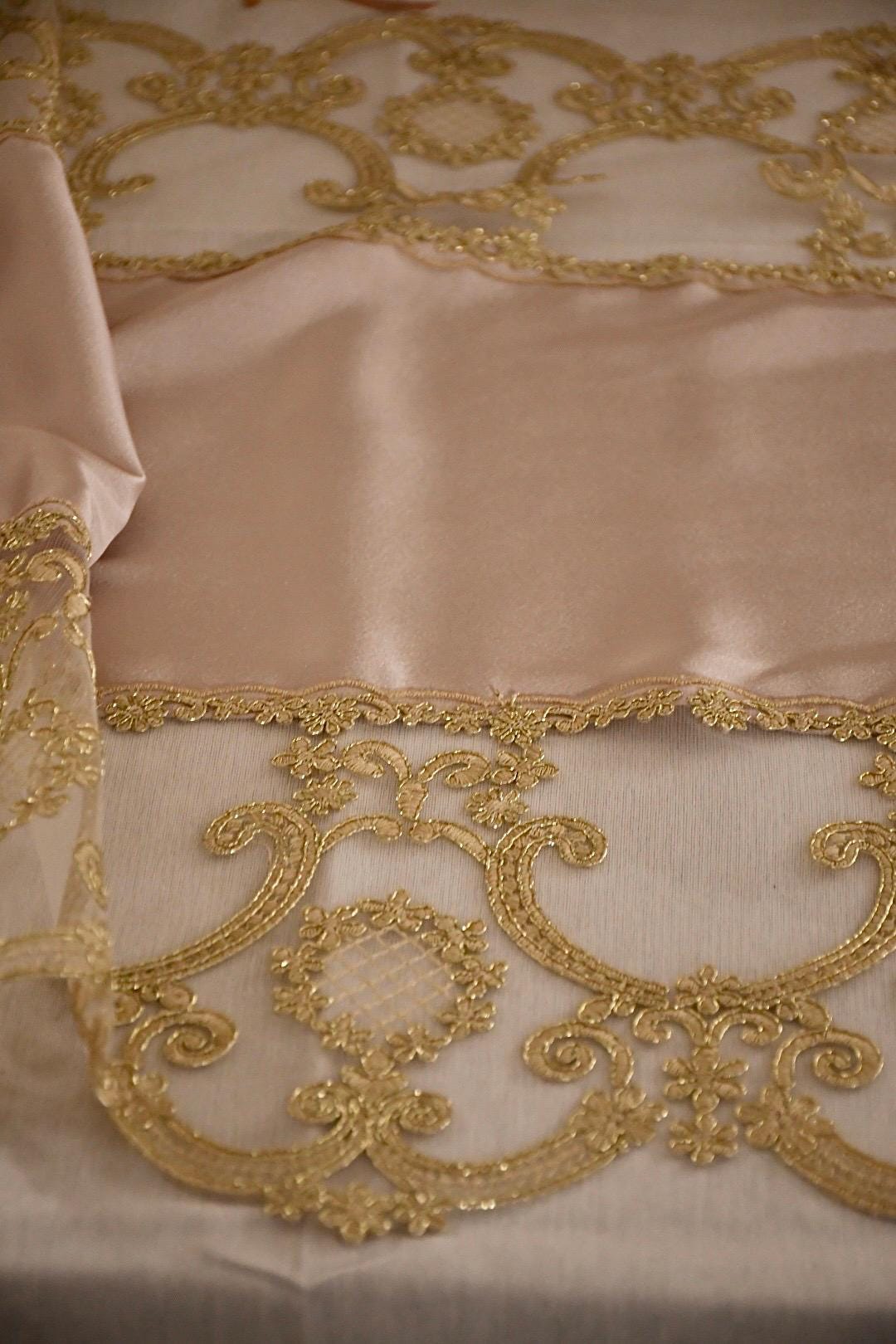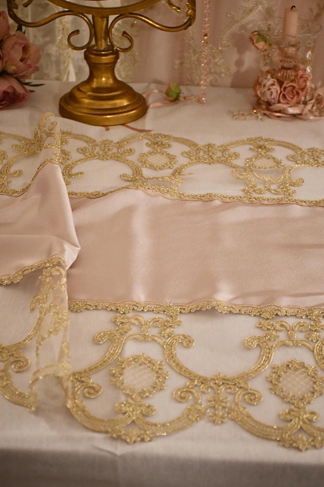 This silk table runner, available in three colorways and featuring gold Renaissance lace, is a highly prized piece of craftsmanship, handcrafted in our workshops. It's ideal for adding a touch of luxury and warmth to any space. The combination of silk and delicate gold Renaissance-style lace creates a captivating contrast, making it perfect for special occasions and Christmas decorations.