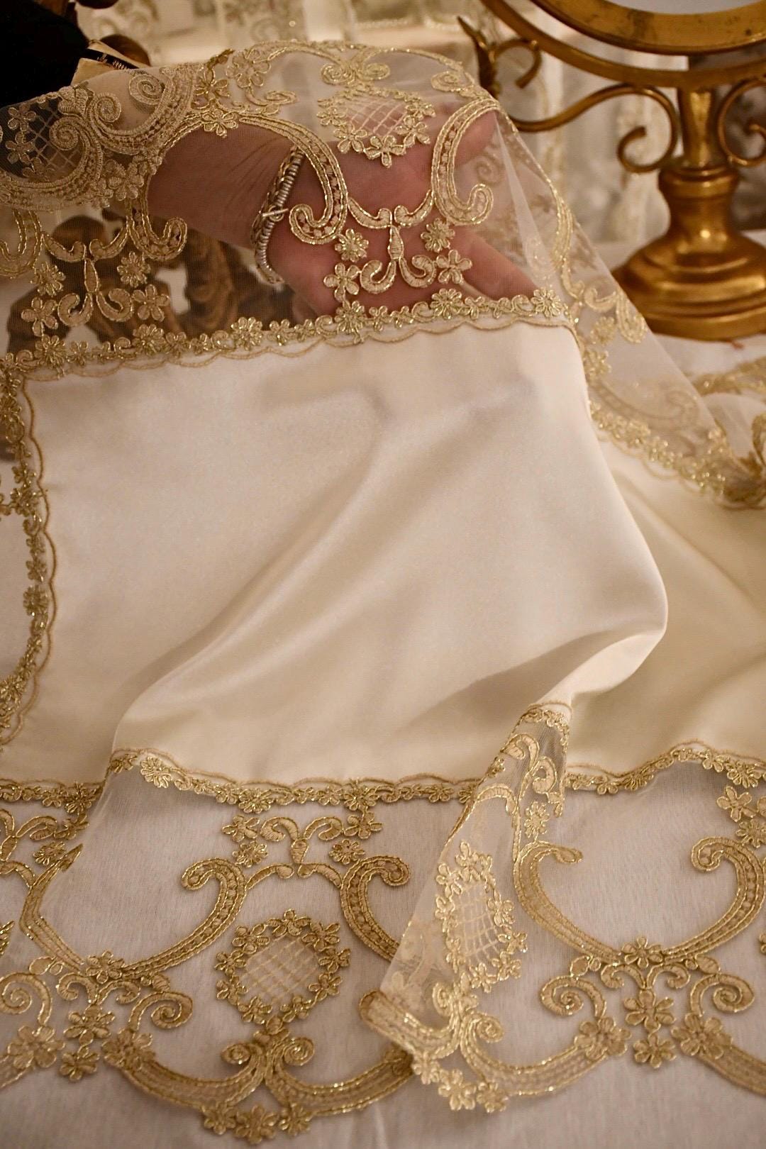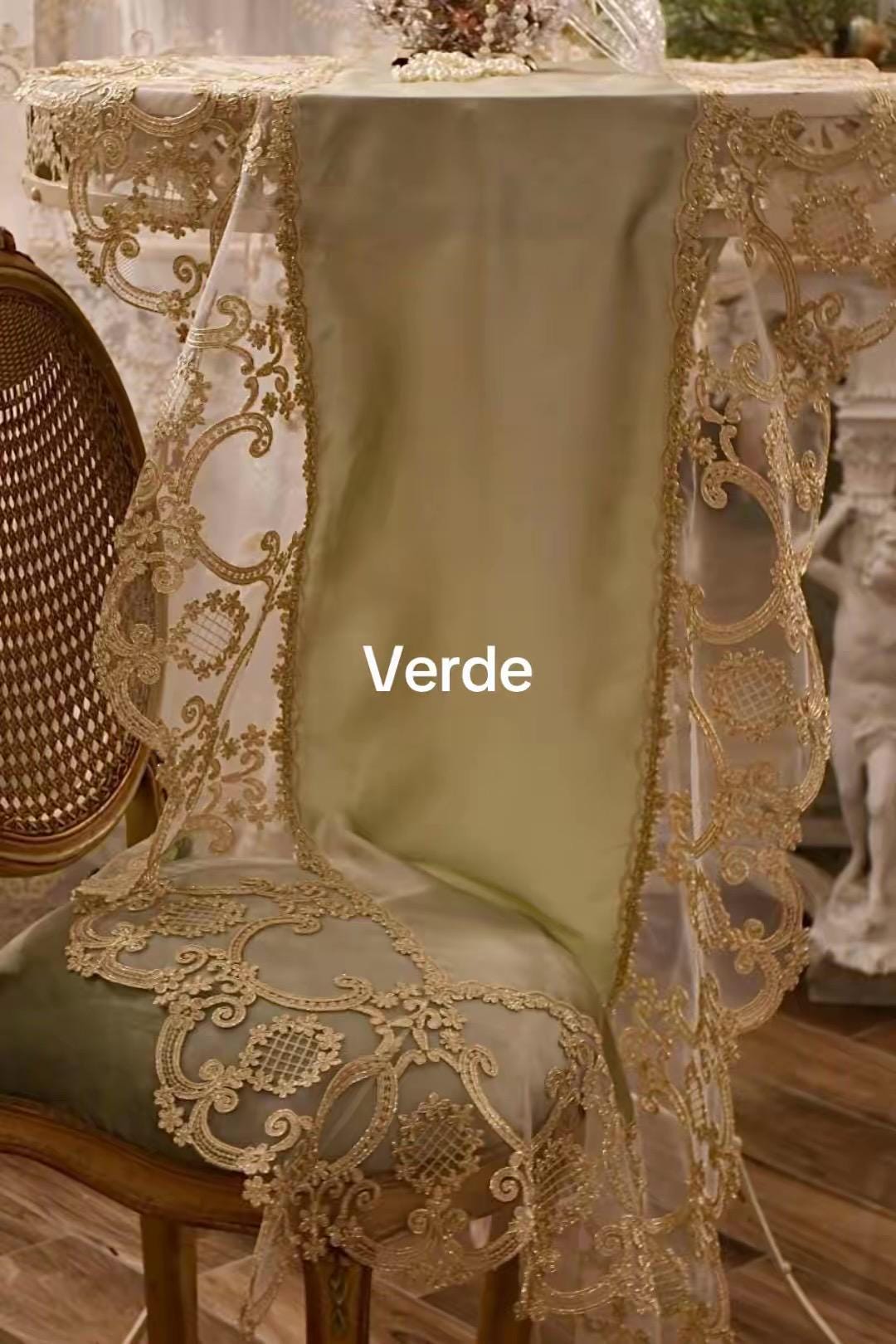 The lace, featuring intricate Renaissance-inspired patterns, is composed of elegant arabesques and small floral details that unfold on a transparent base, creating a play of light and shadow. The sinuous lines and classic shapes recall the beauty of ancient decorations, while the golden hue of the lace pairs perfectly with the green satin silk background, lending a regal and refined look. Every detail is meticulously crafted, showcasing the quality of the materials and the craftsmanship.