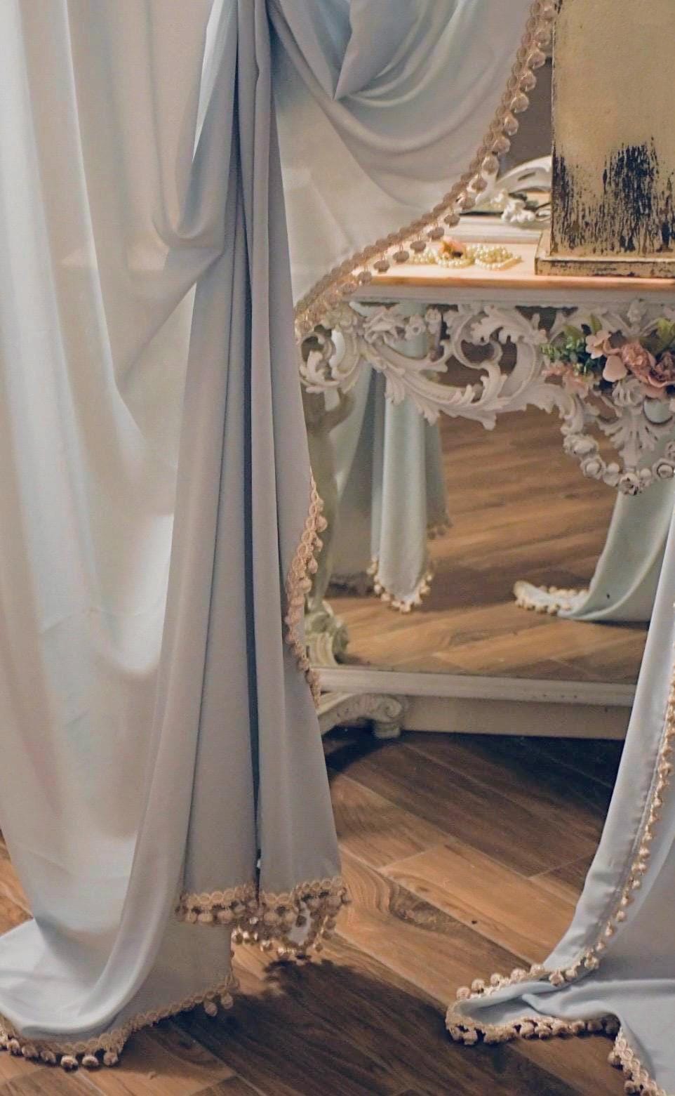 Light as a breath of wind, refined like a high-end tailoring piece, these pure Italian georgette curtains in a refined powder blue are the epitome of delicacy and elegance. Crafted from a sheer yet enveloping pure blue fabric, they are embellished with a fine natural-colored trimming, enhancing their sophistication with a sophisticated and timeless contrast.