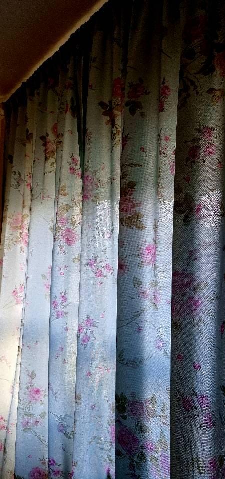 Bring the delicate charm of French romanticism into your home with this elegant curtain in pure shabby chic style. Featuring a light blue background, the curtain is embellished with a refined floral motif featuring small pink flowers and sage green branches that delicately intertwine across the fabric, giving the room a soft, poetic, and luminous atmosphere.