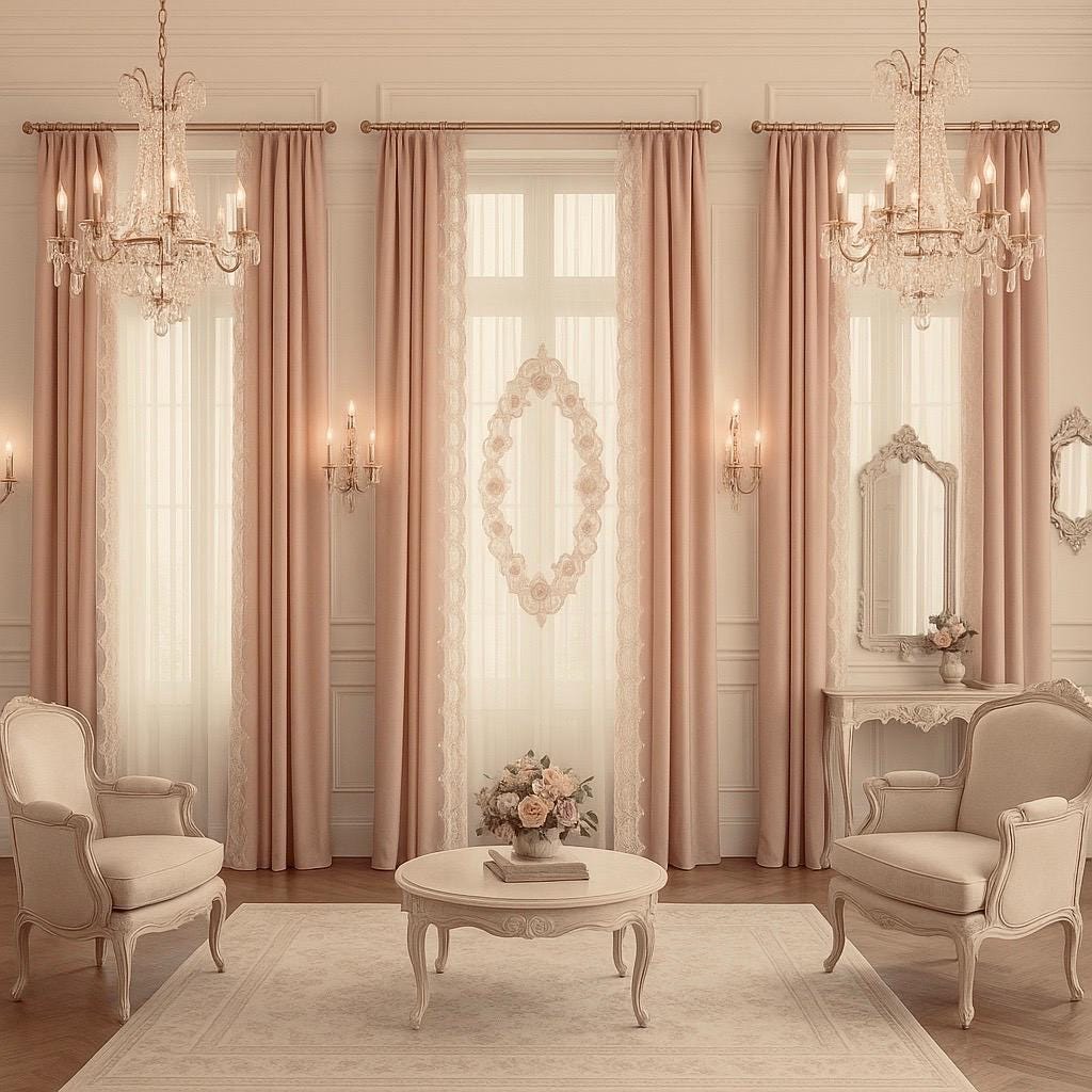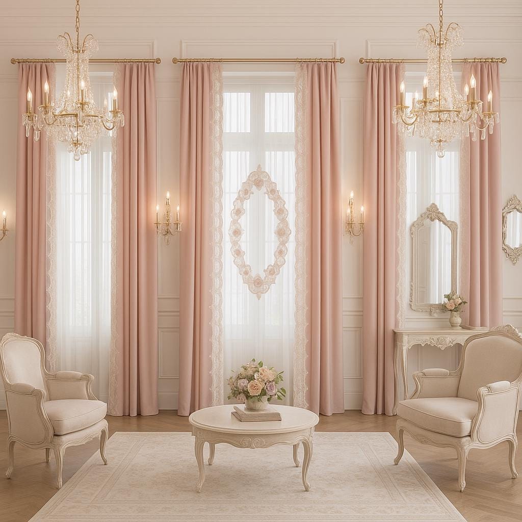 Bring elegance and delicacy to your home with this exclusive handcrafted curtain set, composed of three coordinating panels: two in antique pink georgette and one in embroidered tulle, perfect for rooms with a charming, classic or romantic style.