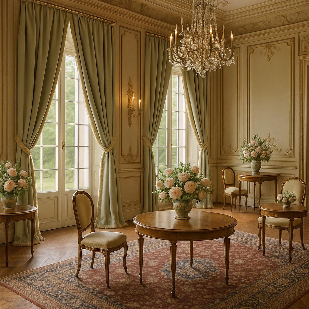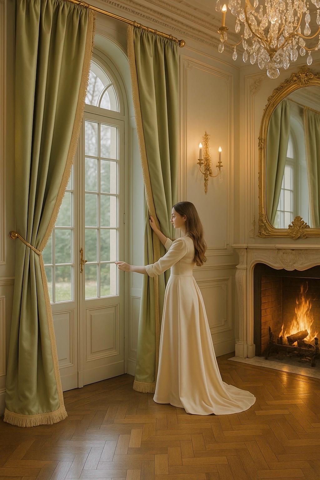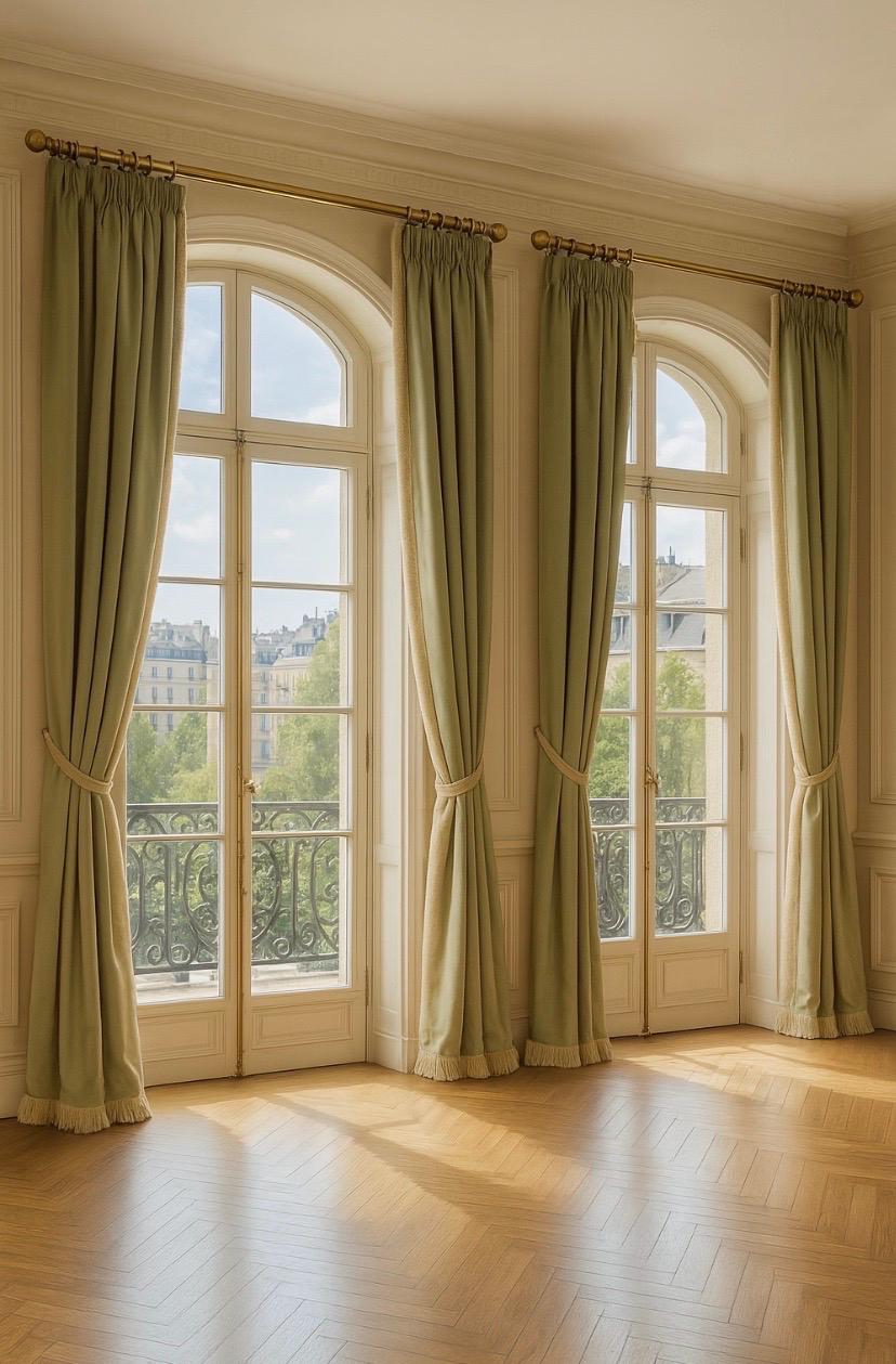 Sold as a pair (order one and receive two panels), these curtains are made from a rich, opaque, high-quality satin fabric, perfect for classic, romantic, or château-style settings. The color is a refined, light sage green, extremely luminous yet understated, designed to elegantly complement sophisticated interiors.
