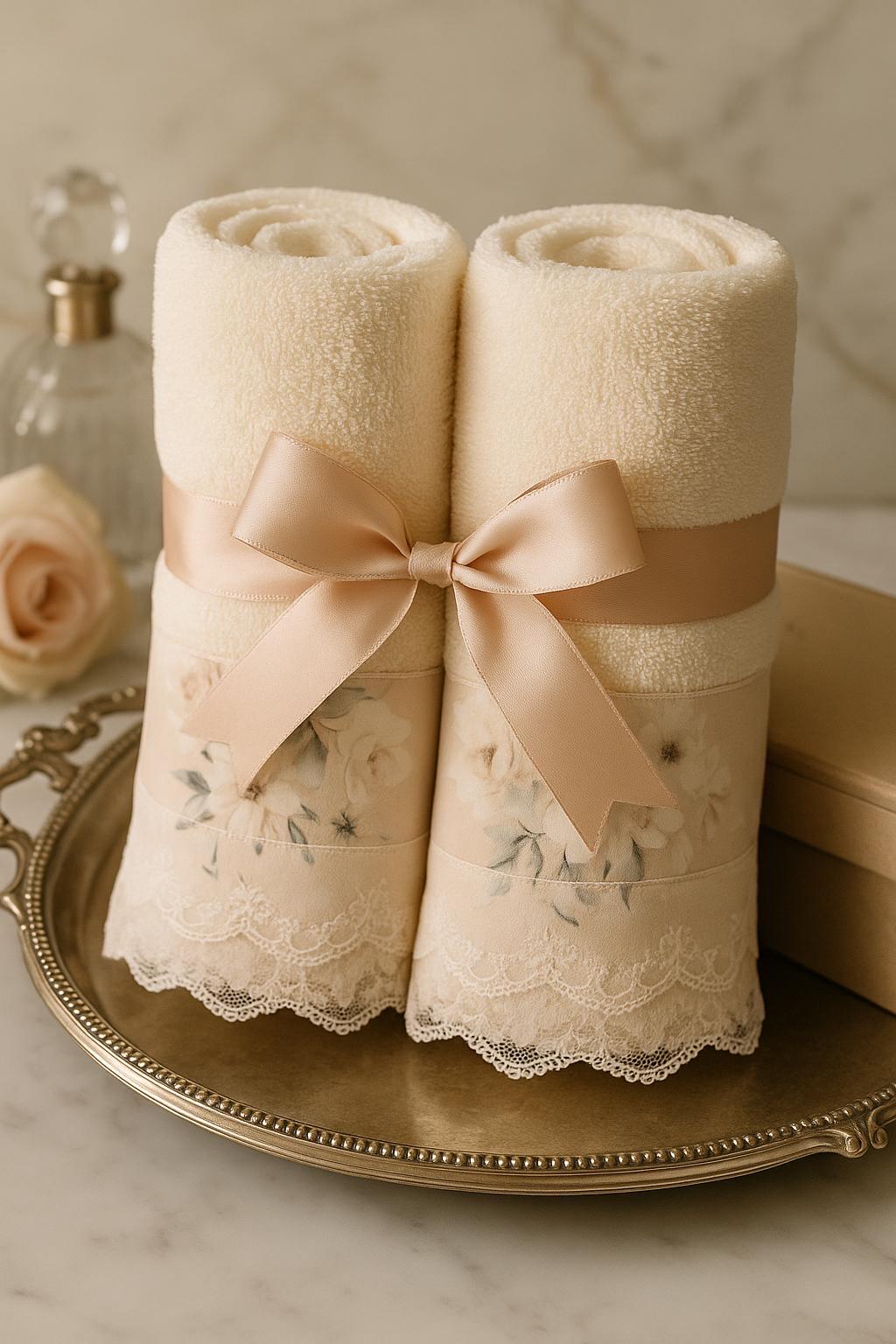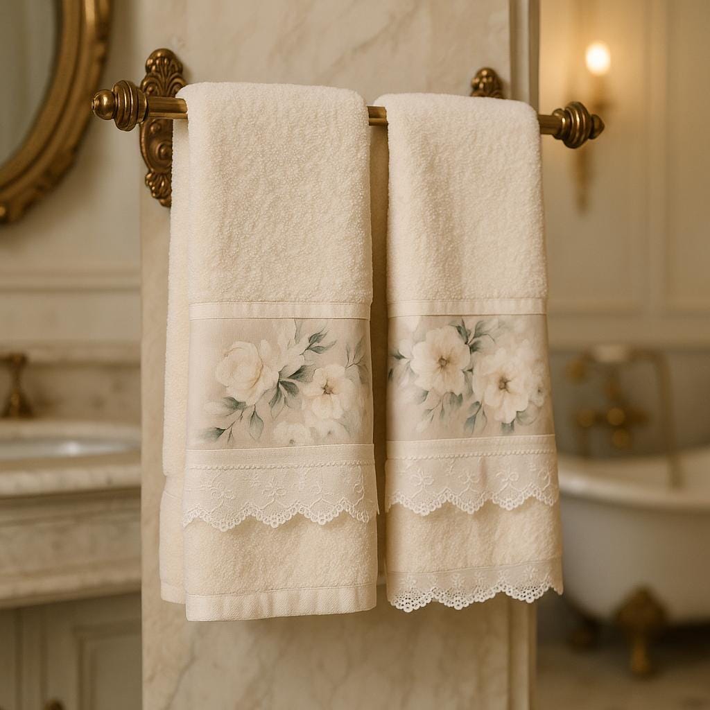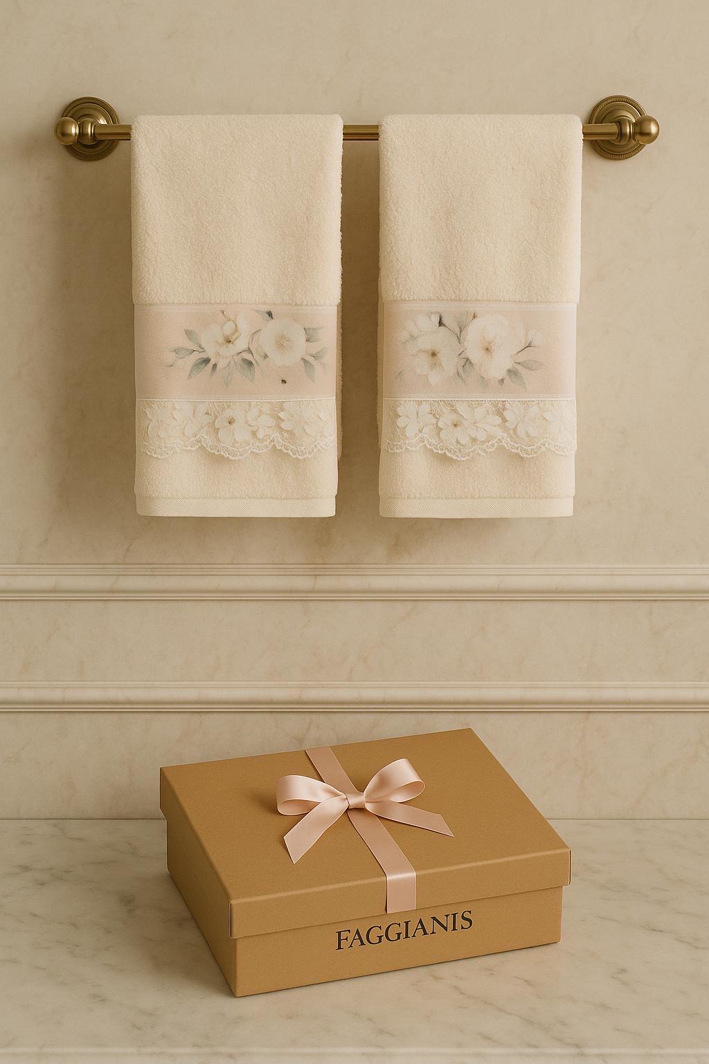 Elegant and refined set of two towels in soft sponge and rose-painted fabric. The set includes 1 towel measuring 100x54 cm (39.37” x 21.25”) and 1 measuring 58x40 cm (22.83” x 15.74”). Available in beige and white lace.