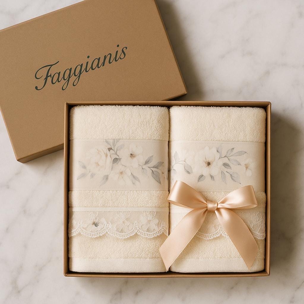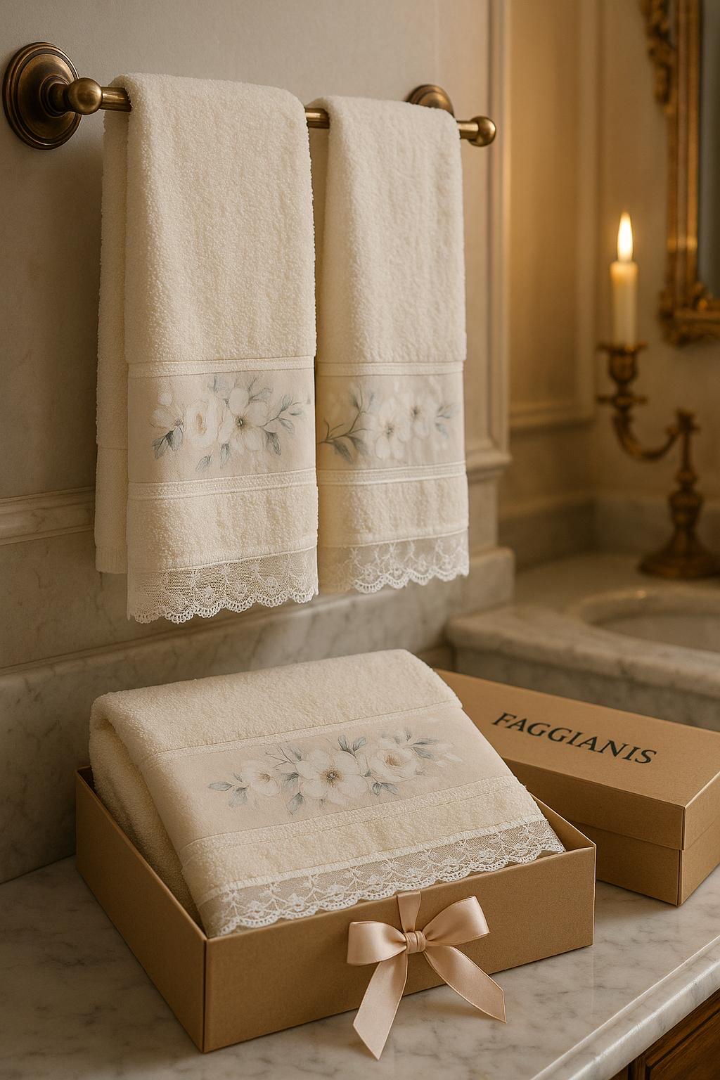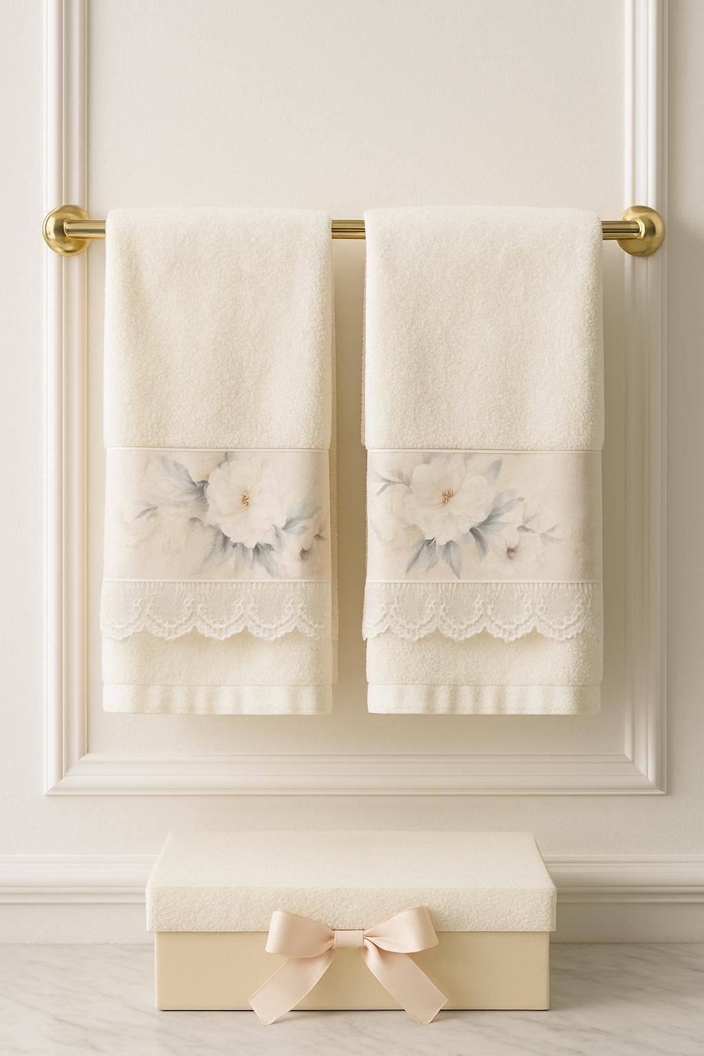 Elegant and refined set of two towels in soft sponge and rose-painted fabric. The set includes 1 towel measuring 100x54 cm (39.37” x 21.25”) and 1 measuring 58x40 cm (22.83” x 15.74”). Available in beige and white lace.