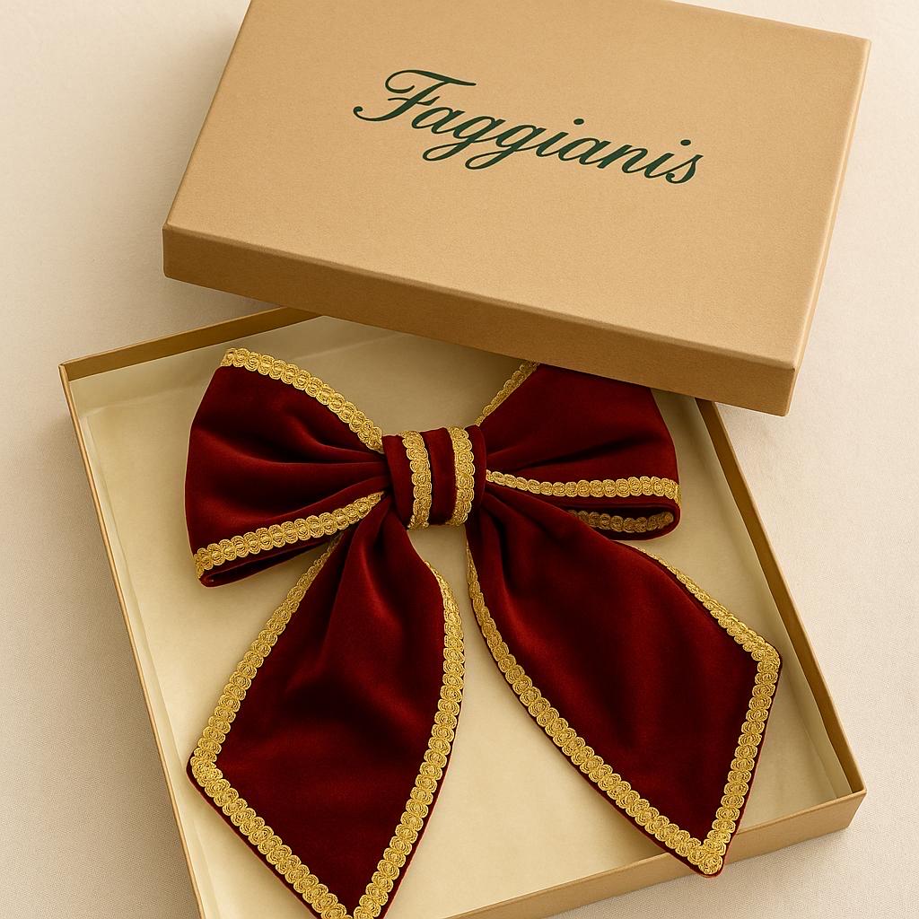 A refined symbol of elegance and tradition, entirely handmade in our Faggianis workshops. This Christmas bow is made of high-quality doubled burgundy velvet, embellished with a brilliant gold trim that defines its edges with light and richness.