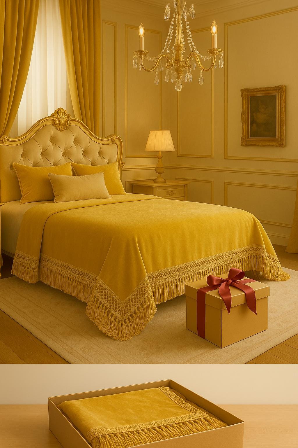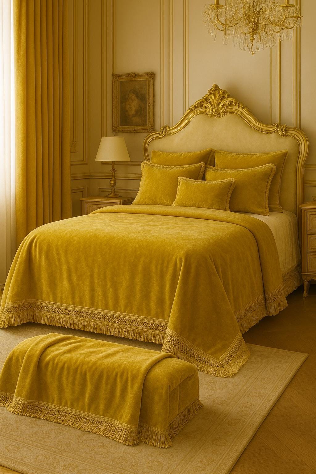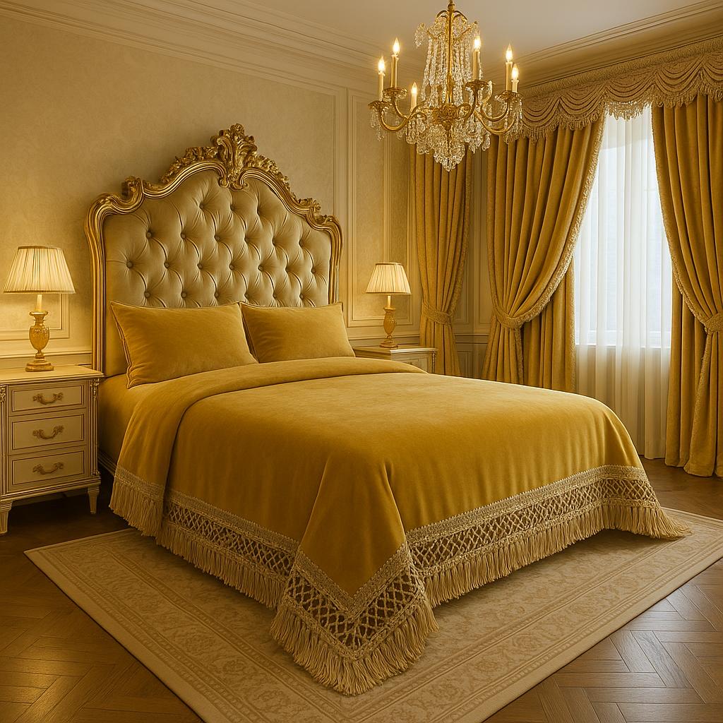 Perfectly coordinated with the matching decorative stole, or bed runner, made from the same double velvet with light-gold trim—ideal for placing at the foot of the bed or on an upholstered bench, as shown in the images.