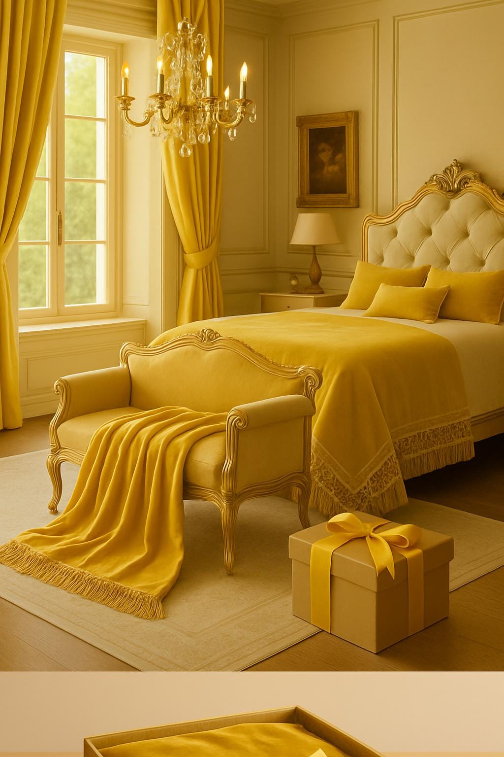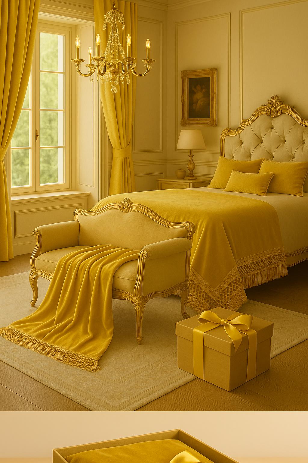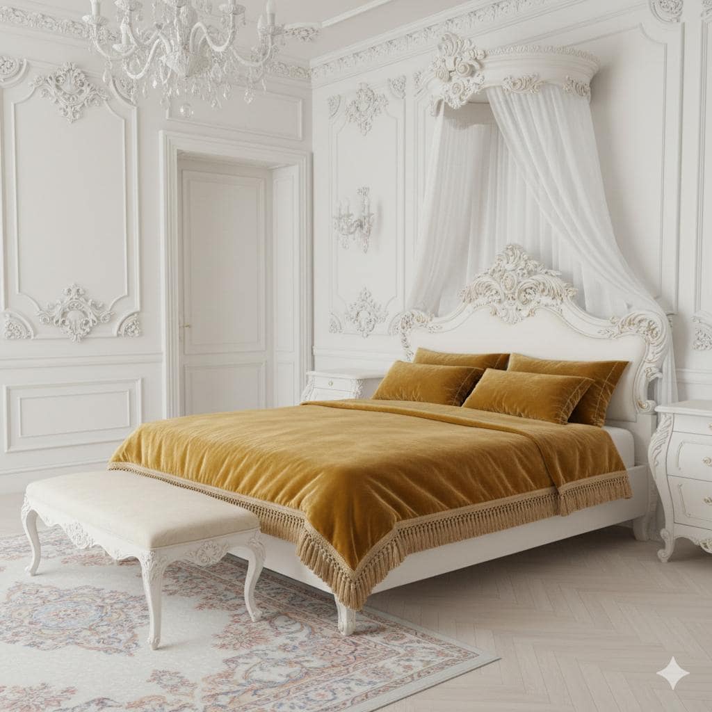 Perfectly coordinated with the matching decorative stole, or bed runner, made from the same double velvet with light-gold trim—ideal for placing at the foot of the bed or on an upholstered bench, as shown in the images.