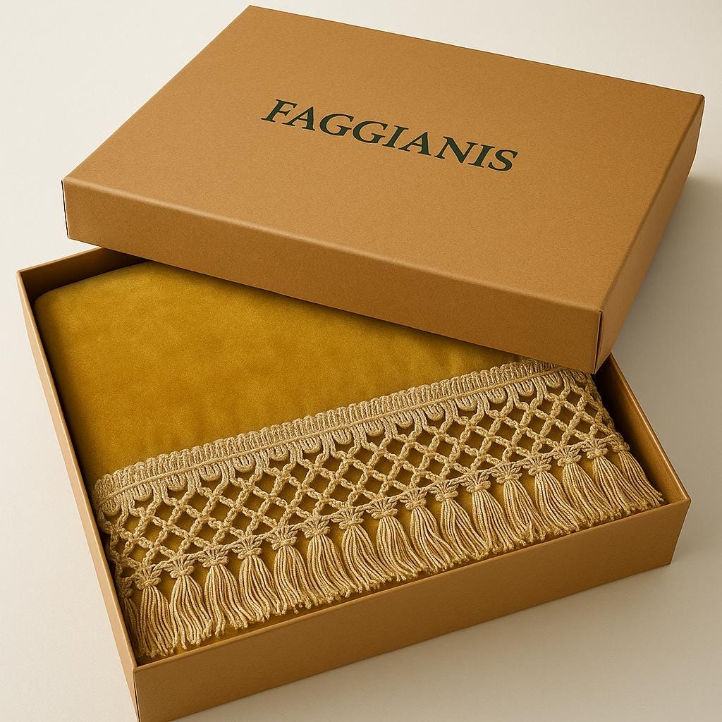 The light-gold trim applied along the entire perimeter, with its luminous fringes and warm reflections, enhances the antique, aristocratic style typical of Faggianis creations. Every detail is crafted with sartorial care, making this bedspread ideal for classic bedrooms and refined interiors.