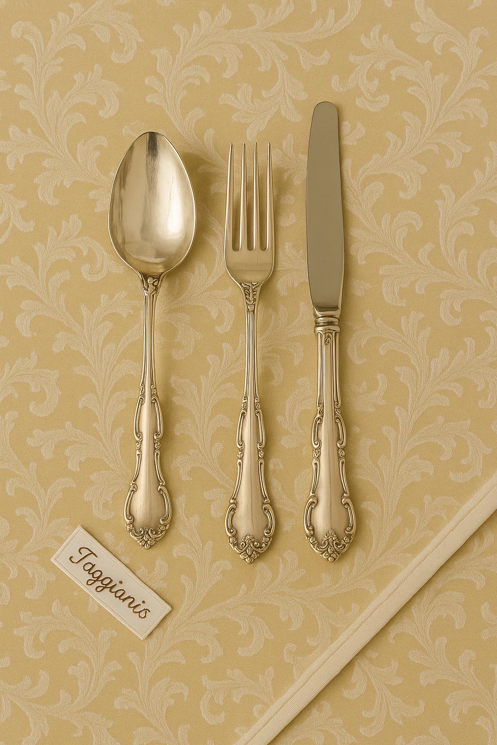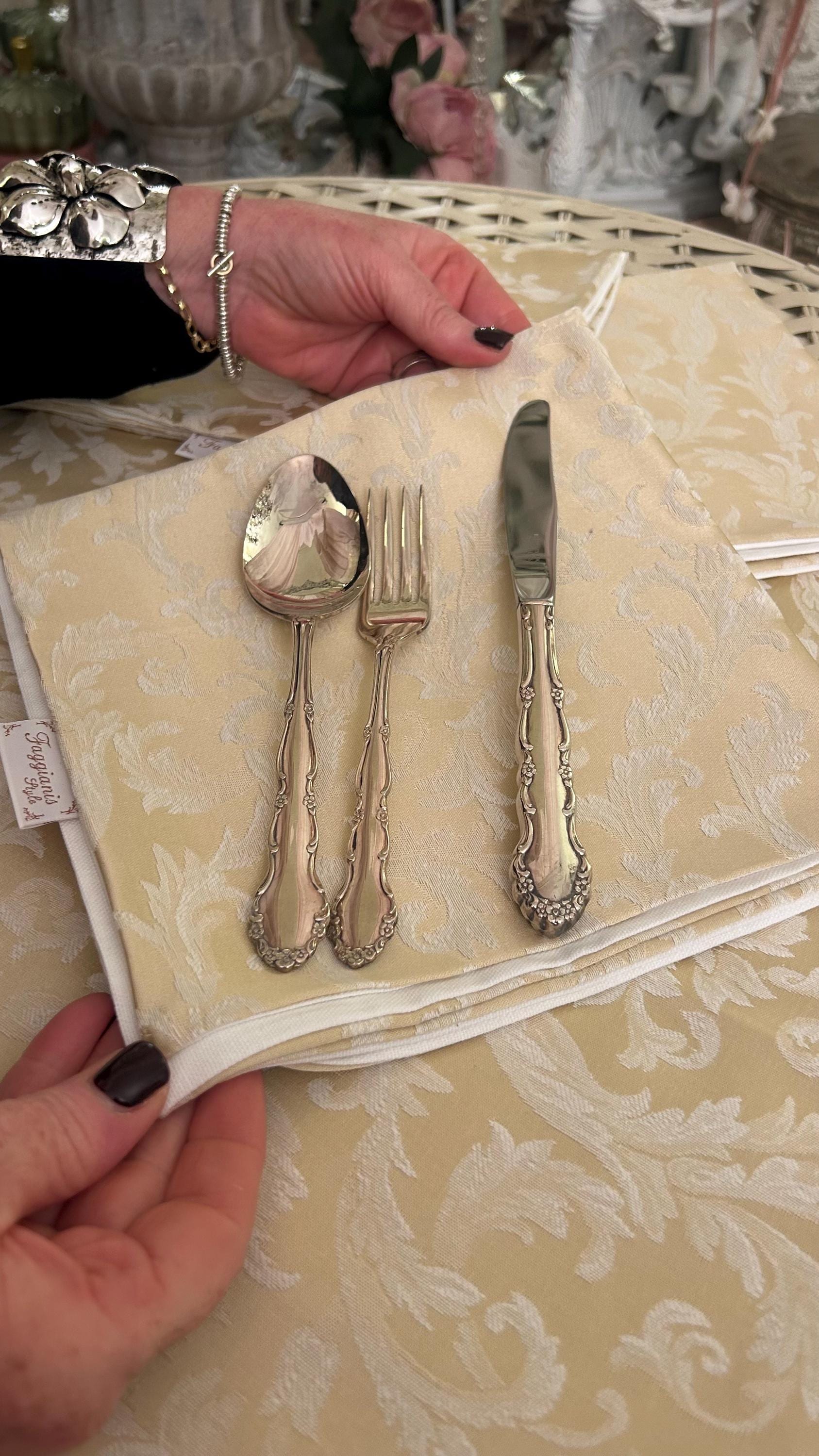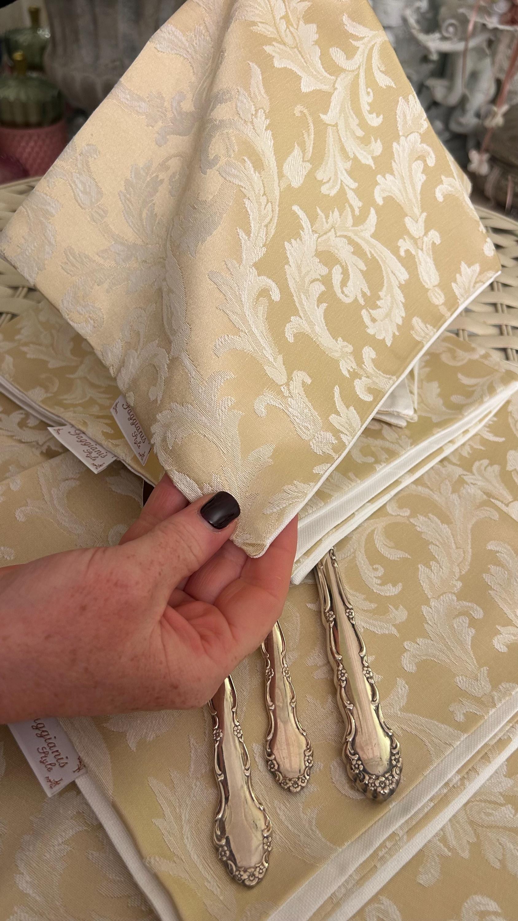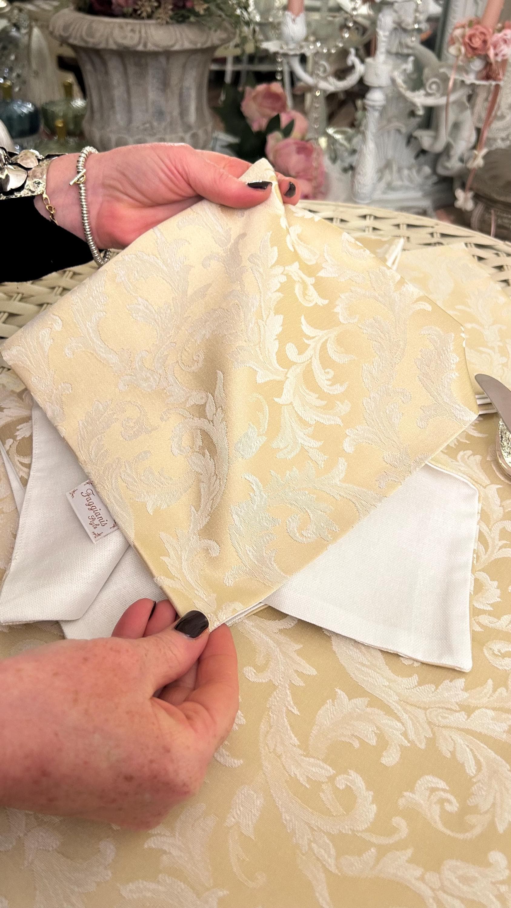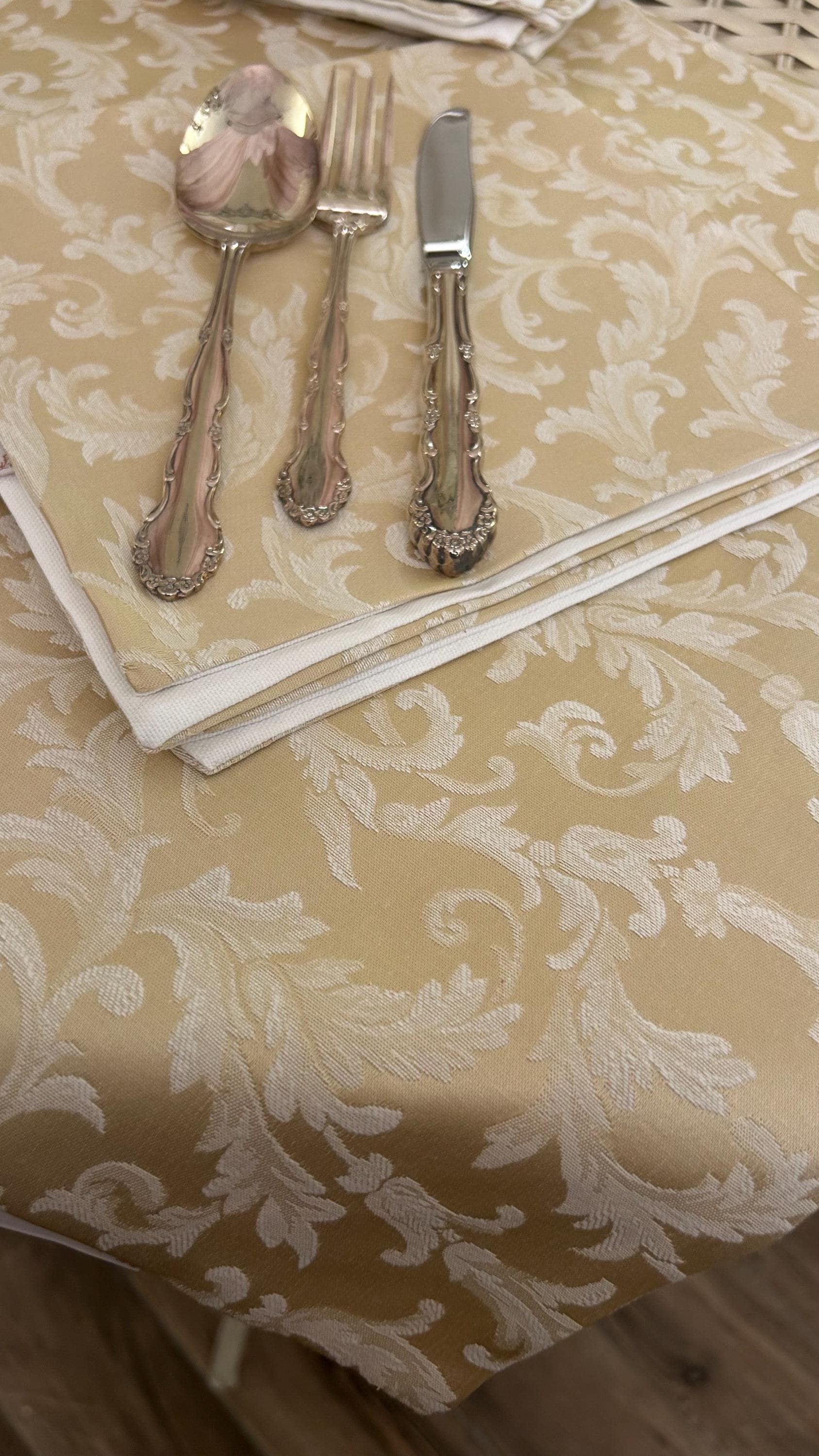 Discover the set of 4, 6, or 8 napkins, each measuring 46 x 46 cm (approximately 18 x 18 inches), which represent the height of elegance and good taste. These napkins are perfect for completing a refined table, harmoniously matching the tablecloth from the same collection. Crafted from Beige/Gold damask satin on one side and delicately textured linen on the other, they offer a perfect combination of luxury and functionality.