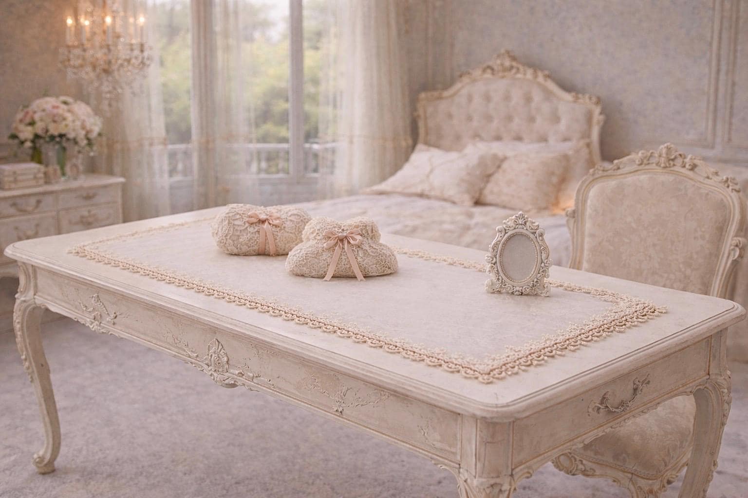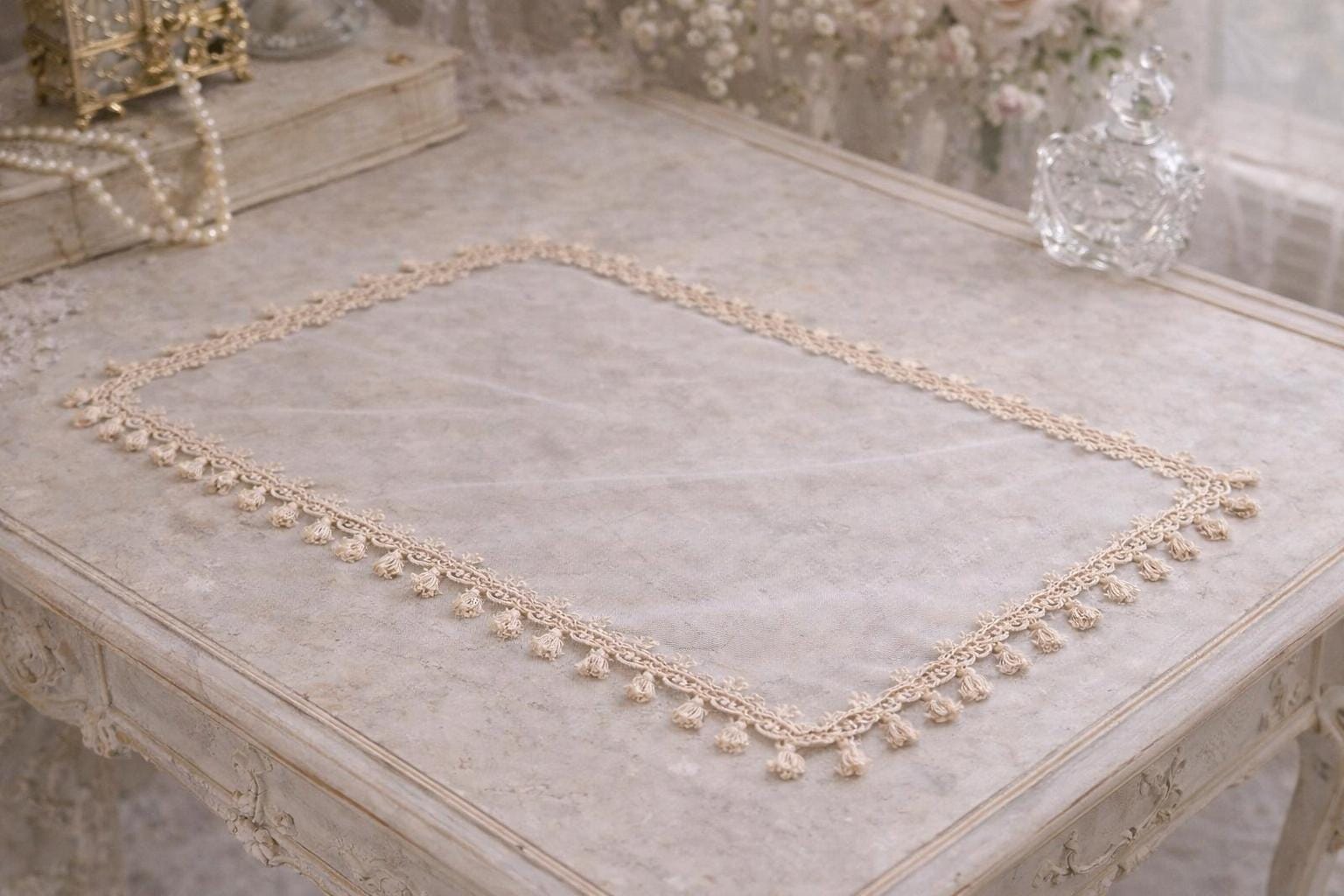 • Rectangular sheer tulle runners, available in multiple sizes, entirely bordered with the same precious trimming.