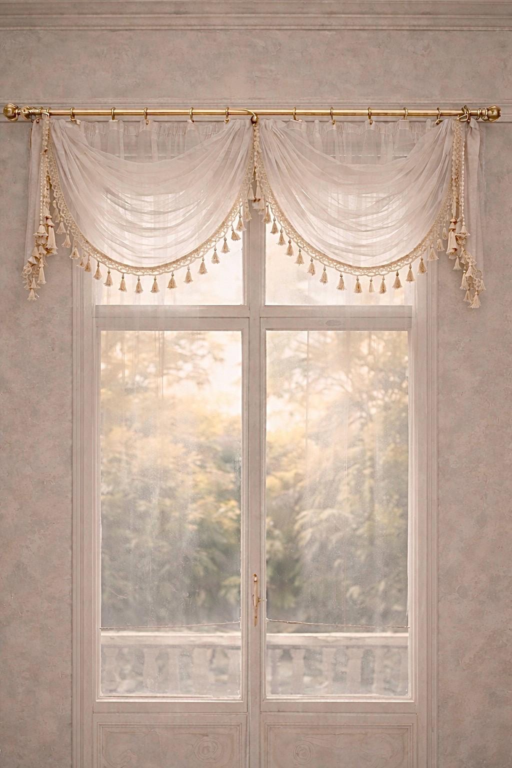 • Matching valance in sheer tulle, made to measure according to the length of the curtain rod (for example: a 150 cm rod requires a 150 cm valance; a 200 cm rod requires a 200 cm valance). The valance is also equipped with a hook tape for easy installation on tracks or rings.