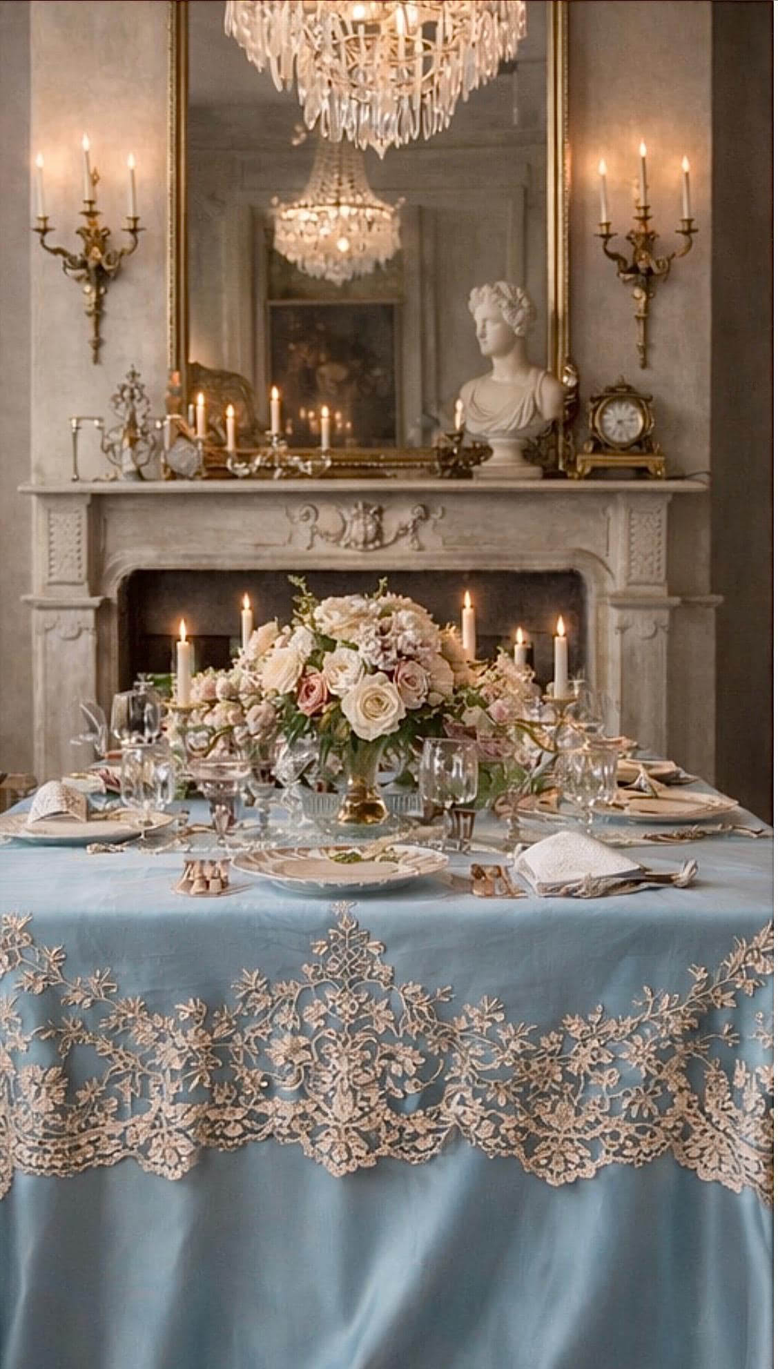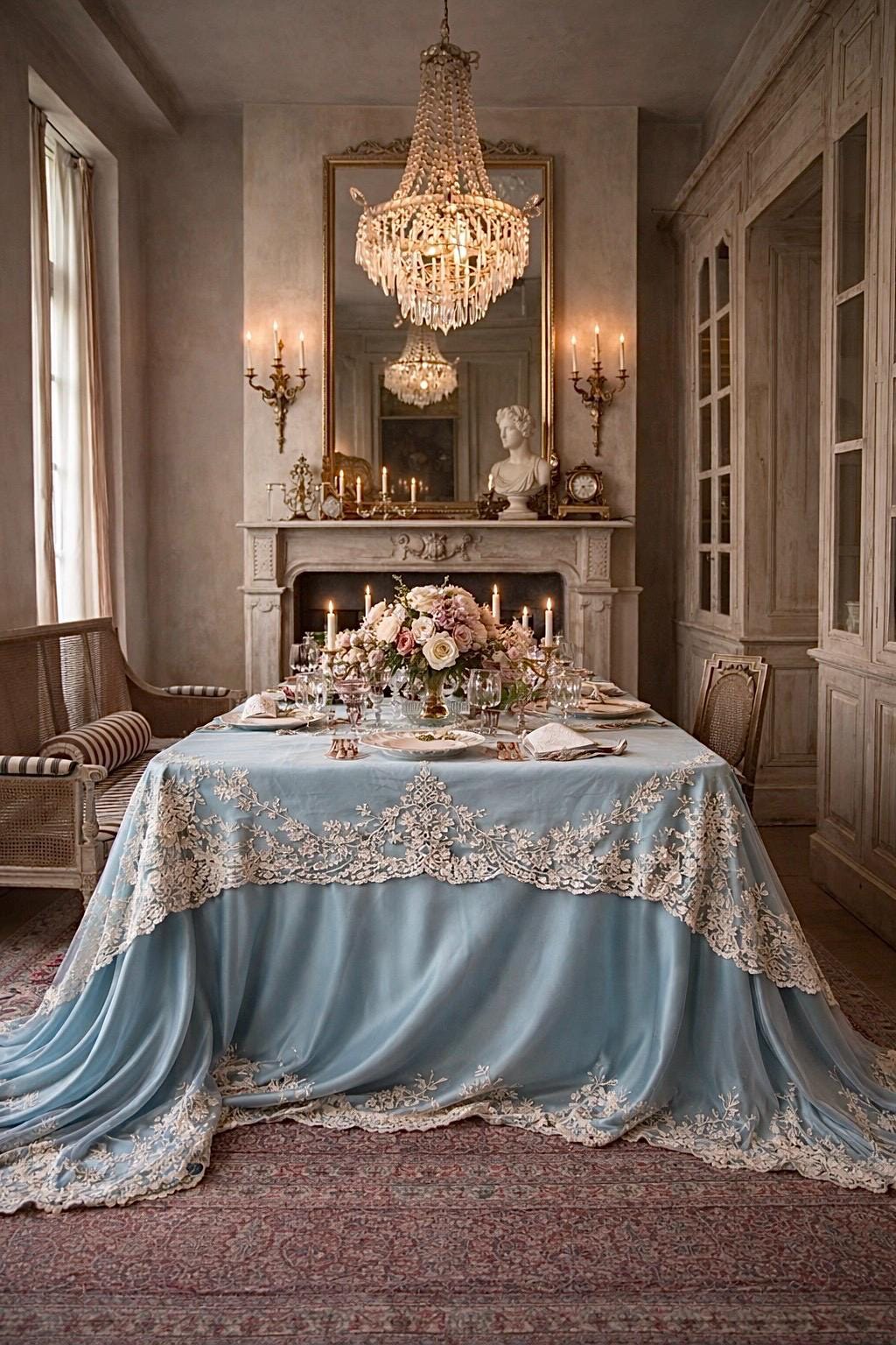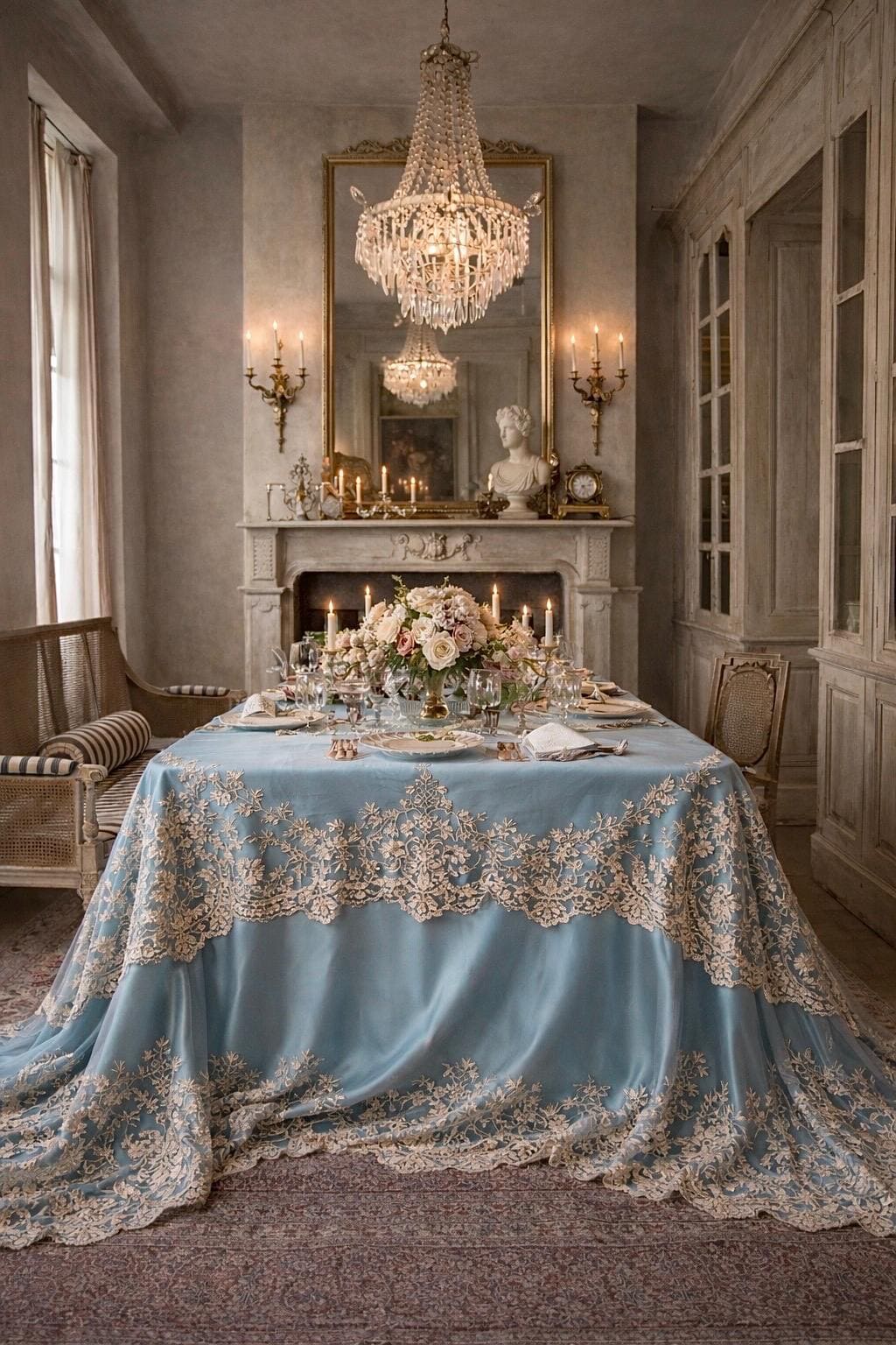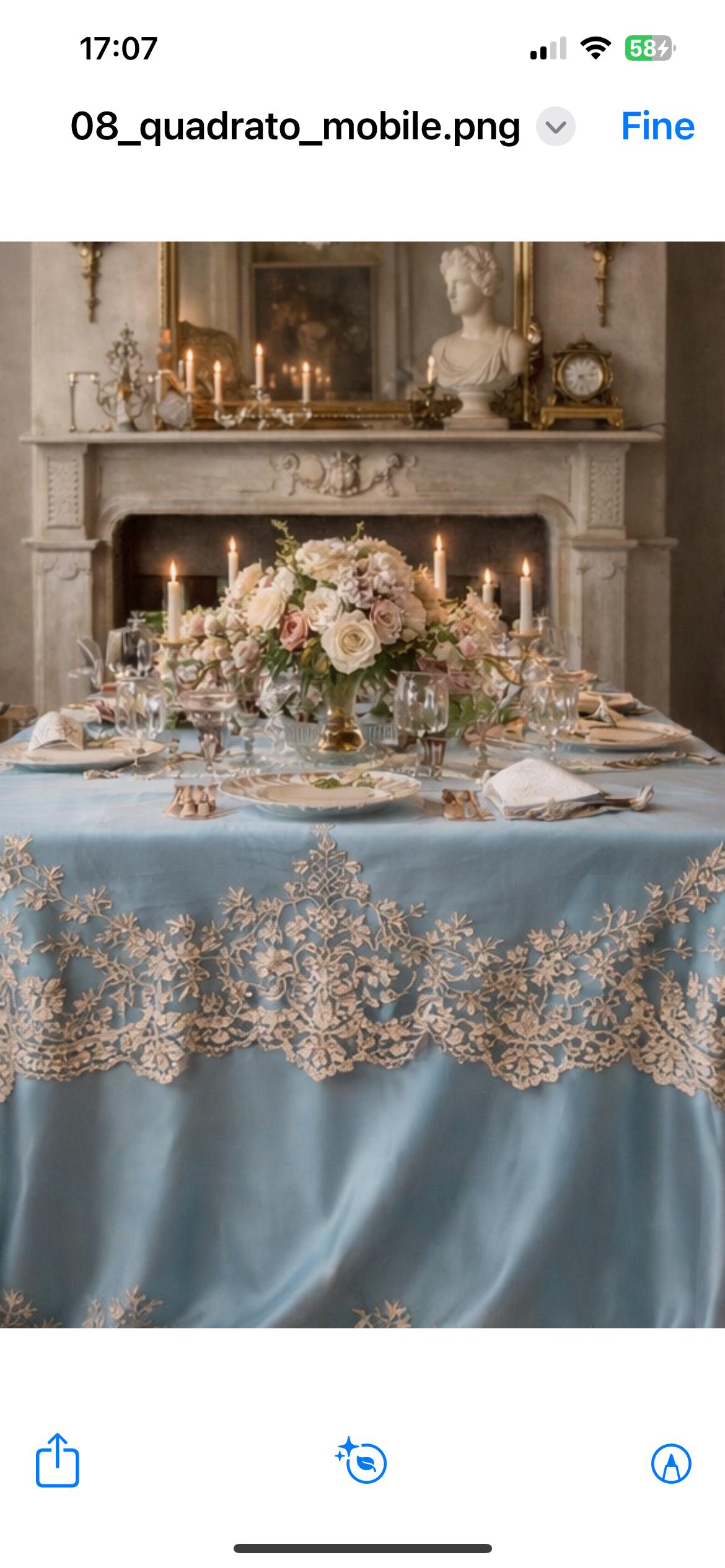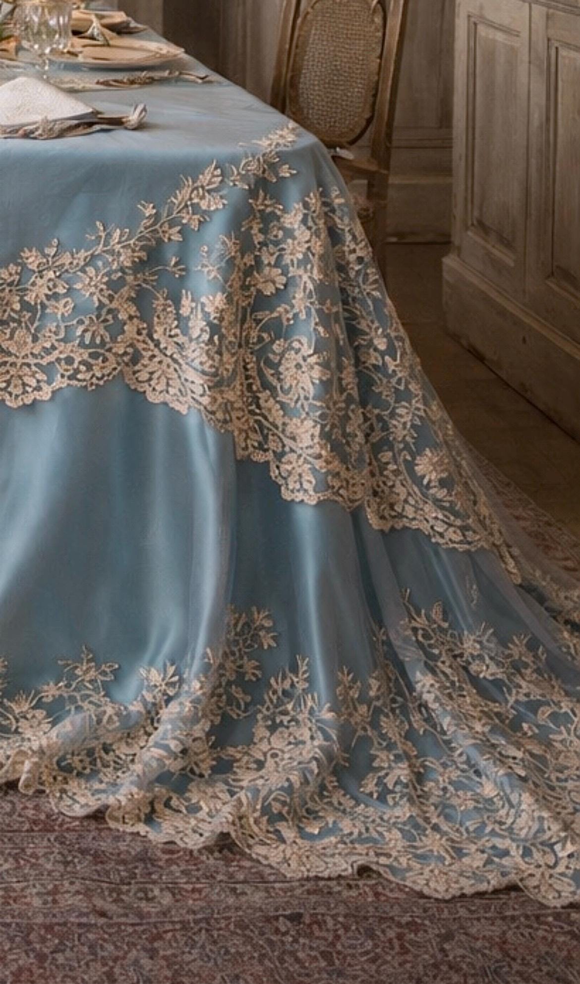 The edge is embellished with a splendid hand-cut lace, individually sewn with artisanal care. The lace, in a warm ivory hue, creates a sophisticated and timeless contrast with the satin, lending depth, richness, and dramatic elegance to the table.