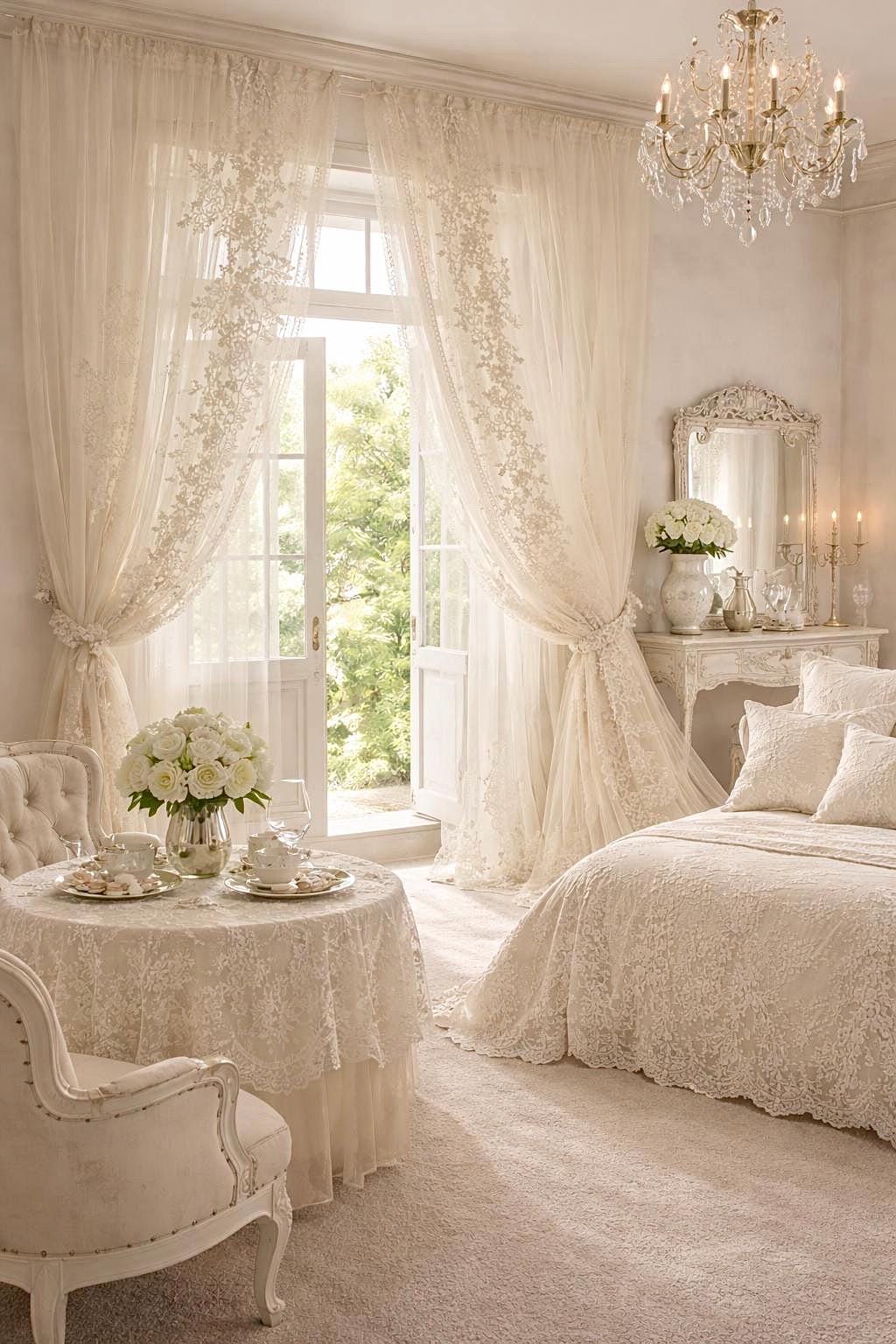 Il bianco candido e il tulle ricamato donano all’ambiente un’atmosfera eterea, raffinata e senza tempo.