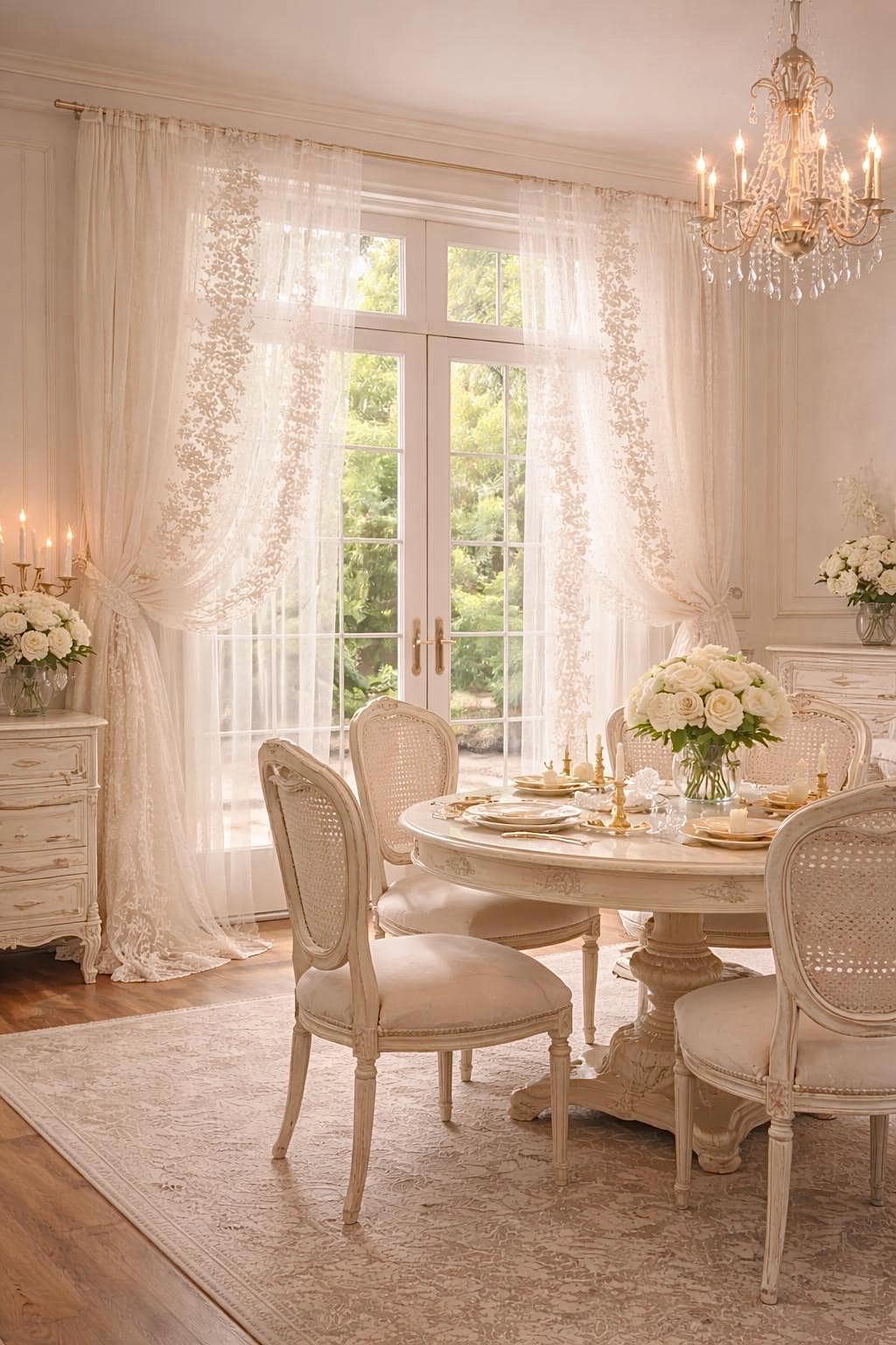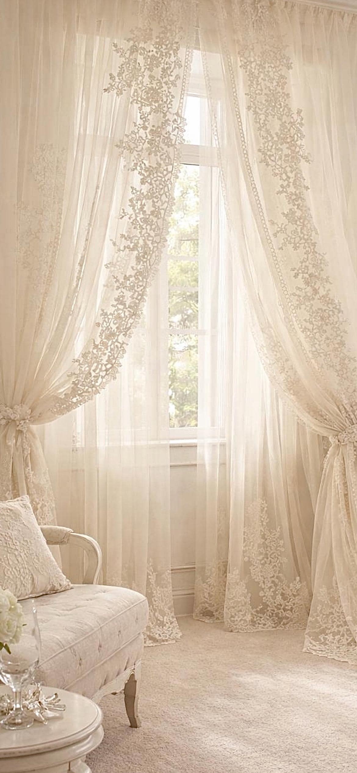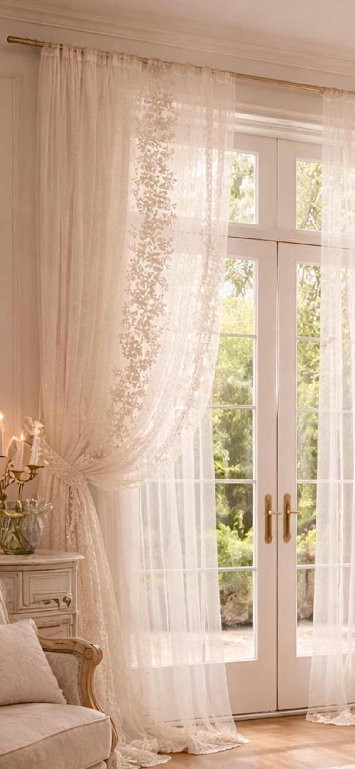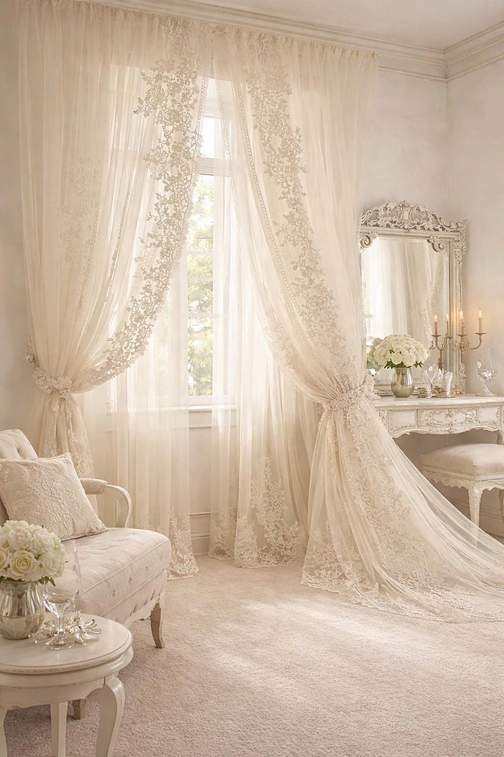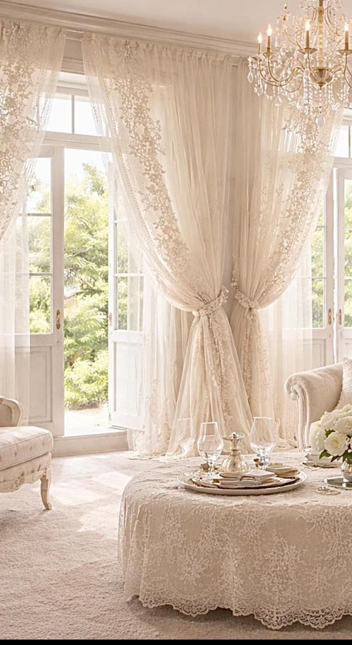 Un completo tende di grande raffinatezza, realizzato in tulle bianco candido con ricami intrecciati a mano, pensato per ambienti luminosi, eleganti e senza tempo.