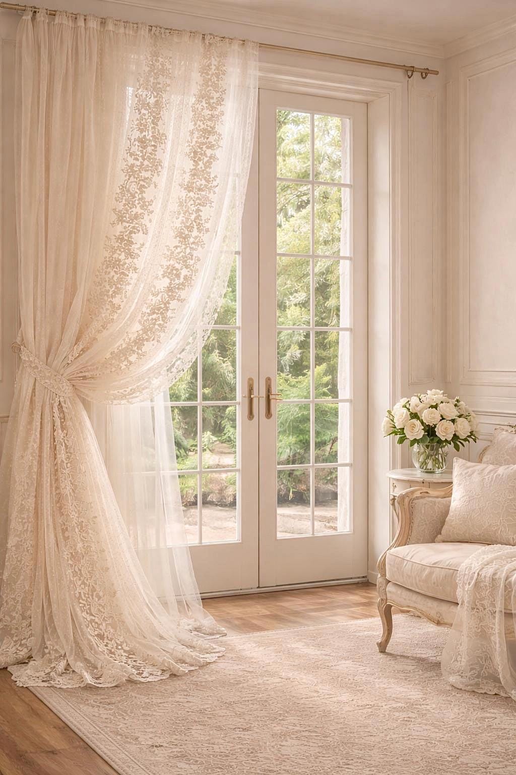 Un completo tende pensato per chi ama l’eleganza senza tempo, la cura artigianale e un acquisto sereno e consapevole.A refined and elegant curtain set made of pure white sheer tulle, featuring hand-interwoven embroidery, designed for bright, timeless, and sophisticated interiors.