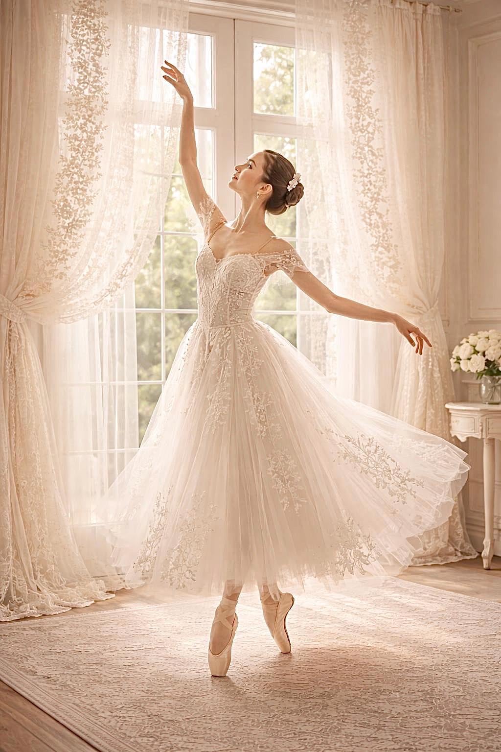 The pure white tulle and embroidery create a light, refined, and timeless atmosphere.