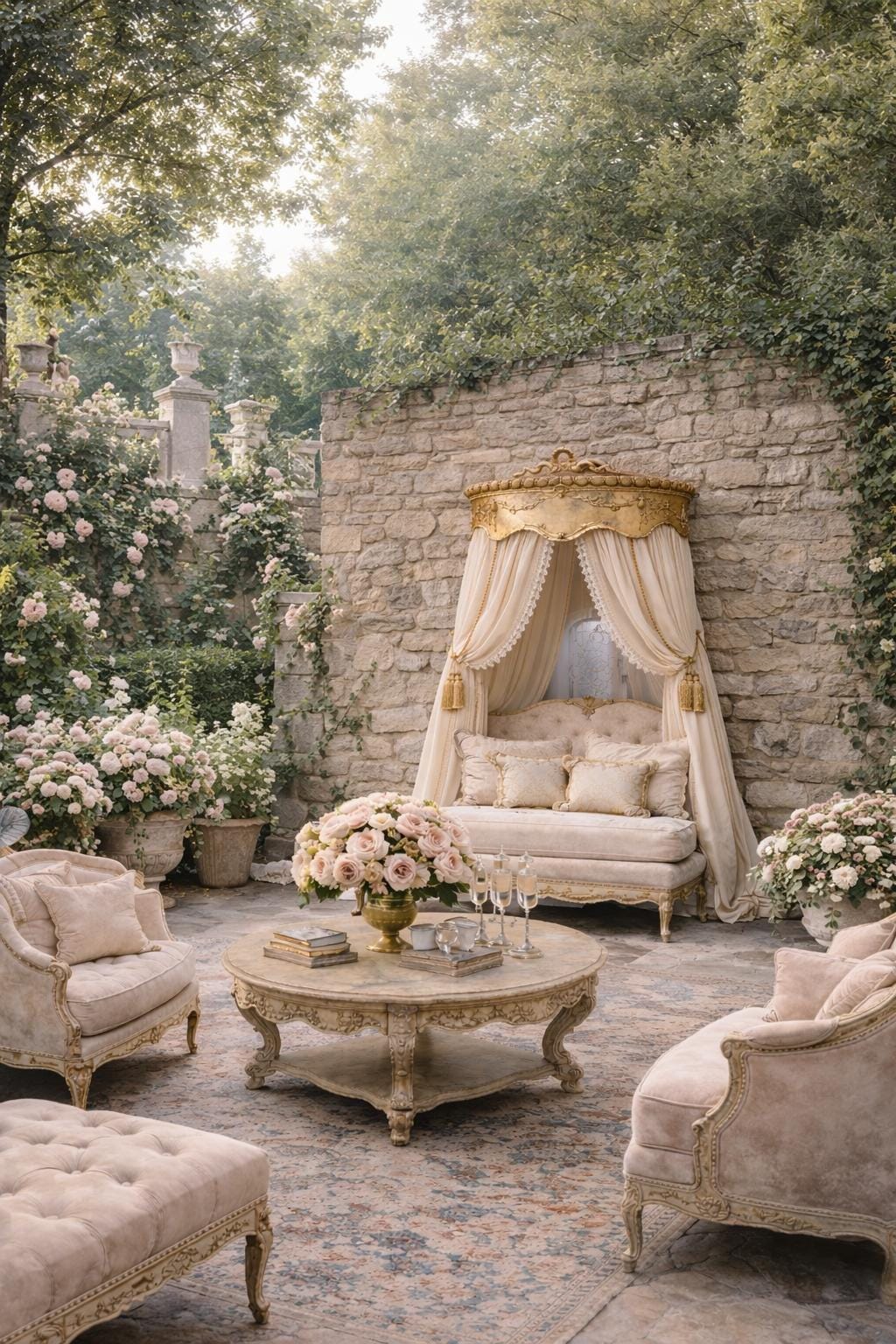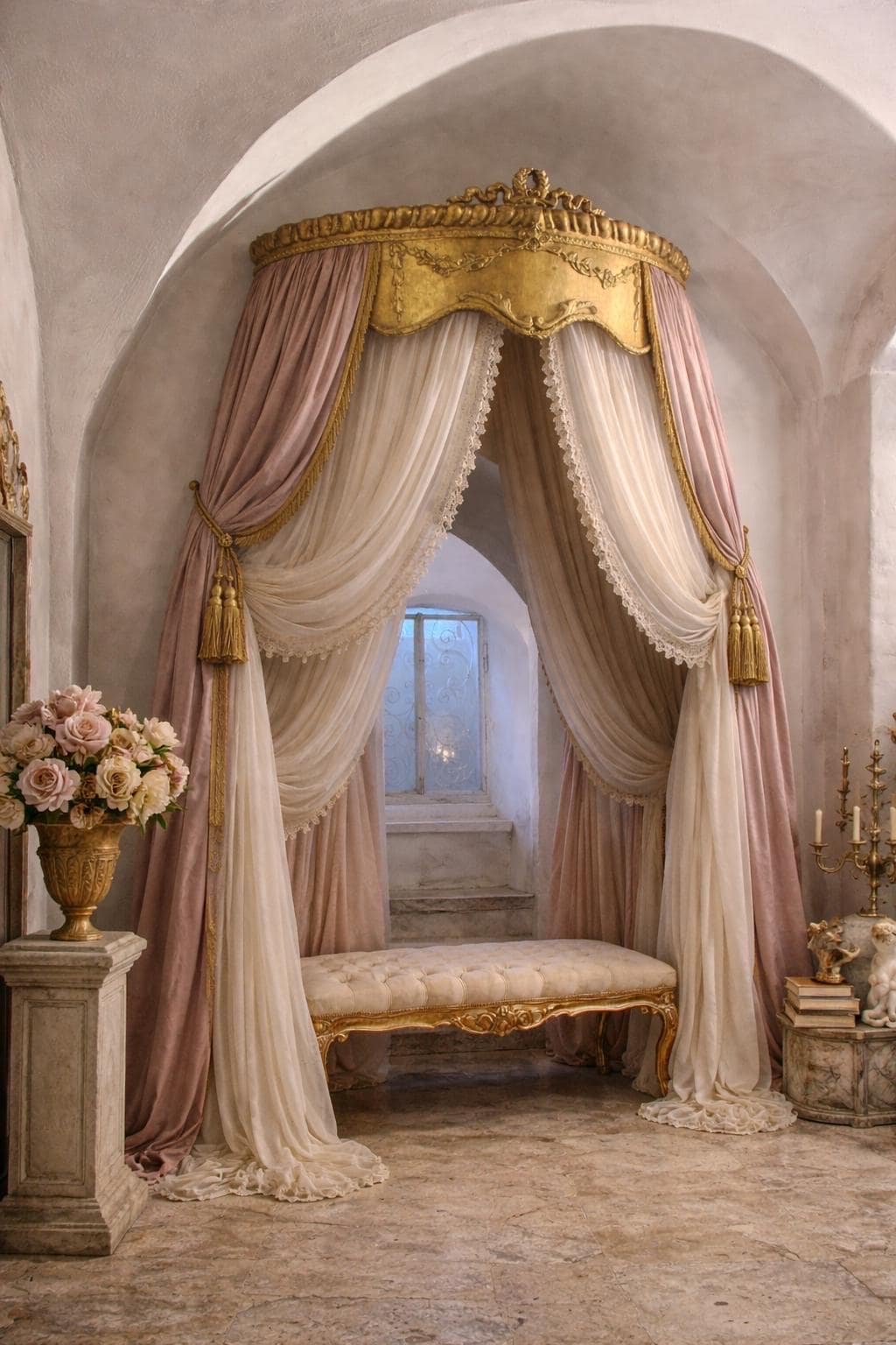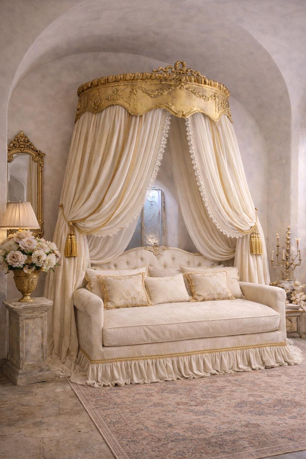 The highlight is the finely crafted wooden canopy, gilded and hand-patinated, crafted in our carpentry workshops. Each piece is unique, featuring a warm and sophisticated gold finish, giving it a worn and aristocratic look.