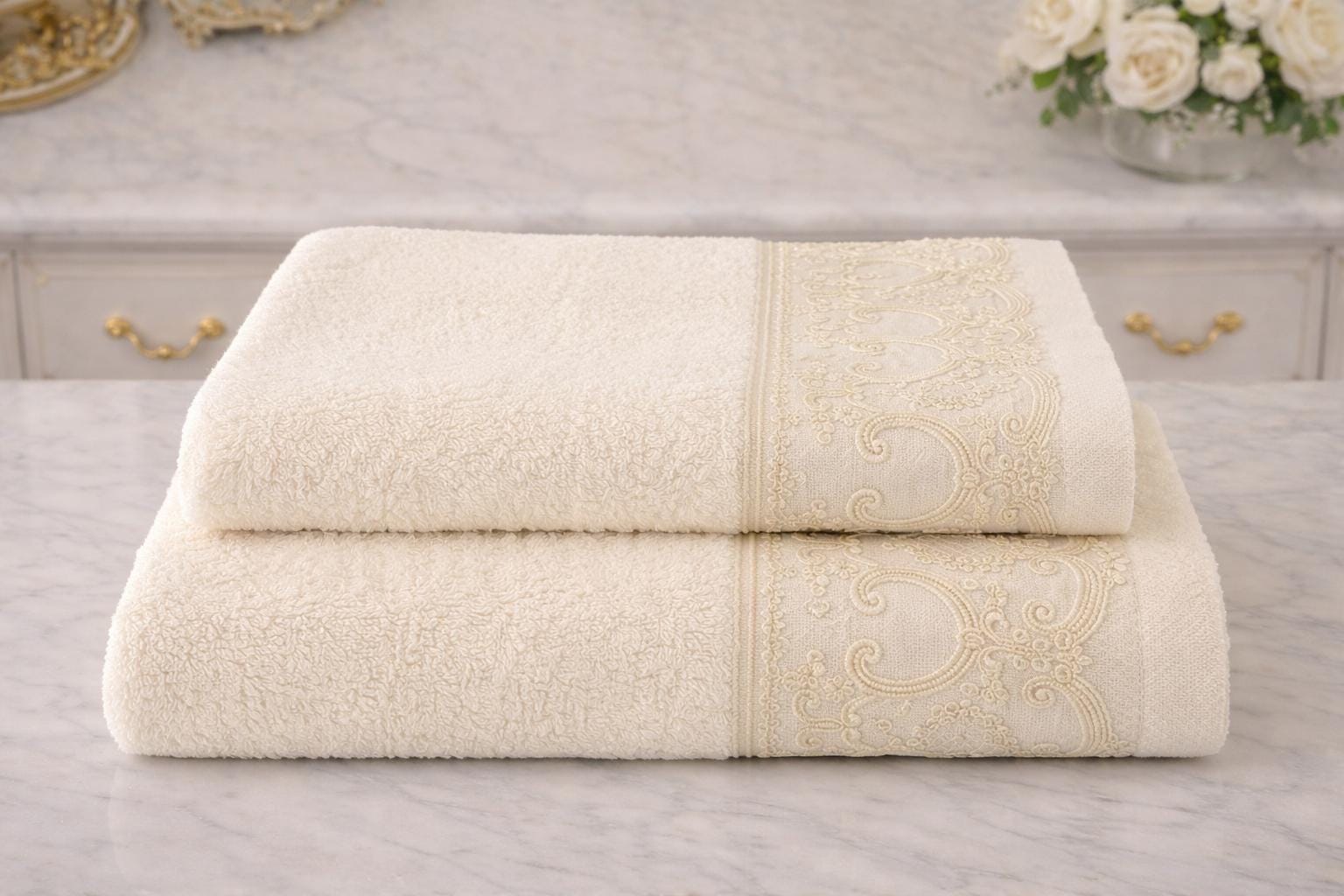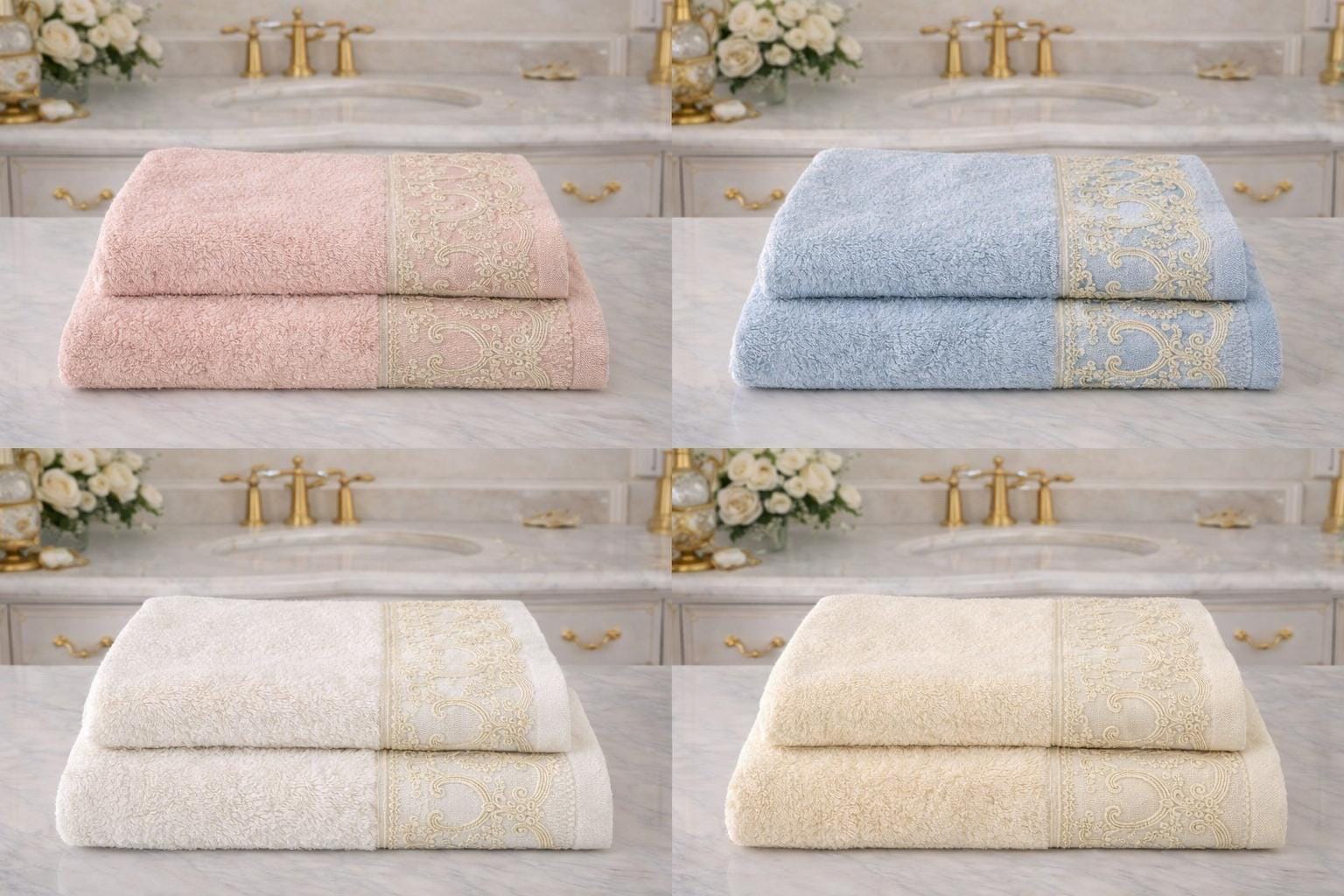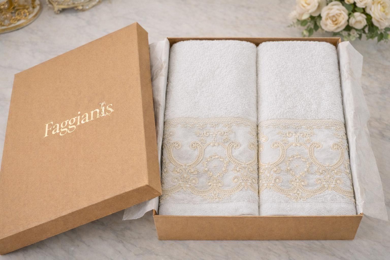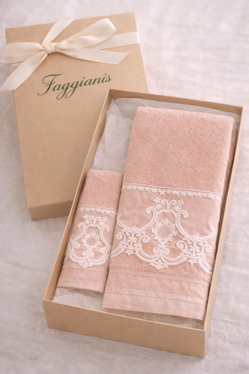 Elegant and refined set of two towels in soft sponge and precious lace. The set includes 1 towel measuring 100x54 cm (inches 39.37” x 21.25”) and 1 measuring 58x40 cm (inches 22.83” x 15.74”). Available in pink, light blue, beige and white of your choice and beige lace.