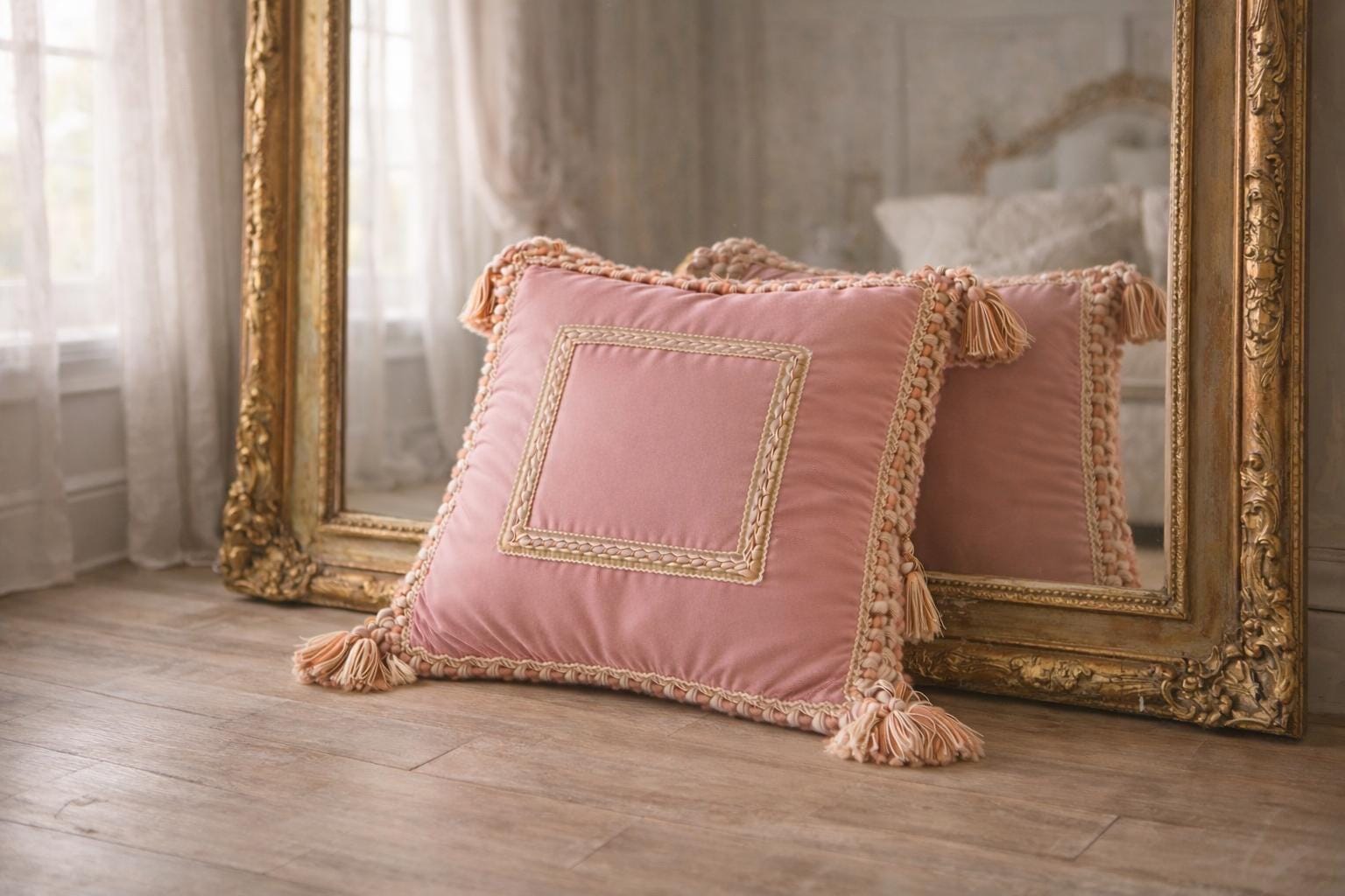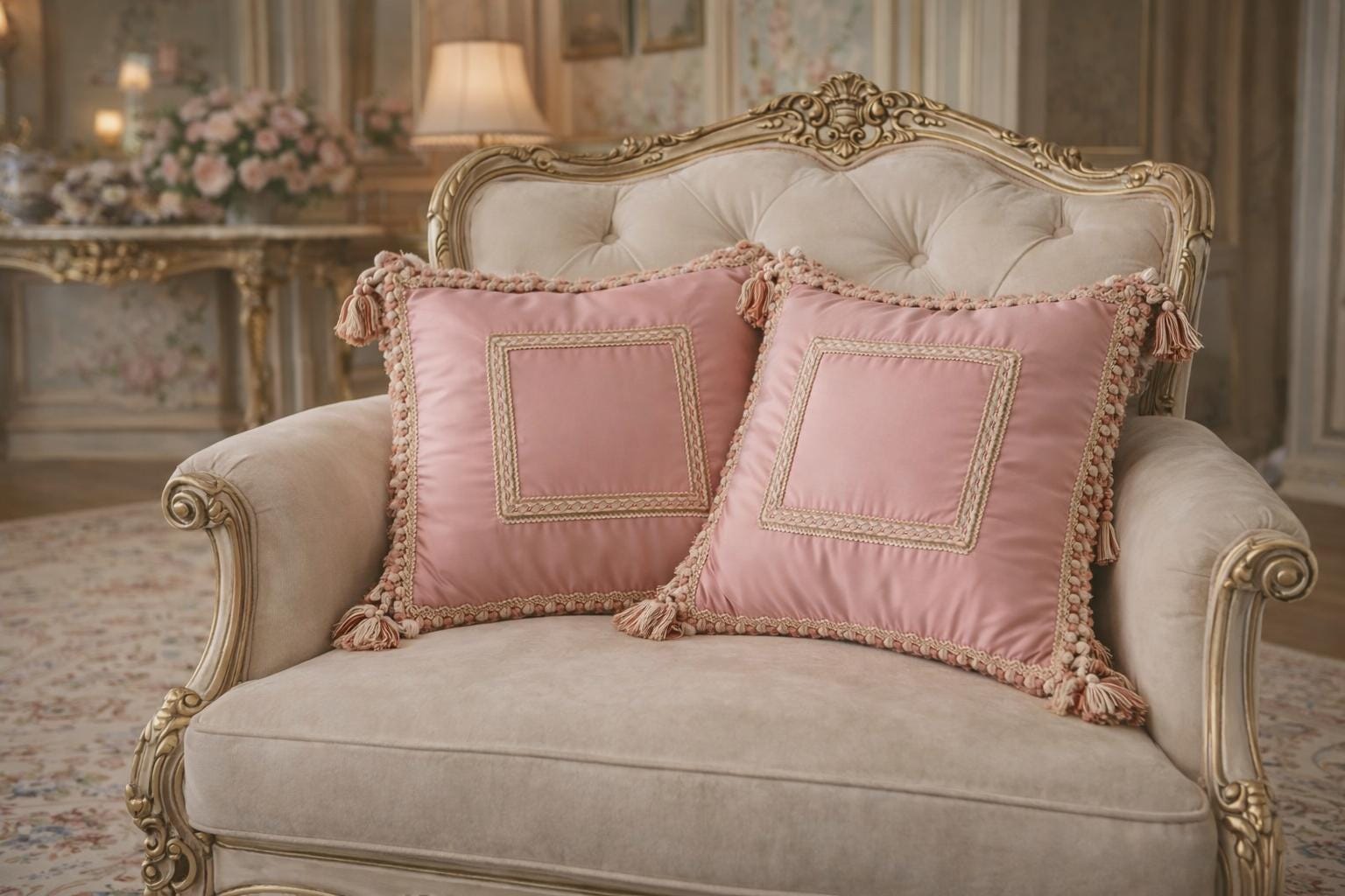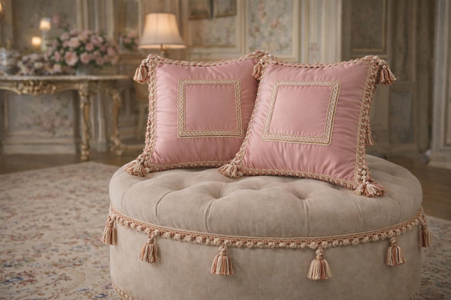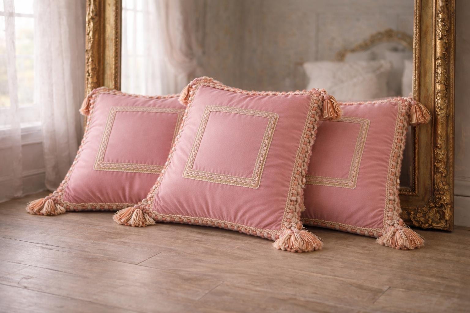 They are made of antique pink cotton satin and finished with precious Italian trimmings, applied by hand in our workshops according to a tradition of high-quality textile decoration.