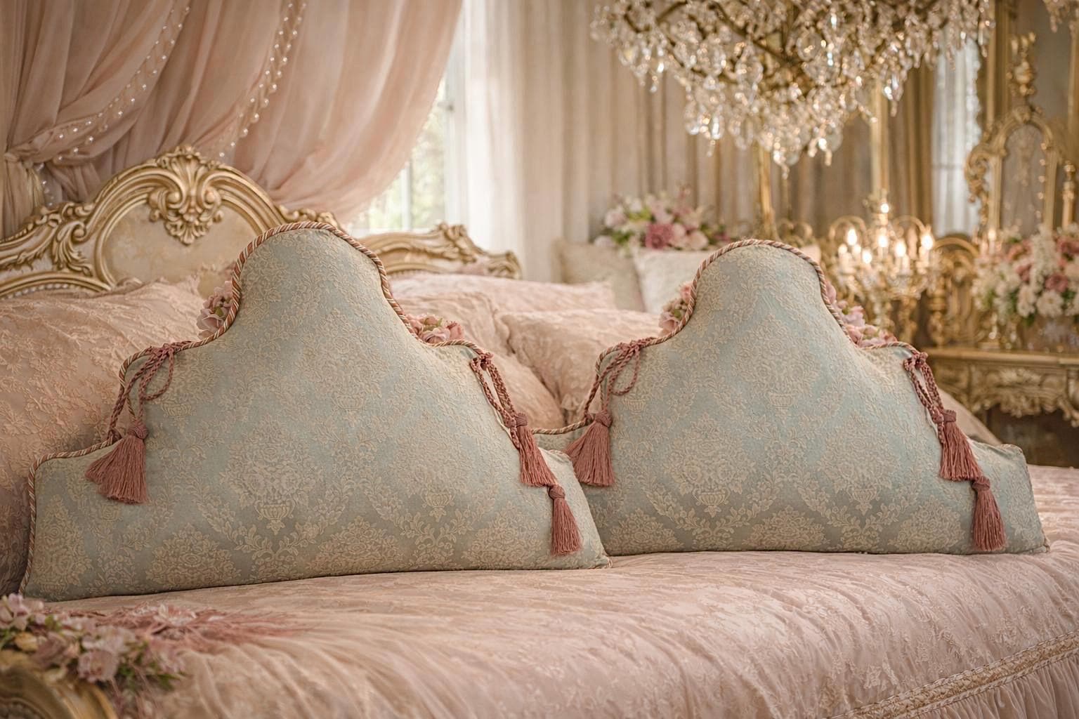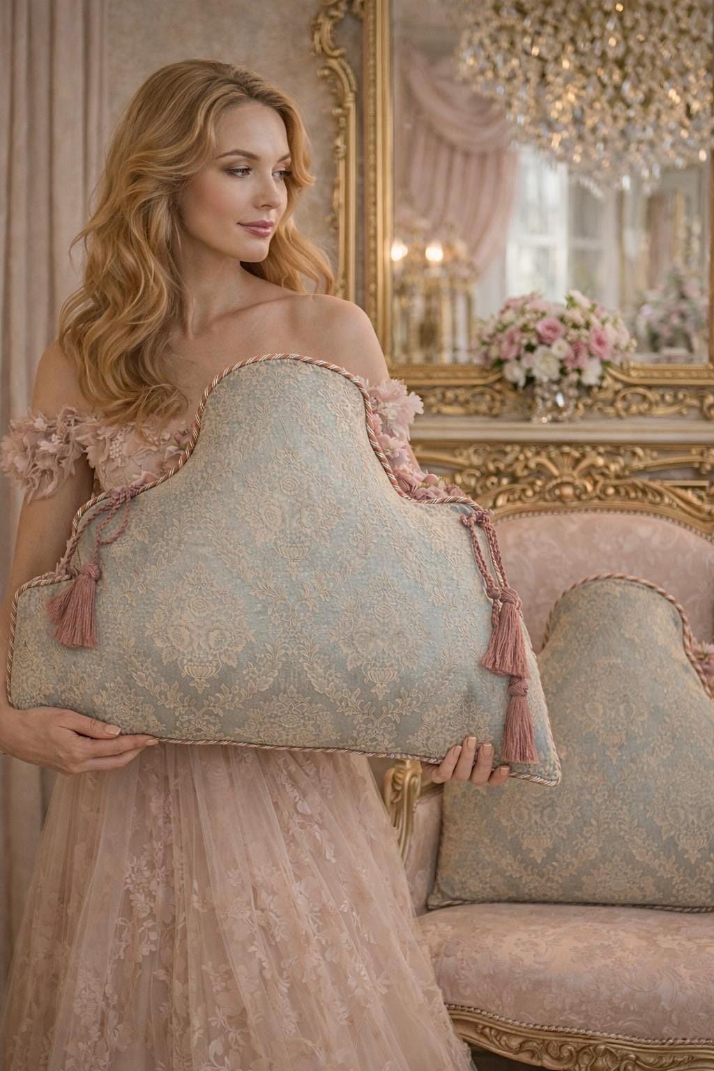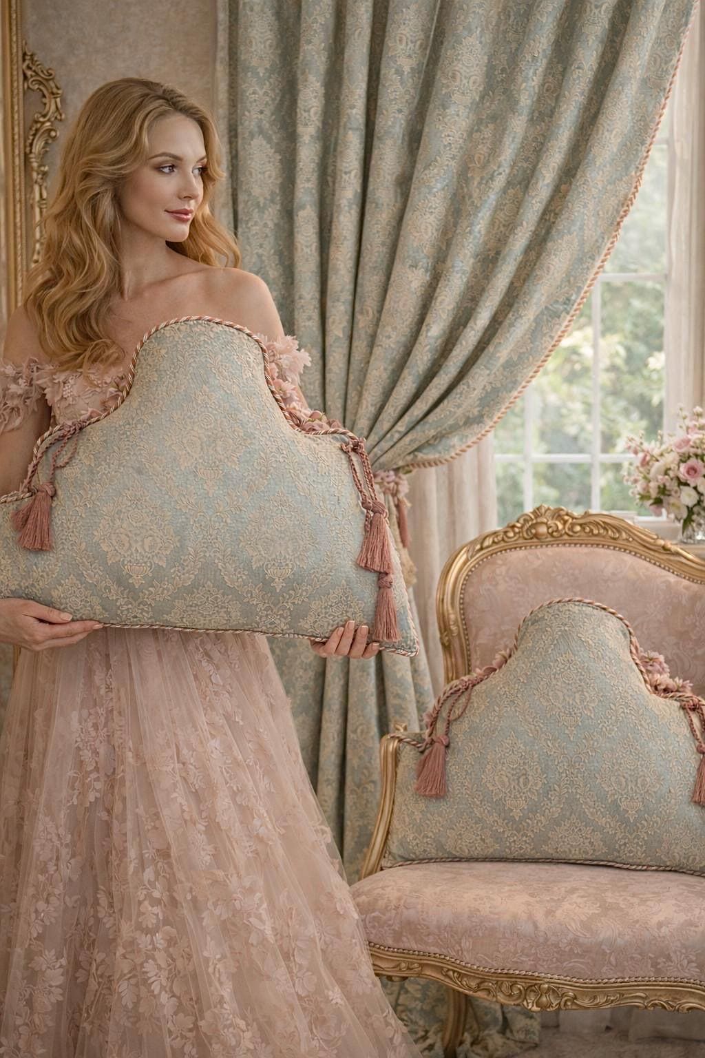 In our atelier, we handcraft them using fine brocades with a blue or green base, paired with exquisite trimmings in shades of pink and ivory, carefully applied to enhance their soft, decorative lines. Each cushion is made to order, with attention to detail and respect for traditional Italian craftsmanship.