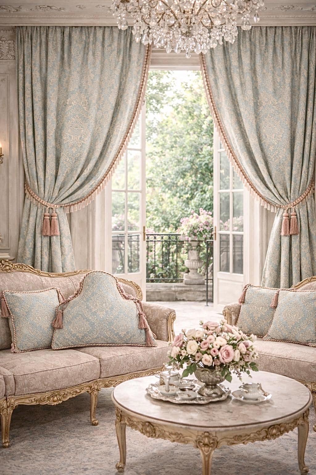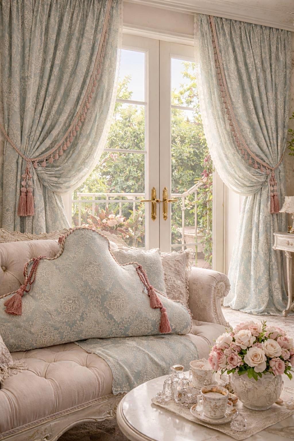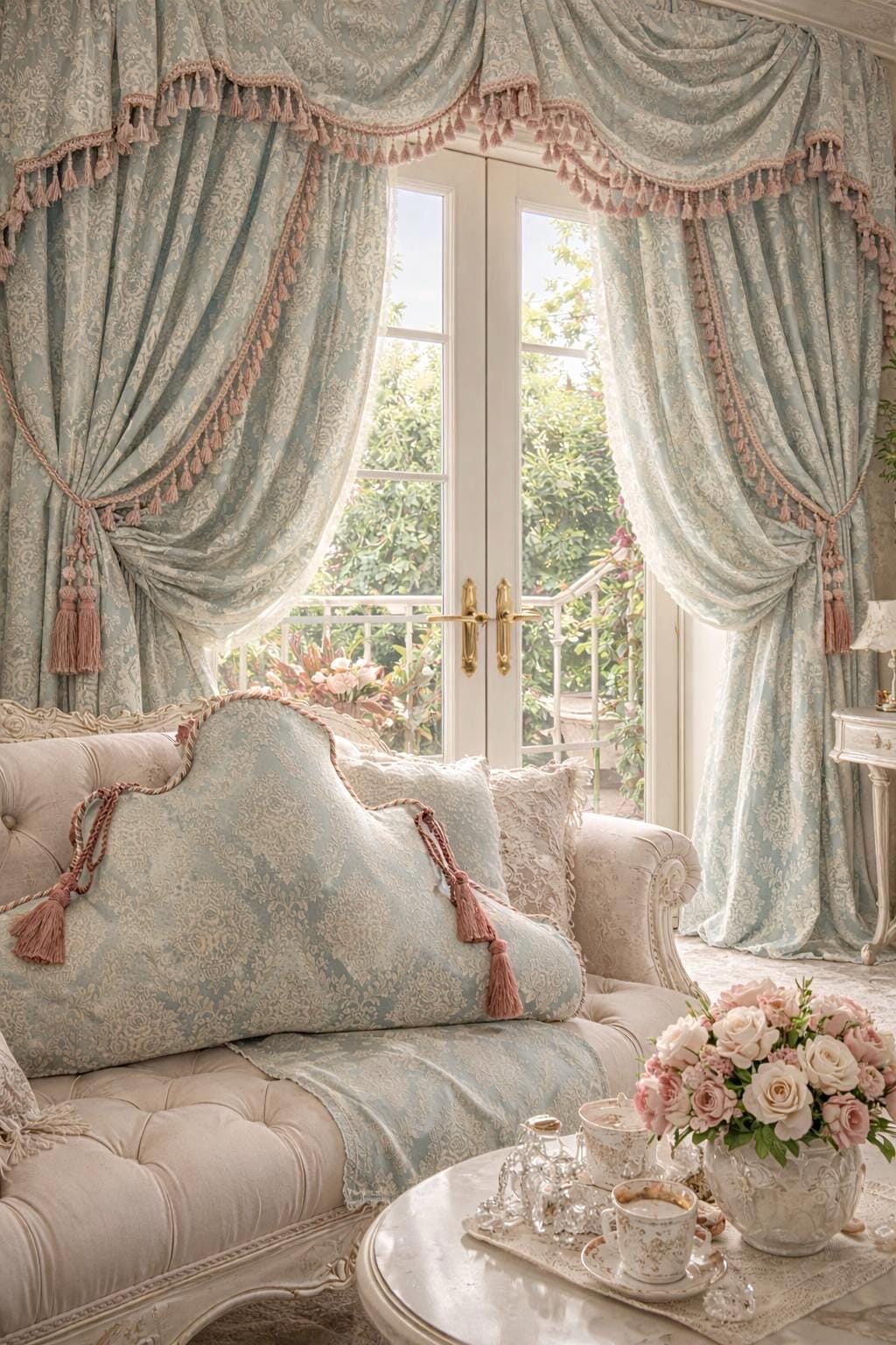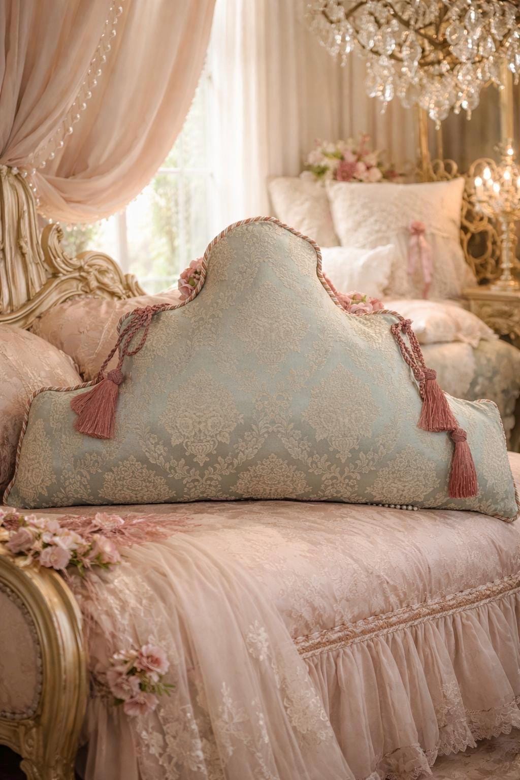 In our atelier, we handcraft them using fine brocades with a blue or green base, paired with exquisite trimmings in shades of pink and ivory, carefully applied to enhance their soft, decorative lines. Each cushion is made to order, with attention to detail and respect for traditional Italian craftsmanship.