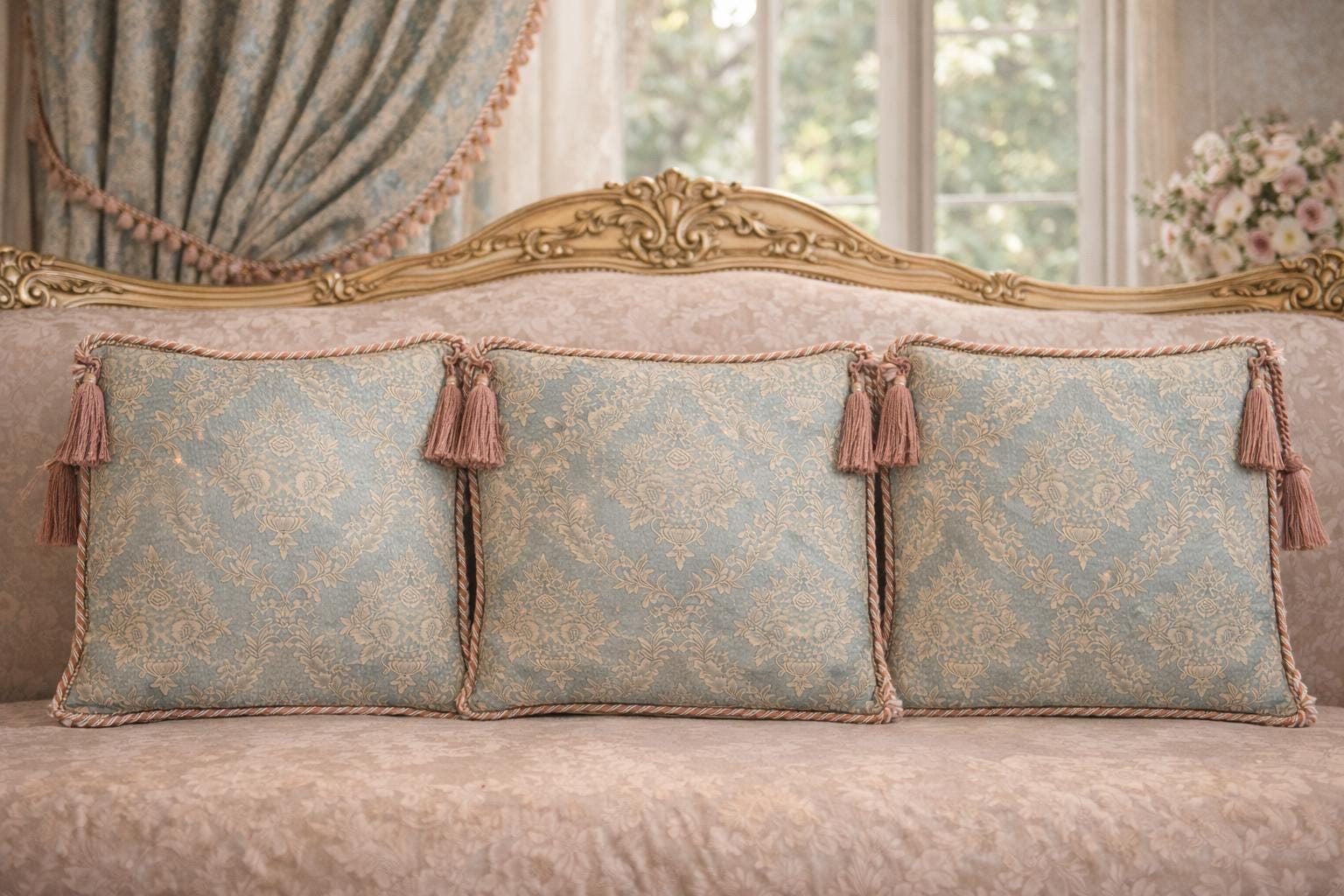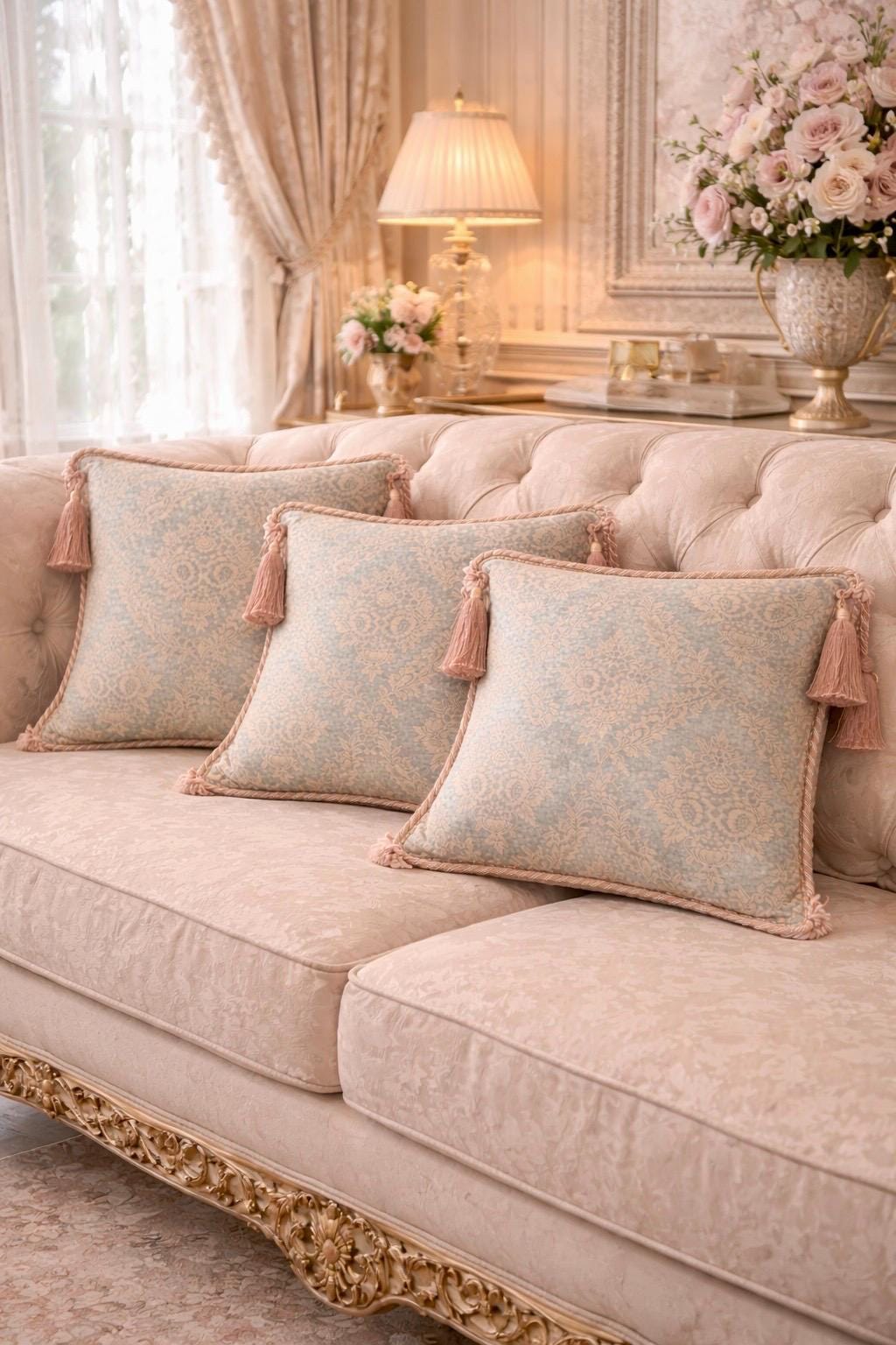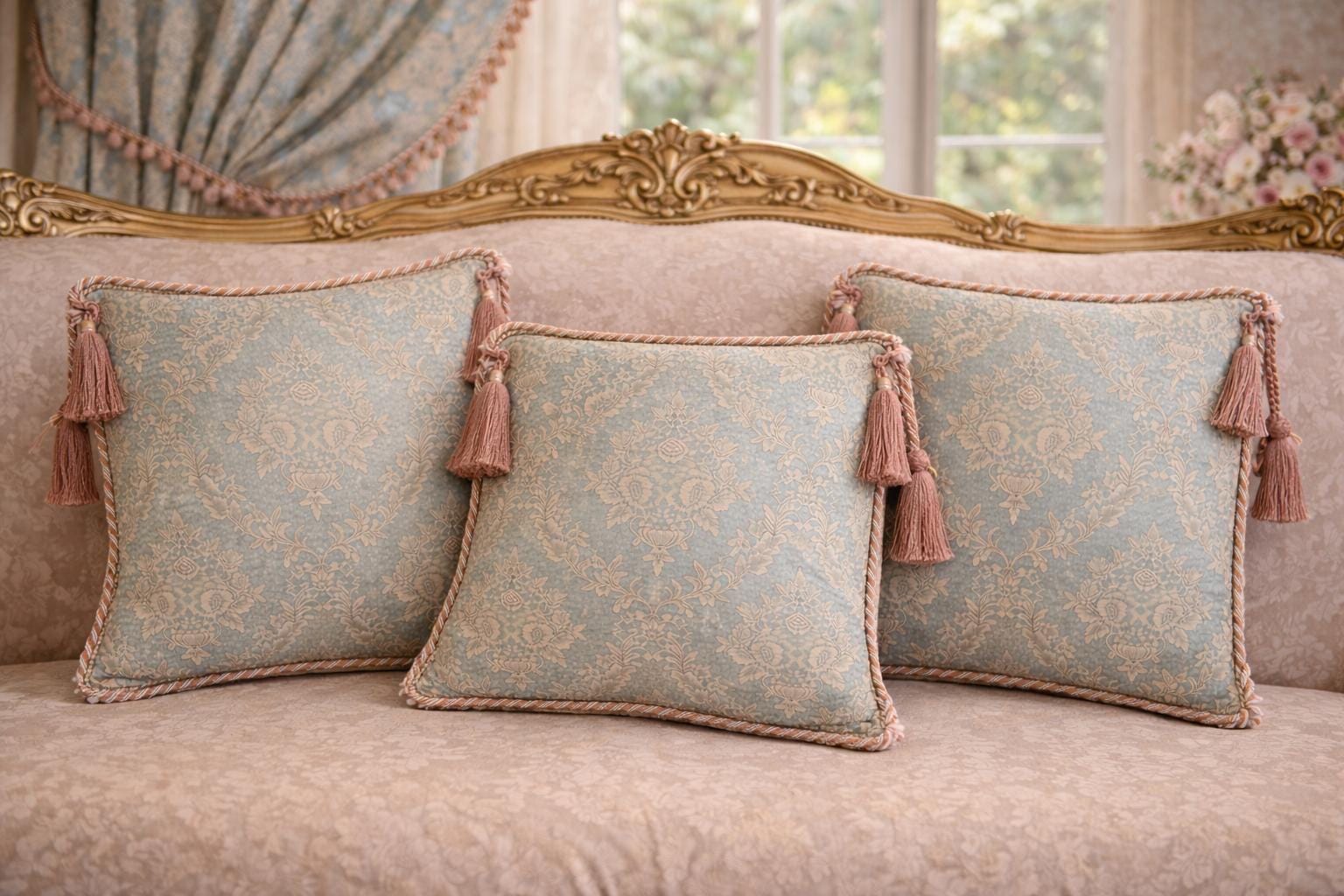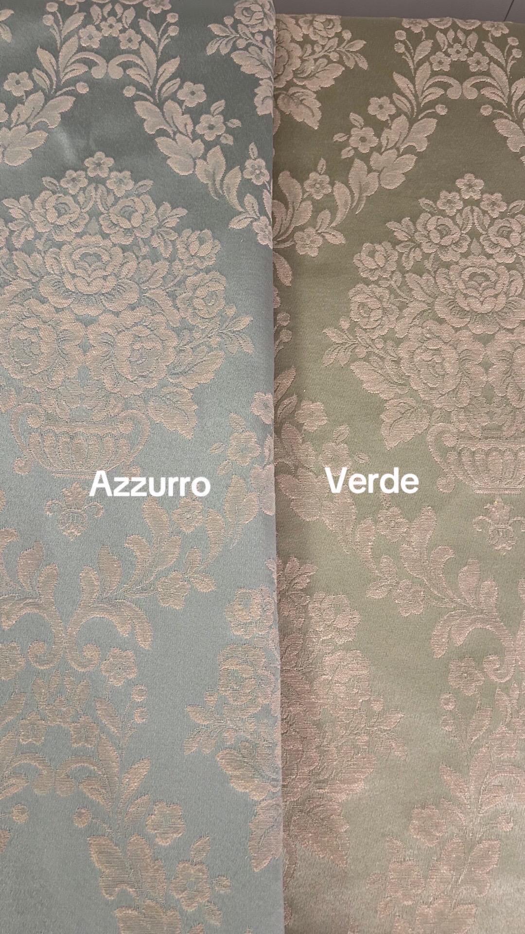 This cushion is part of our Bridgerton collection and is handcrafted in our atelier using Italian cotton brocade, available in a choice of blue or green, as shown in the photos. The high-quality fabric, rich yet delicate, is designed to combine elegance and practicality: it can be machine washed without shrinking, following standard washing instructions.