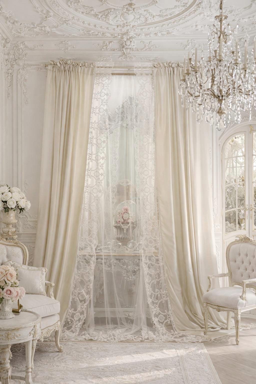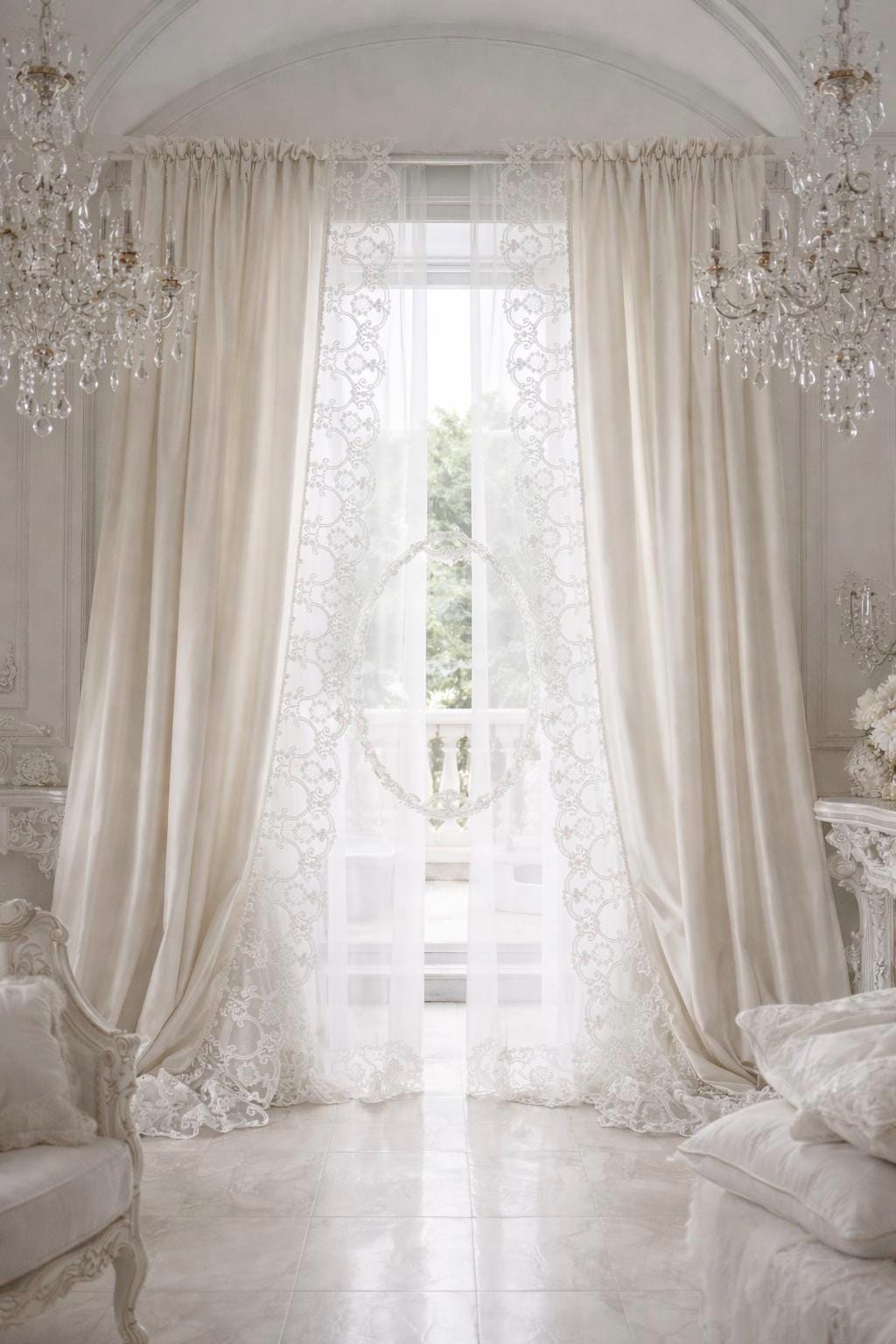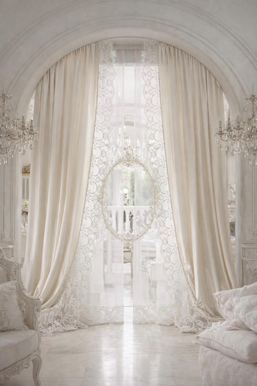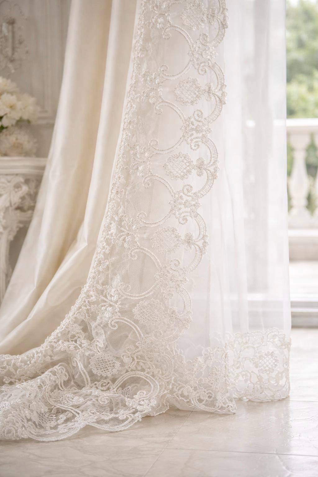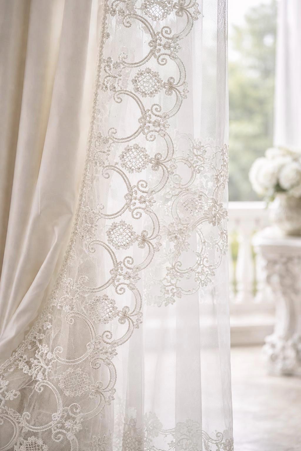 Ideal for Art Nouveau salons, aristocratic bedrooms, reception rooms, or classic settings, these curtains enhance natural light, creating a soft, enveloping atmosphere. The flowing georgette draws the eye with a soft movement, while the baroque lace frames the window like a decorative textile.
