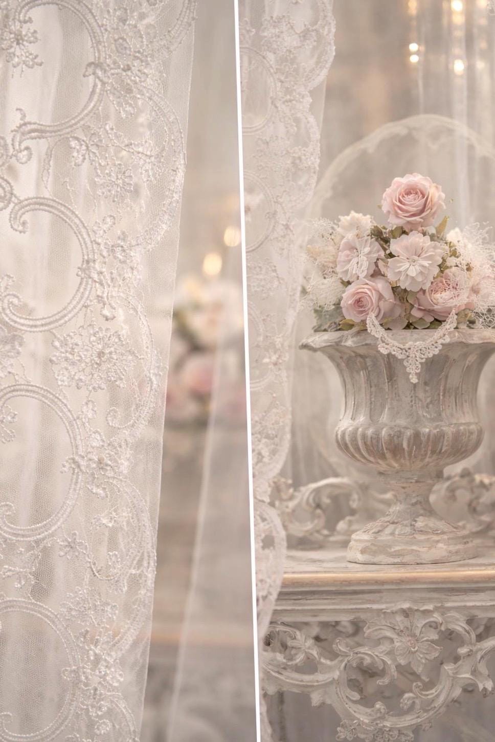 The underlying fabric is made entirely of tulle, embellished with a central embroidered tabló and matching lace at the bottom. The width is a fixed 3 meters, or approximately 118.1 inches.