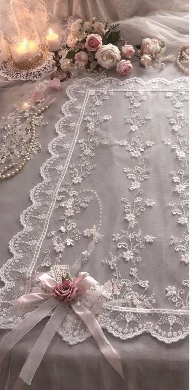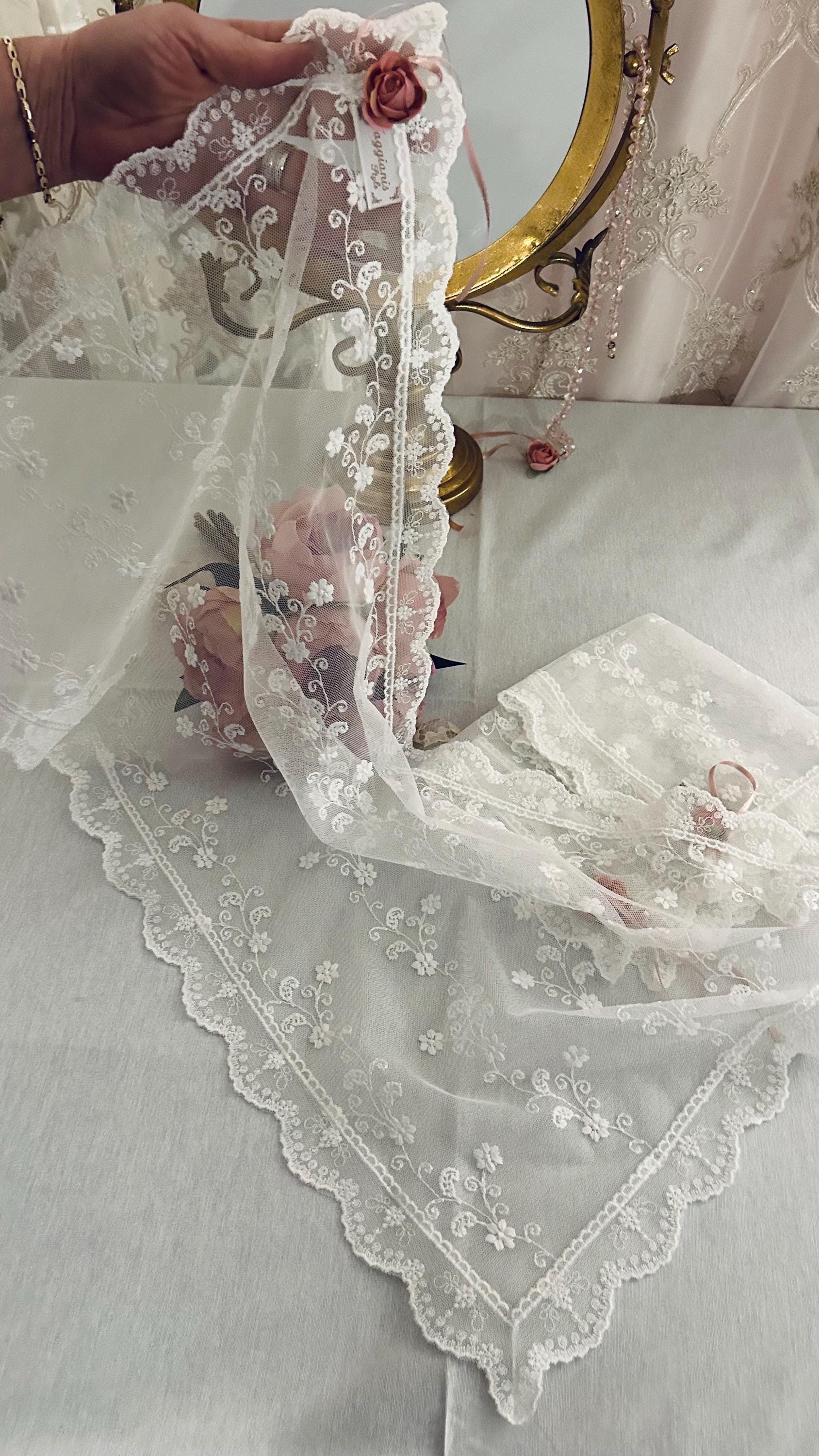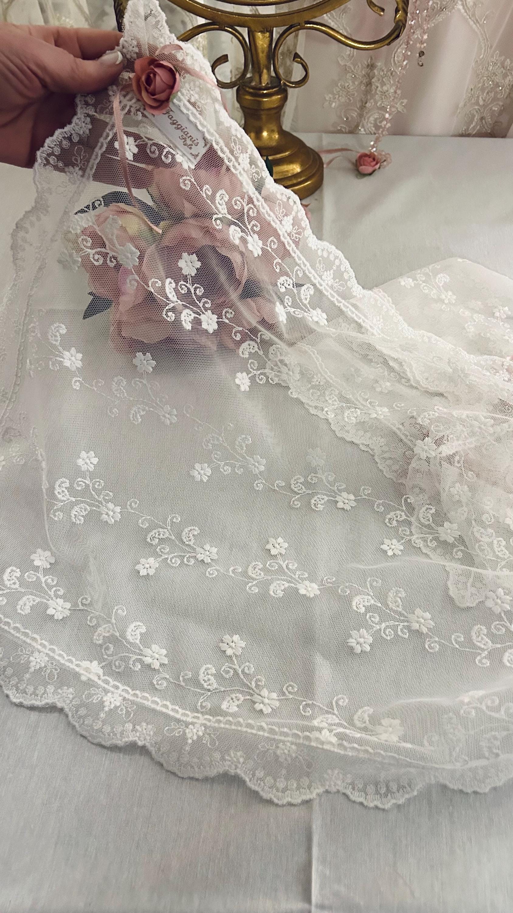 Il tessuto è un tulle bianco ricamato con piccoli fiori e motivi floreali eleganti, rifinito con bordo in pizzo e impreziosito da roselline decorative. Il colore è completamente bianco, luminoso e sofisticato, perfetto per ambienti romantici e armoniosi.