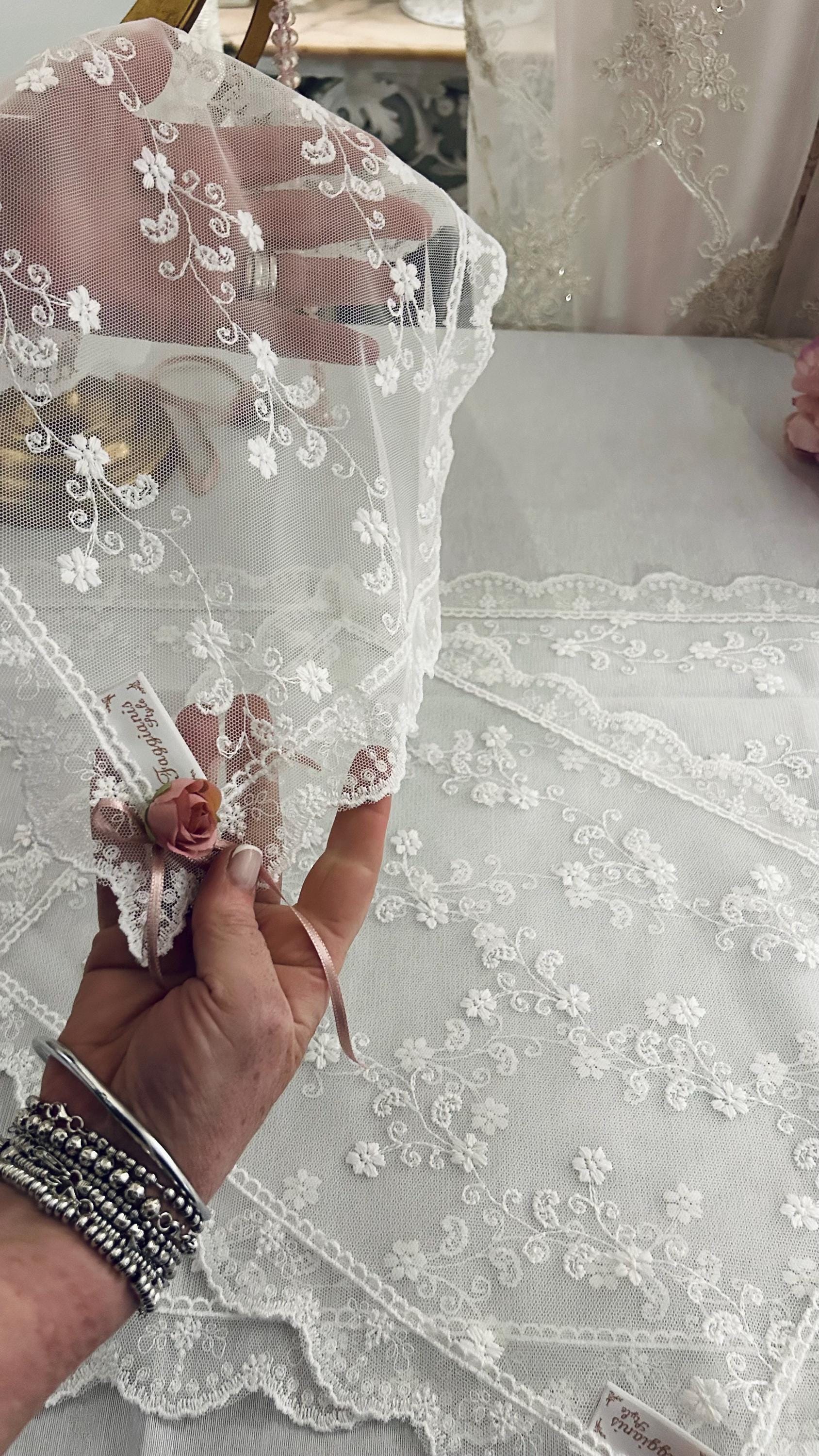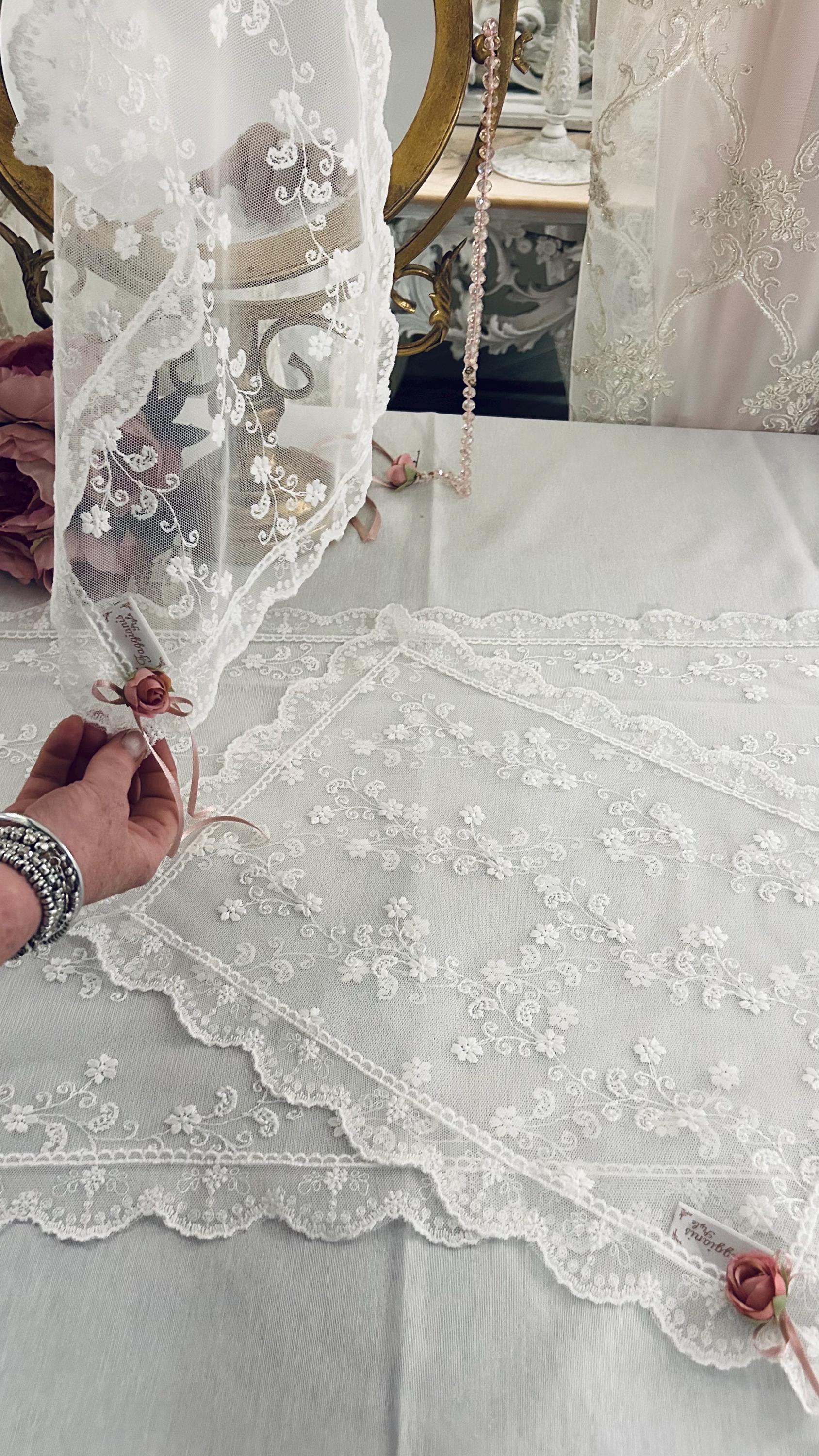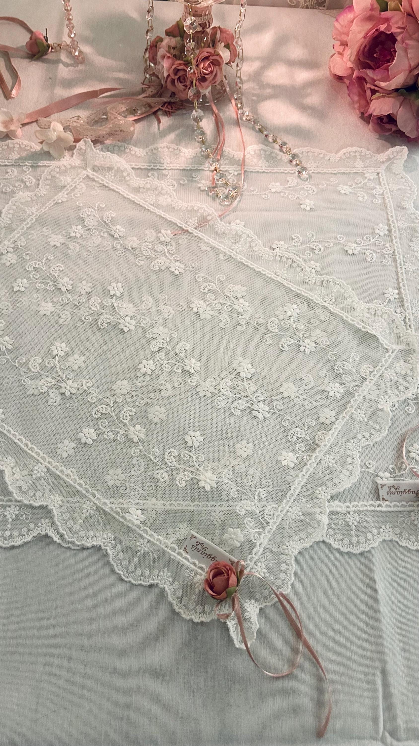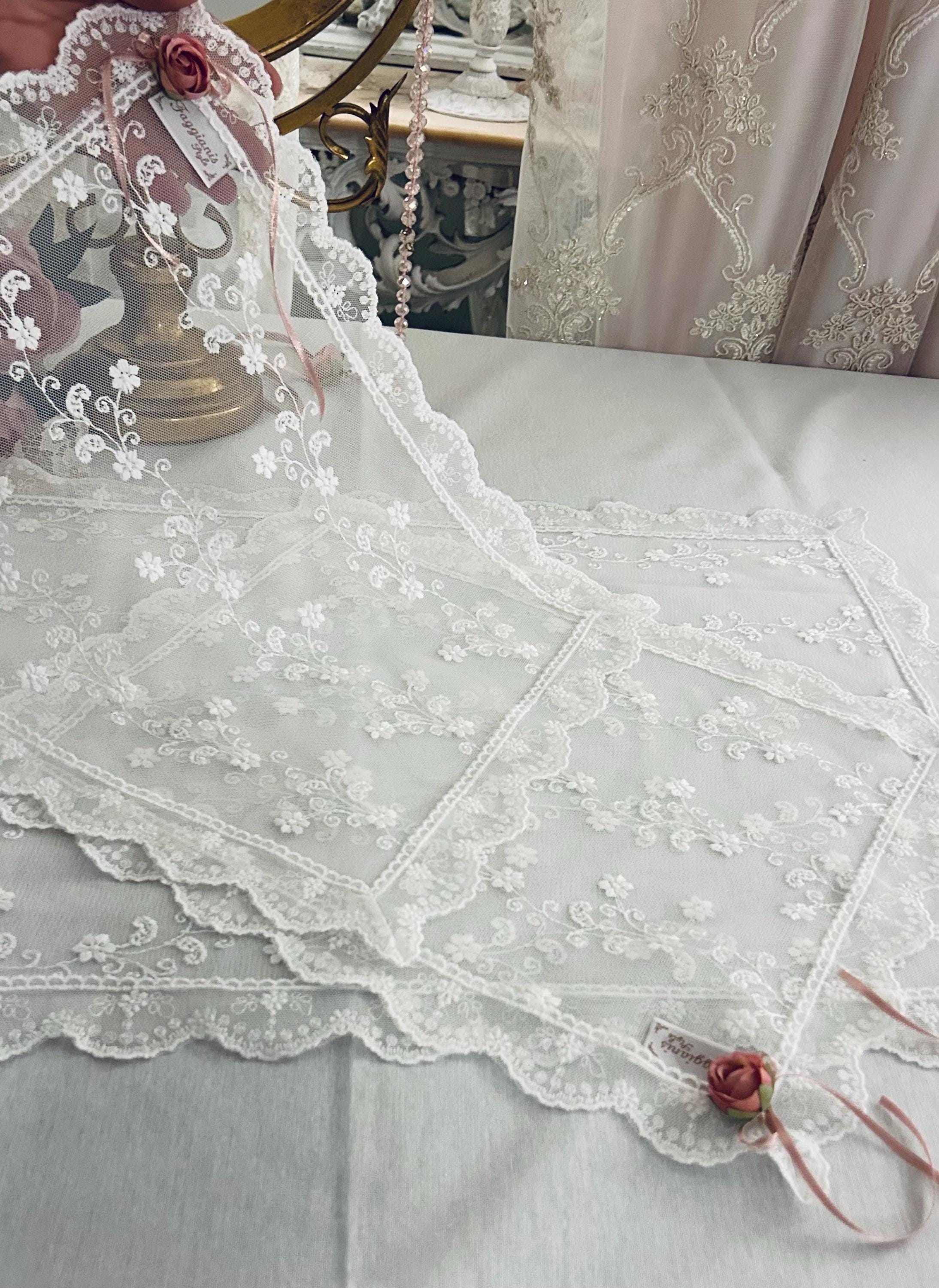 Delicato, romantico e raffinato. Questo tris di centrini in tulle ricamato total white è realizzato artigianalmente nel nostro laboratorio in Italia.