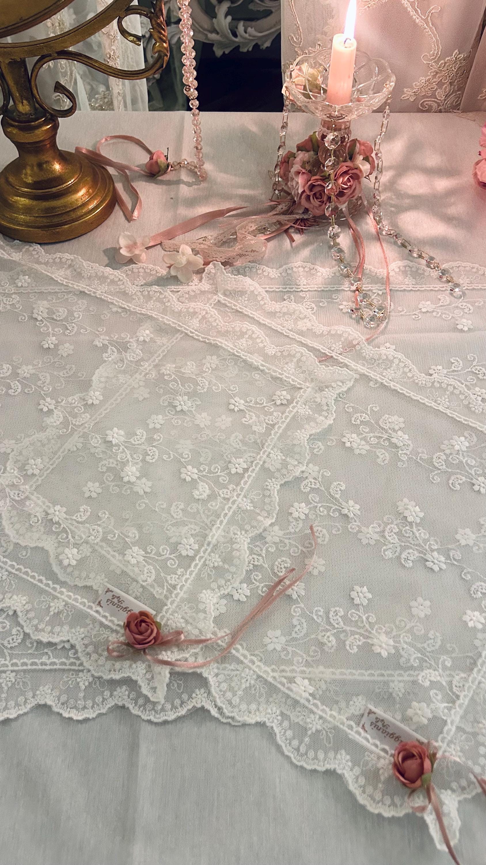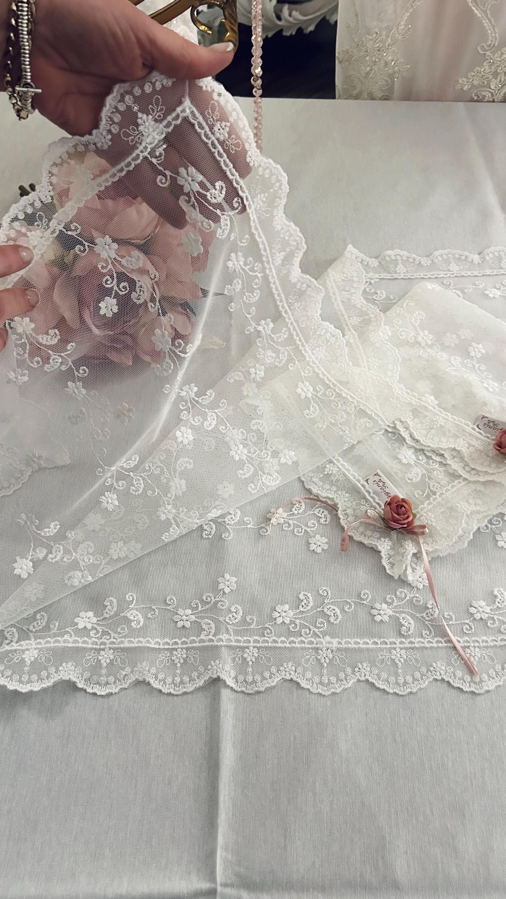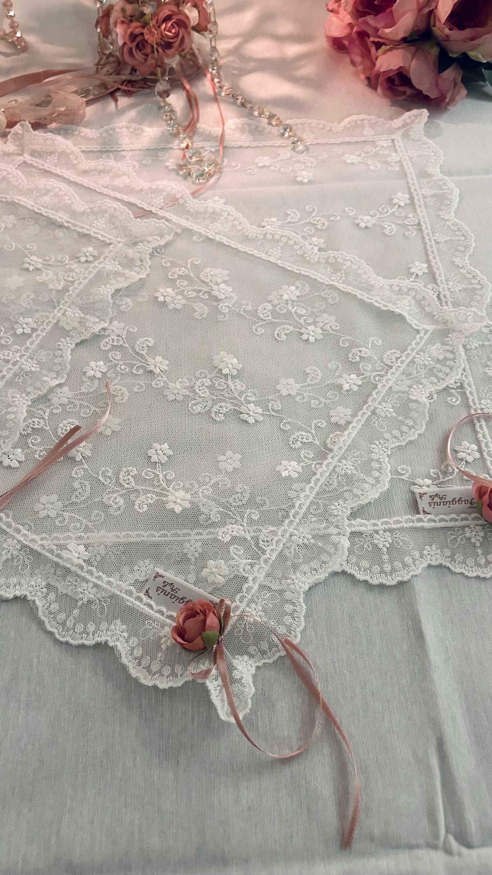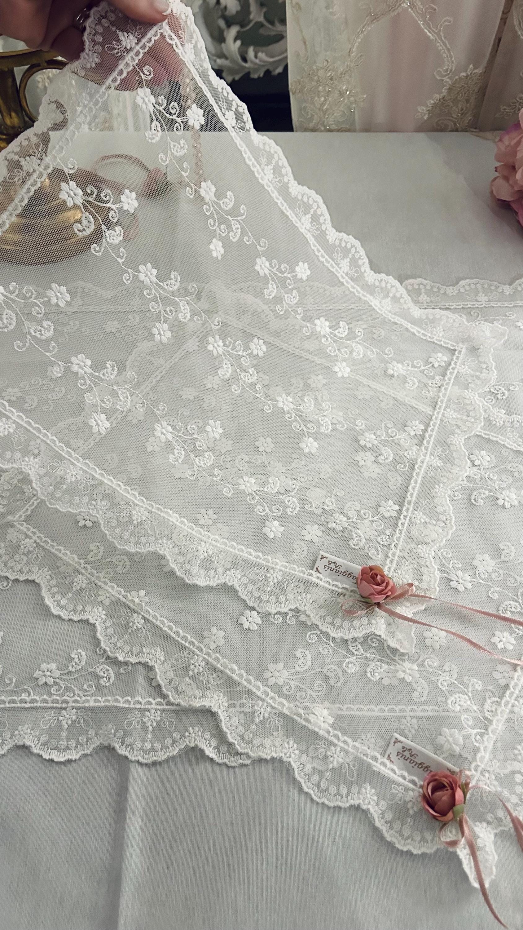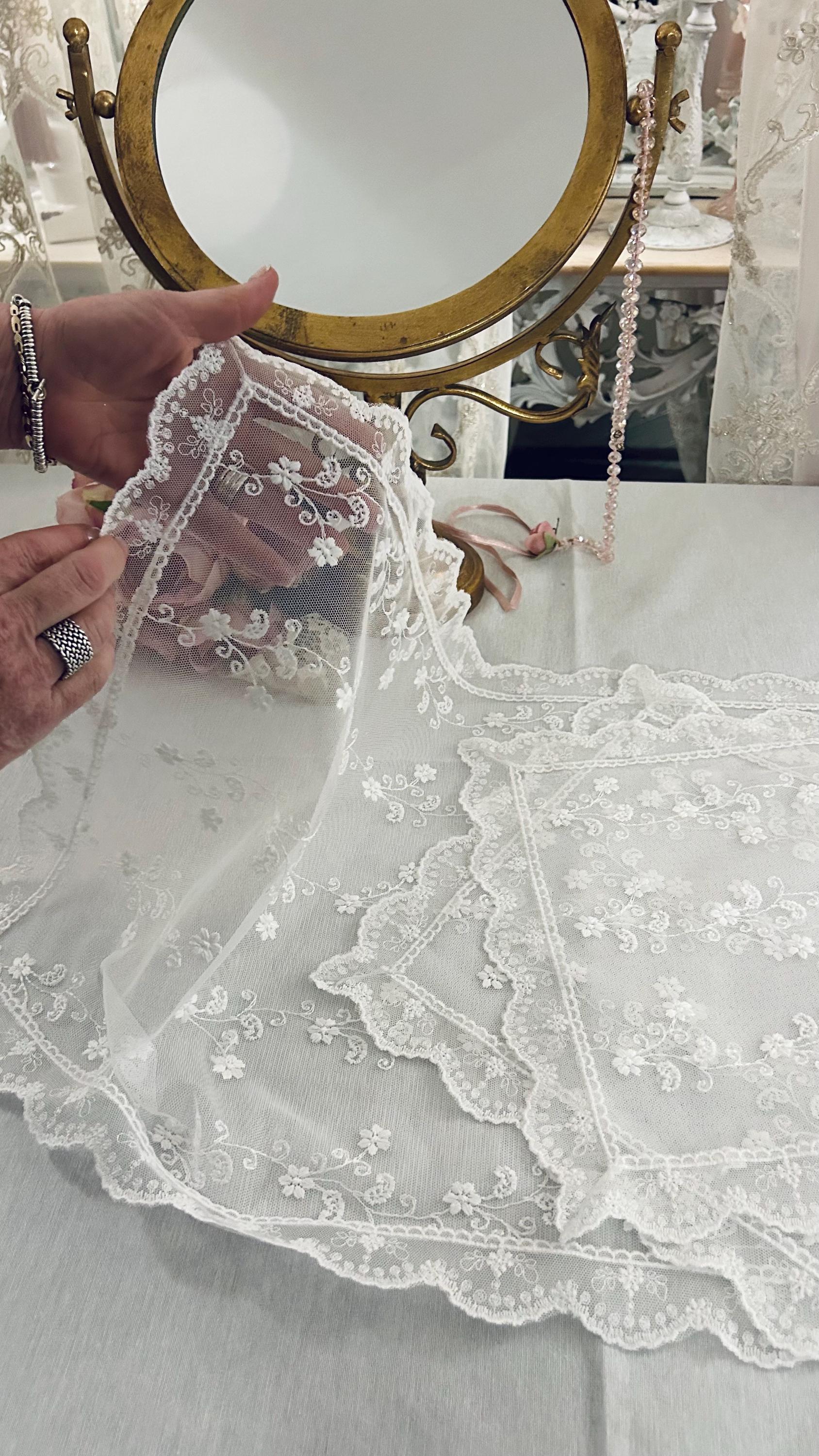 Delicato, romantico e raffinato. Questo tris di centrini in tulle ricamato total white è realizzato artigianalmente nel nostro laboratorio in Italia.