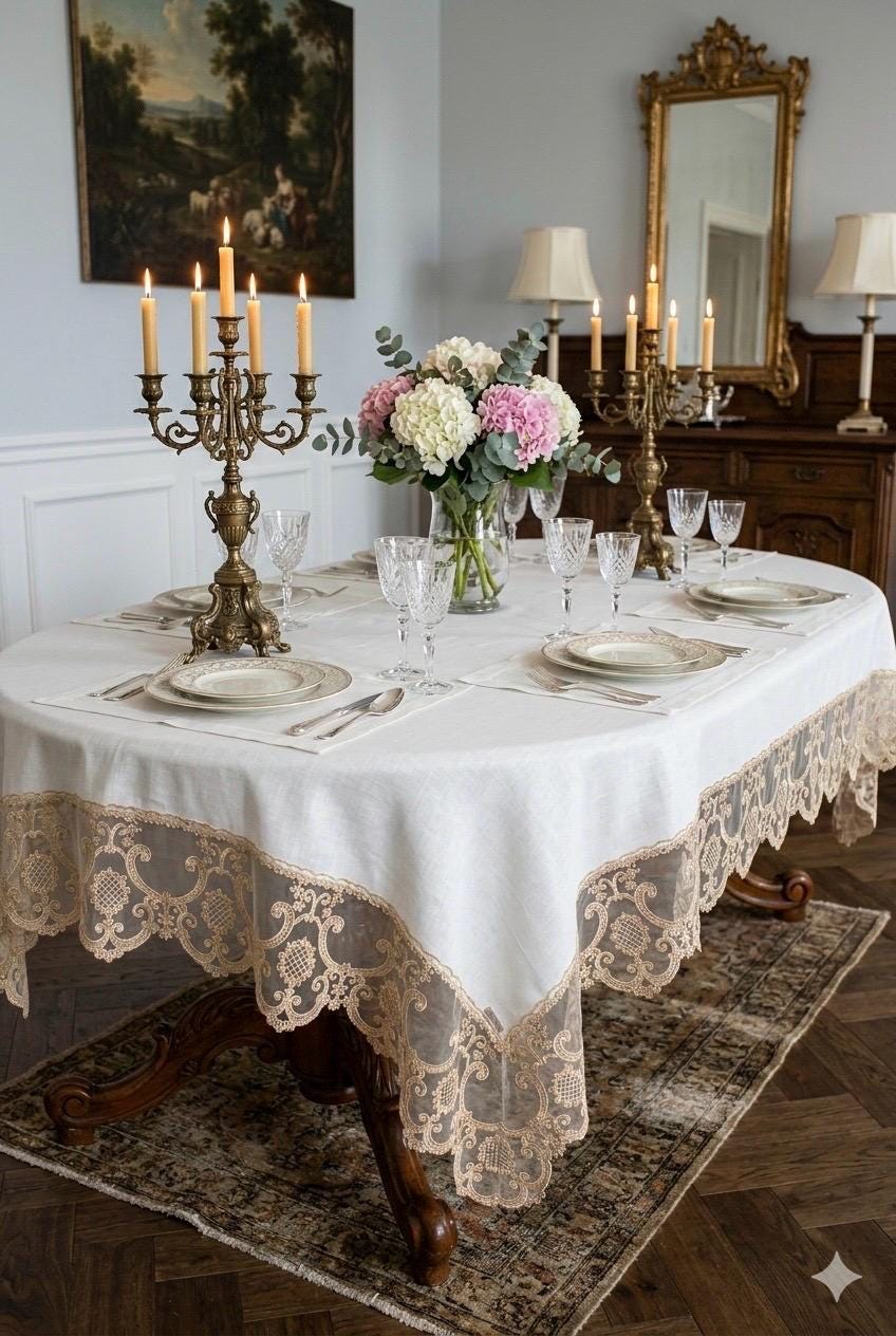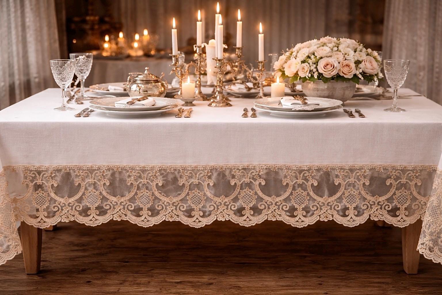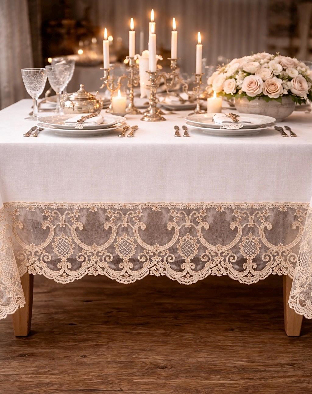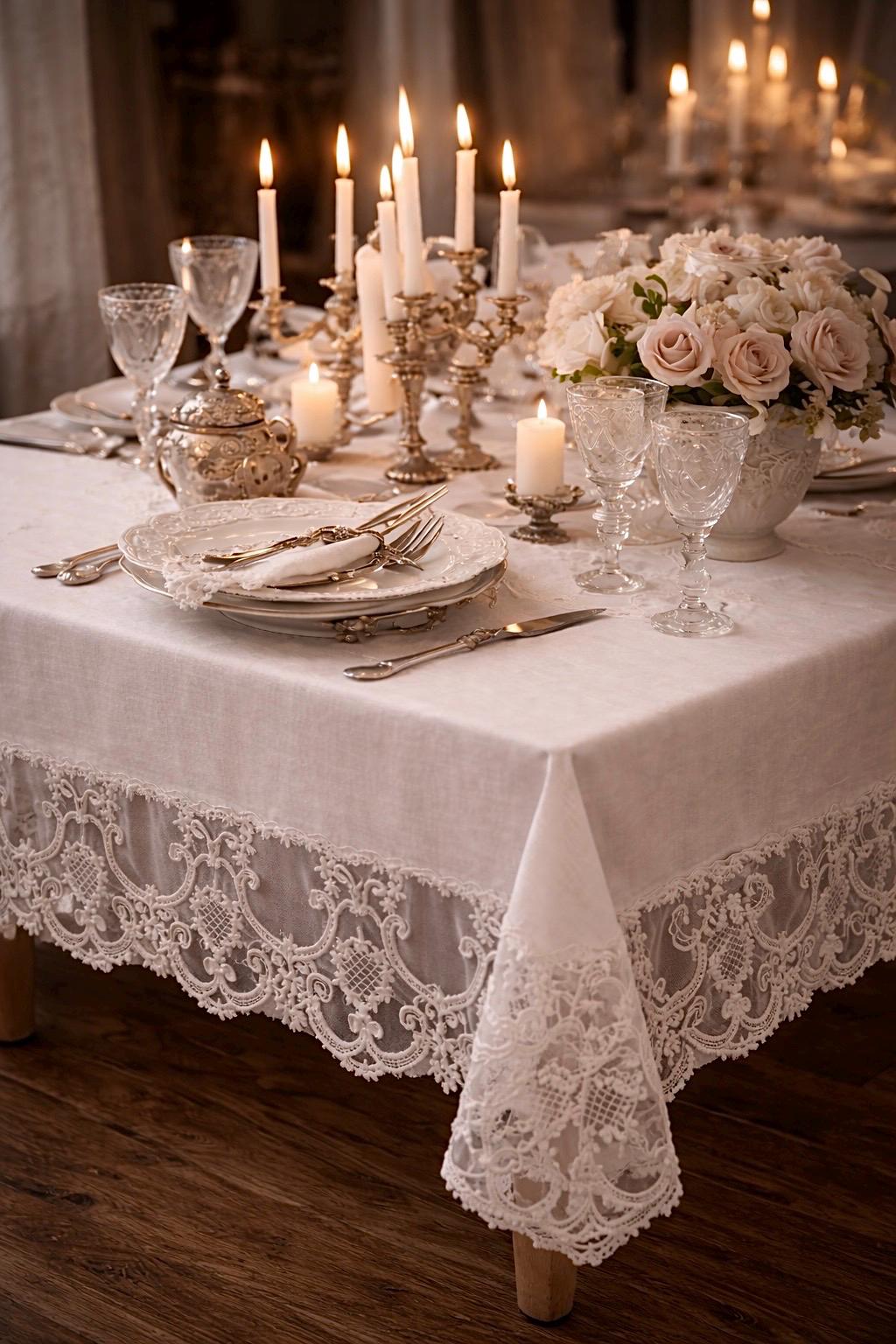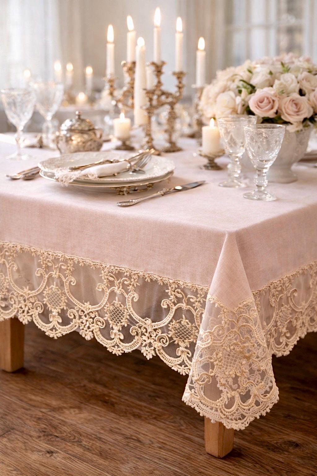 È una tovaglia pensata per feste speciali, ricevimenti eleganti, anniversari e cene importanti, ma anche per chi desidera impreziosire la propria tavola quotidiana con un dettaglio sartoriale di alta qualità.
