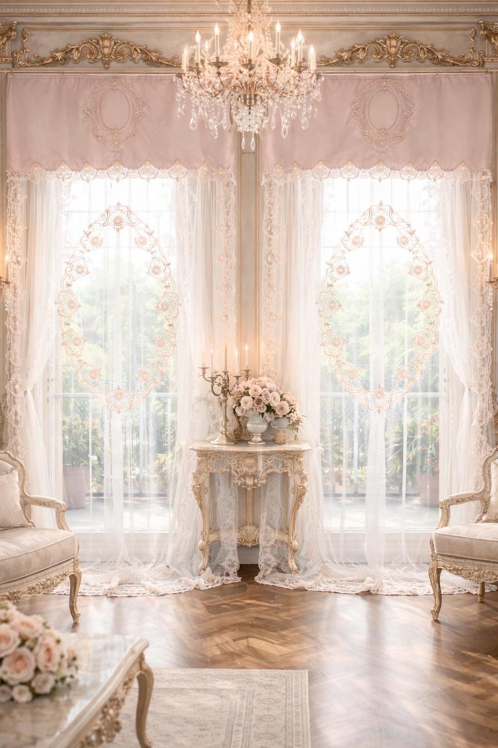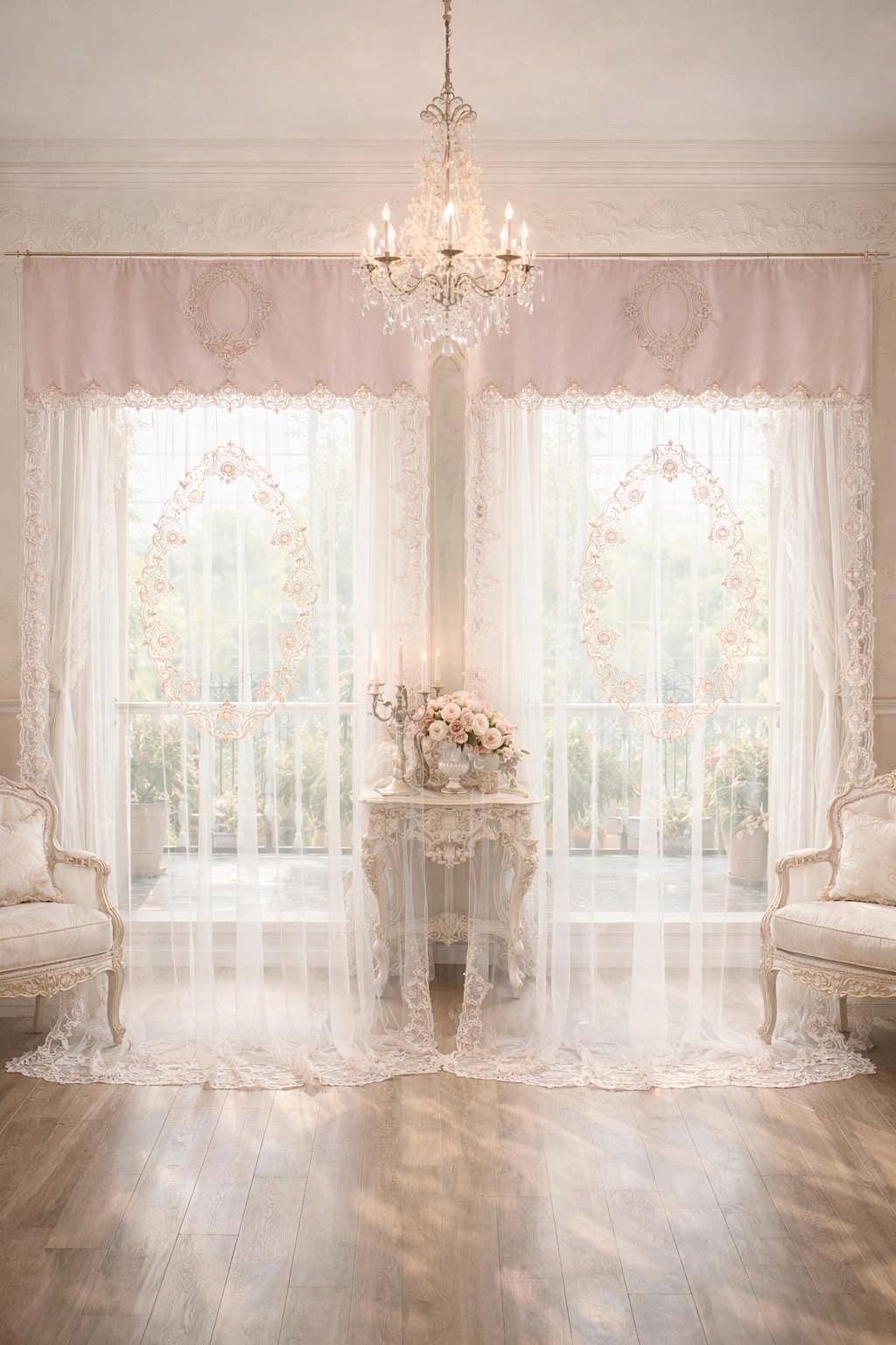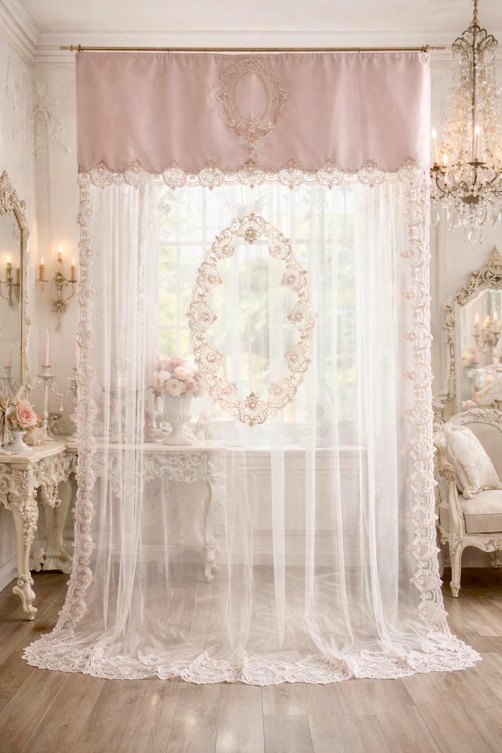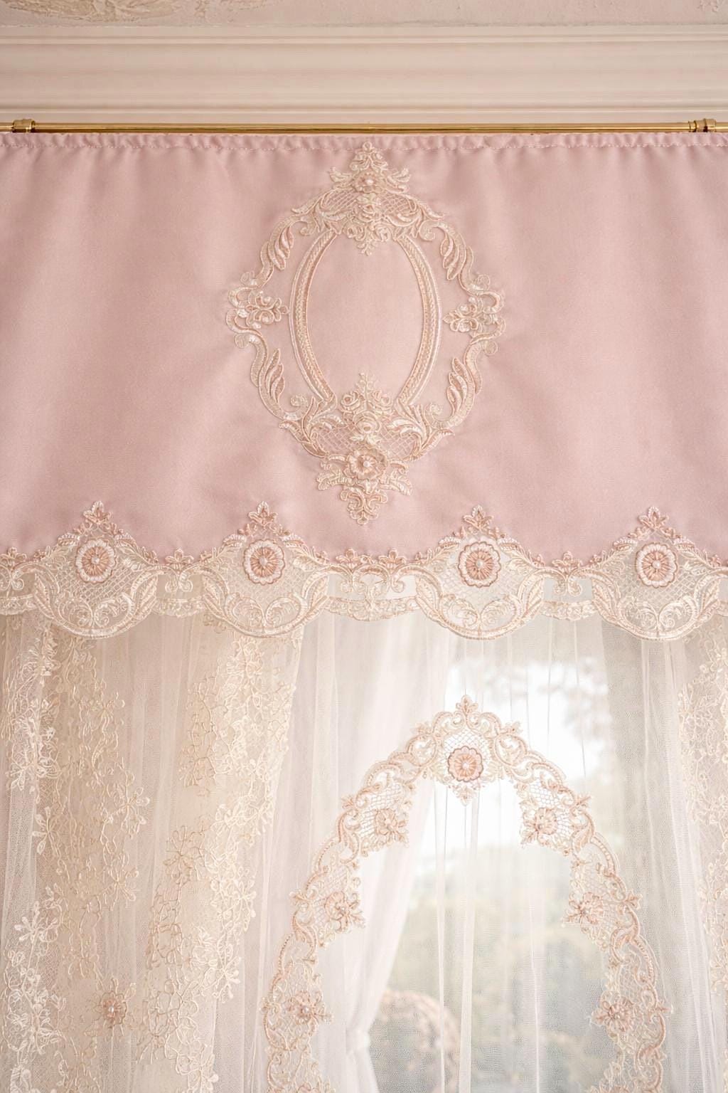 This model is ideal for those who want to transform a simple window into a truly decorative feature. The balance between the pink silk georgette valance, the light tulle, and the exquisite embroidery creates an elegant and luminous scenic effect that enhances the entire space.