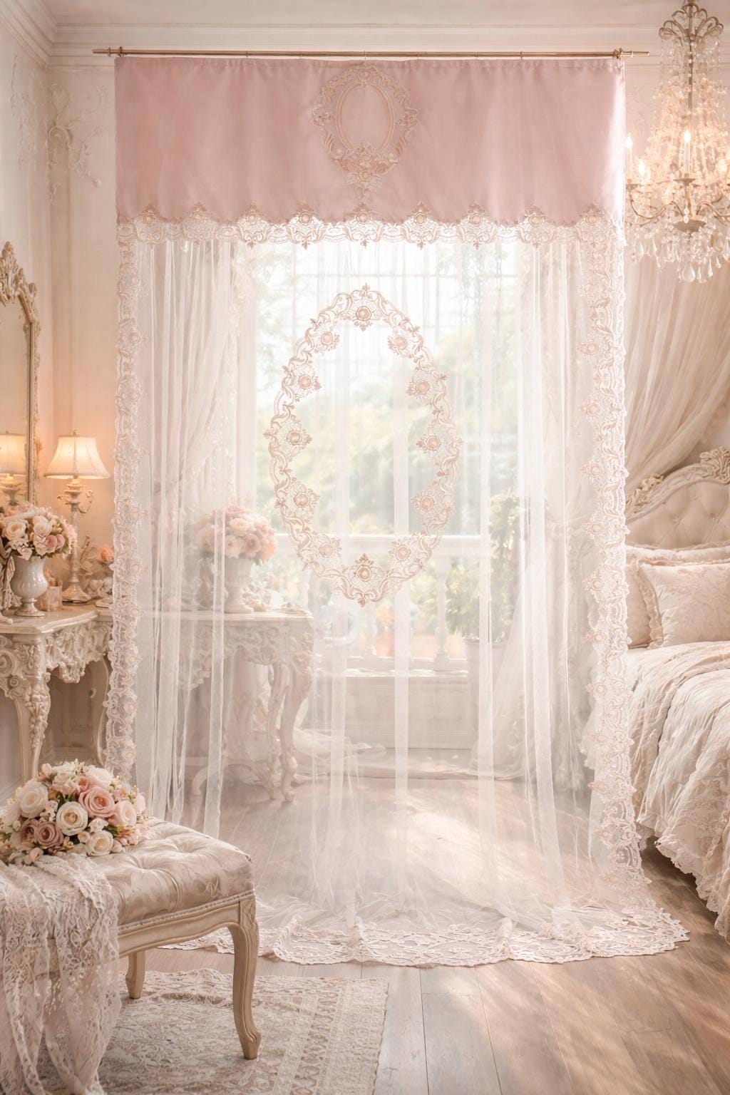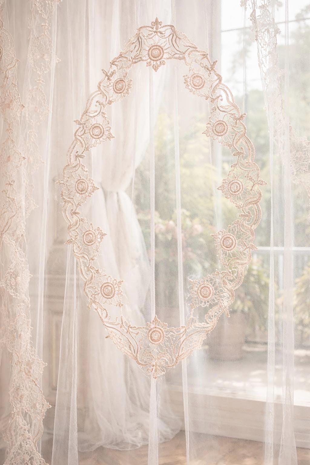 The lower curtain is made of light, transparent tulle, designed to let natural light filter through and create a delicate, romantic atmosphere.