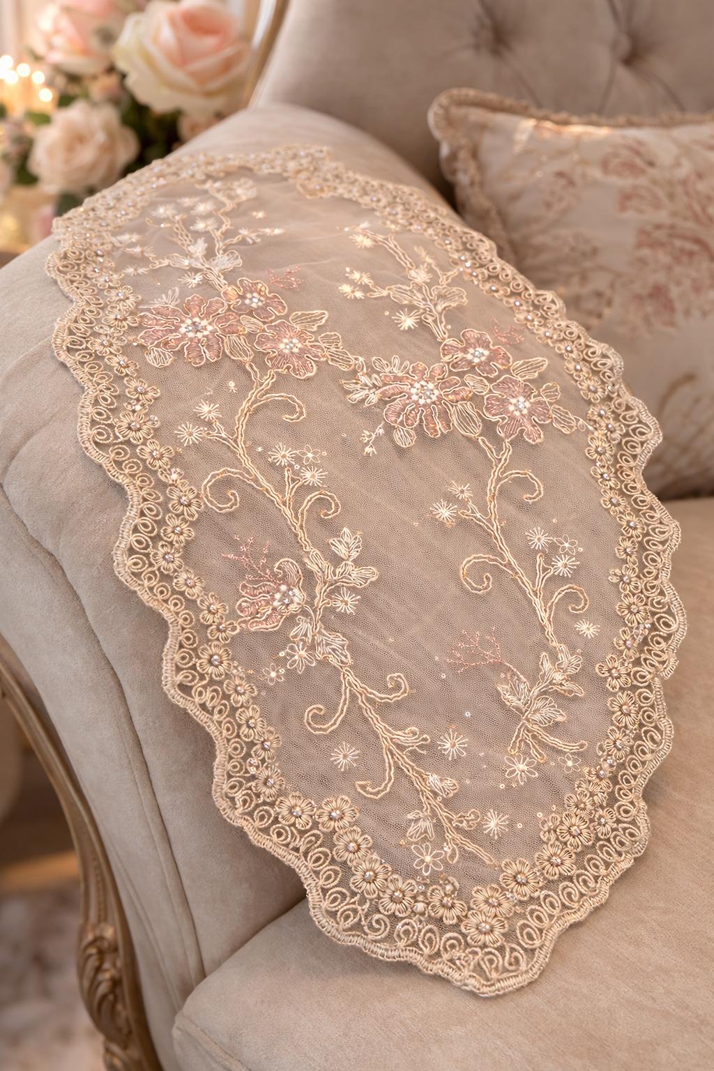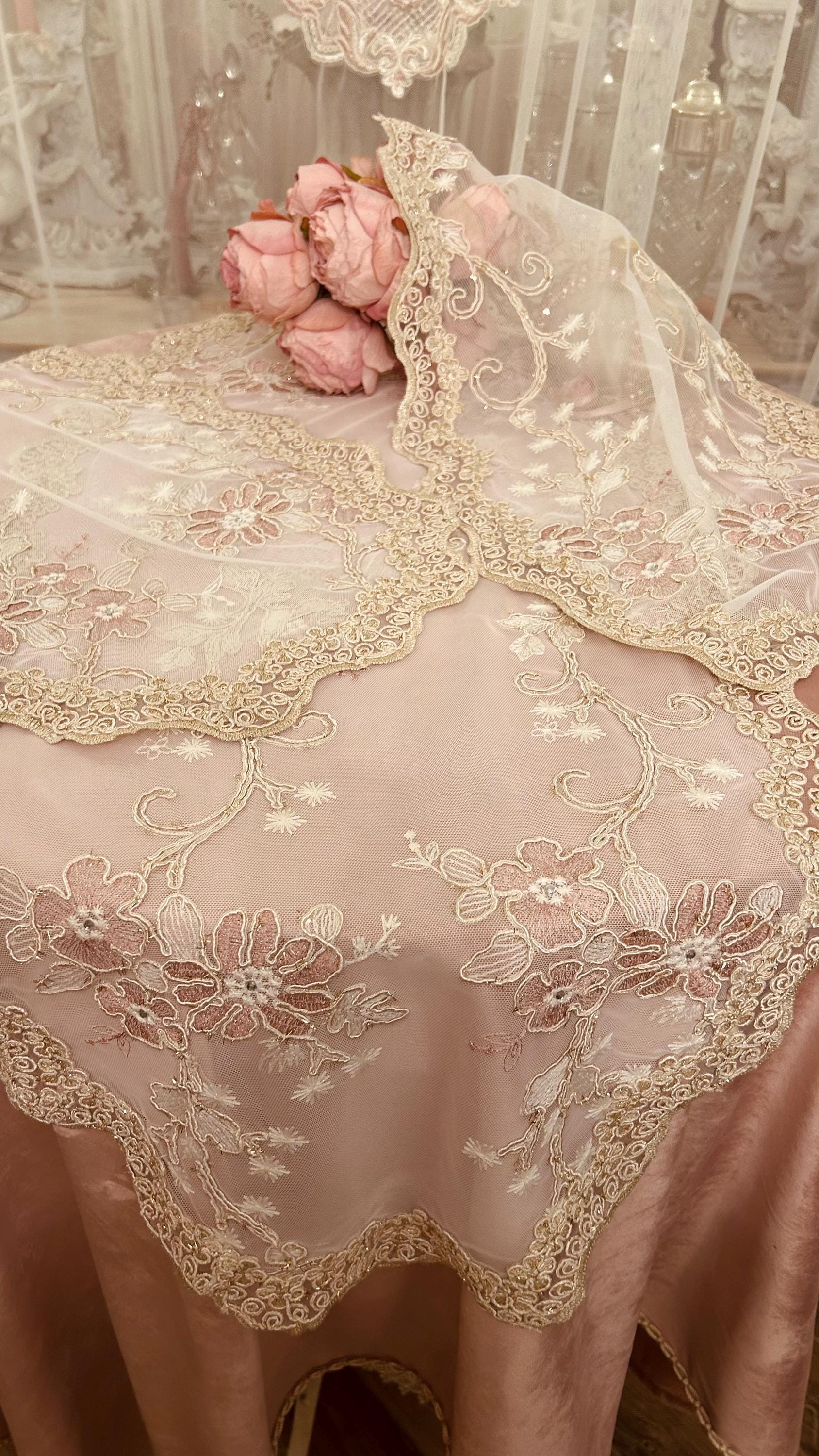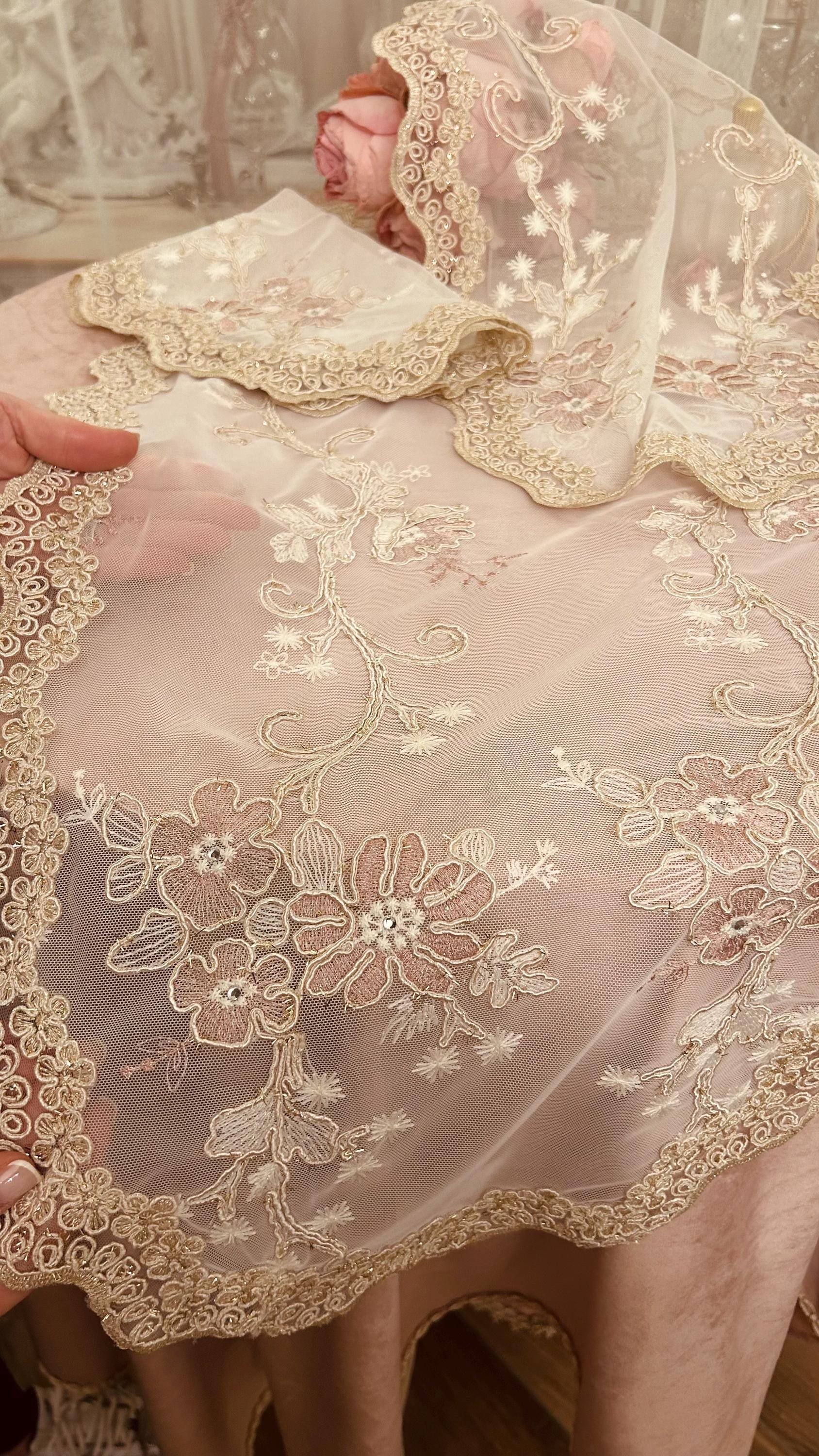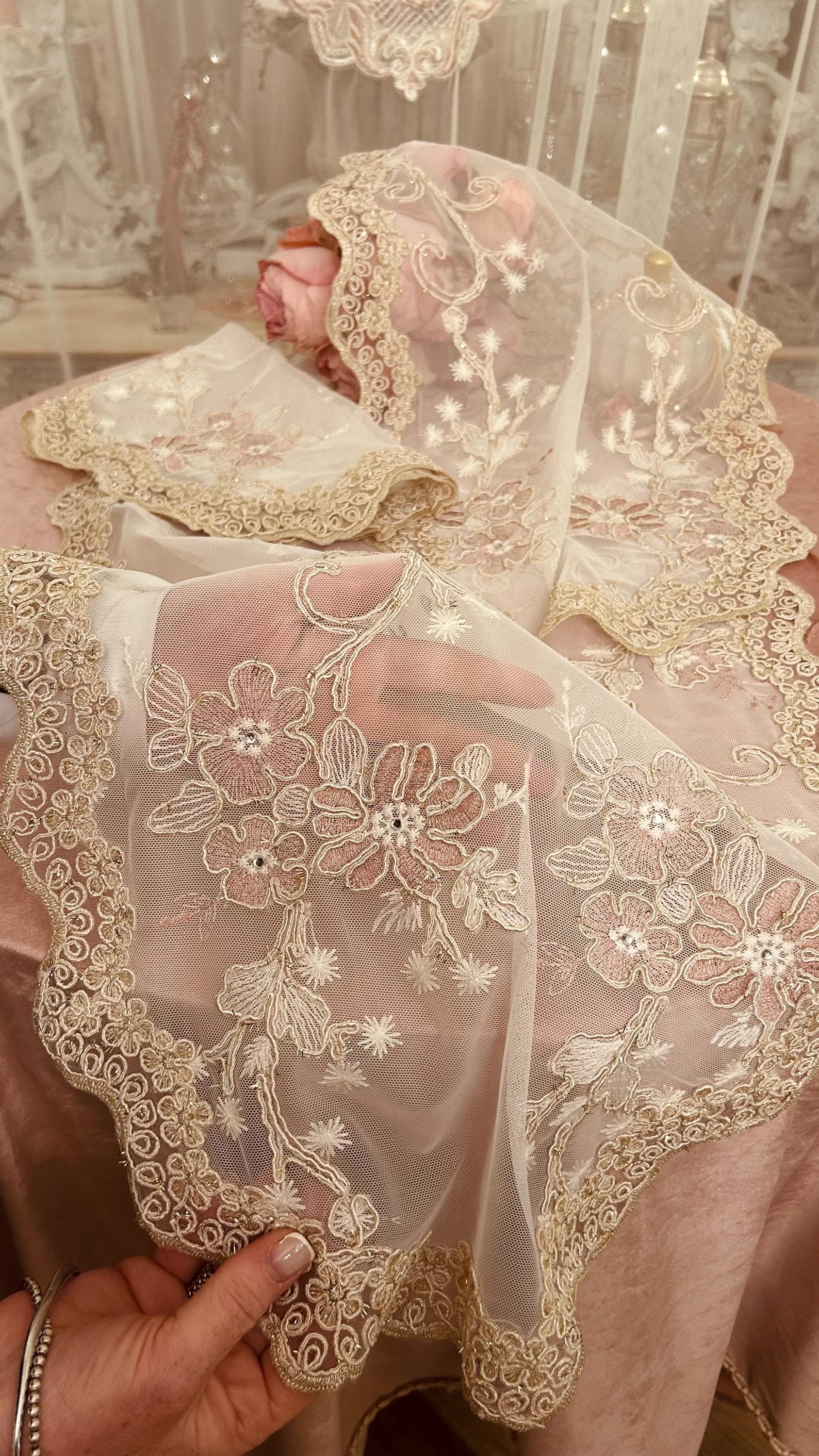 This set is crafted from lightweight sheer tulle embellished with pale gold embroidery that creates a richly detailed floral motif. The delicately pink flowers and tiny sparkles lend the fabric an elegant, understated sheen, while the gold-threaded lace trim frames each doily for a luxurious, harmonious effect.