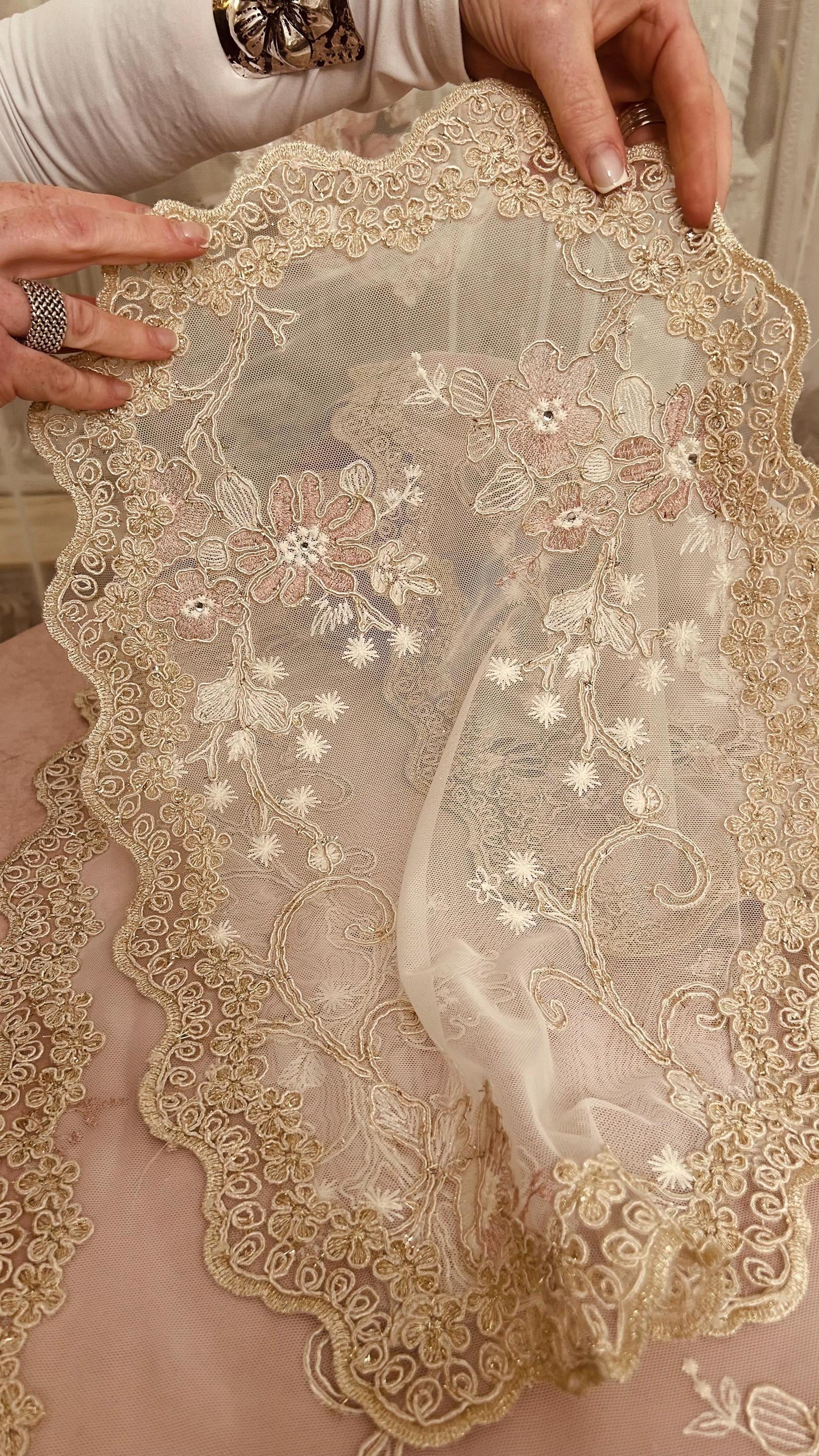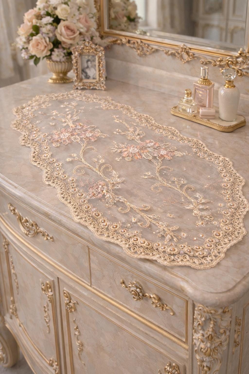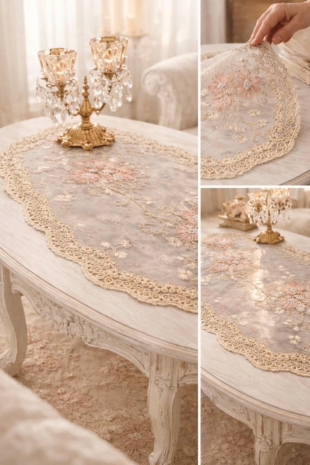 This set is crafted from lightweight sheer tulle embellished with pale gold embroidery that creates a richly detailed floral motif. The delicately pink flowers and tiny sparkles lend the fabric an elegant, understated sheen, while the gold-threaded lace trim frames each doily for a luxurious, harmonious effect.