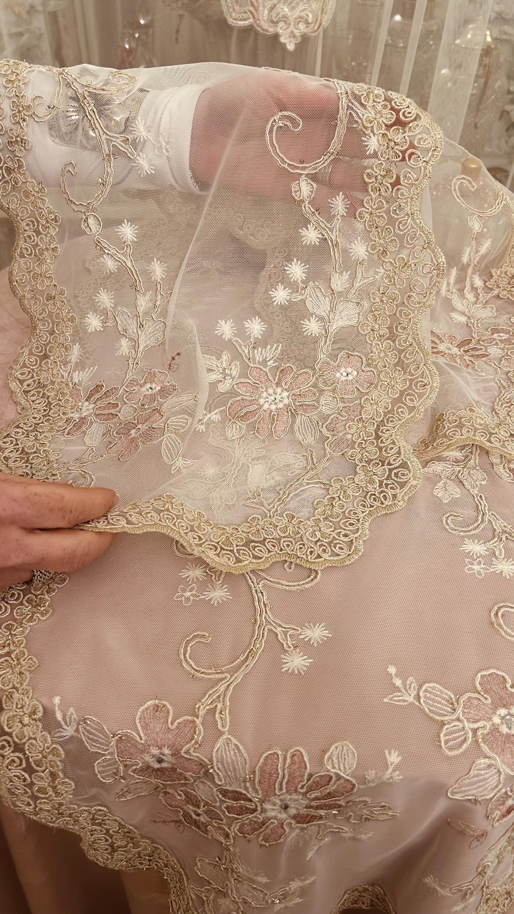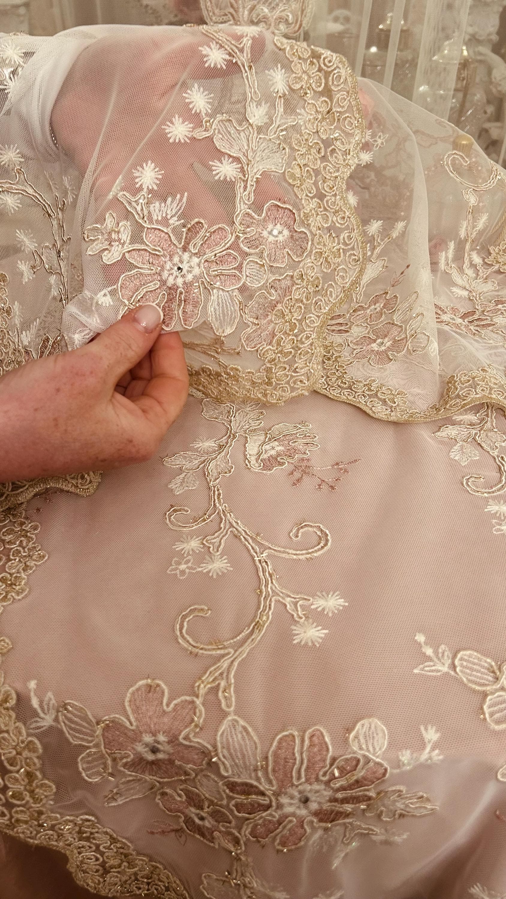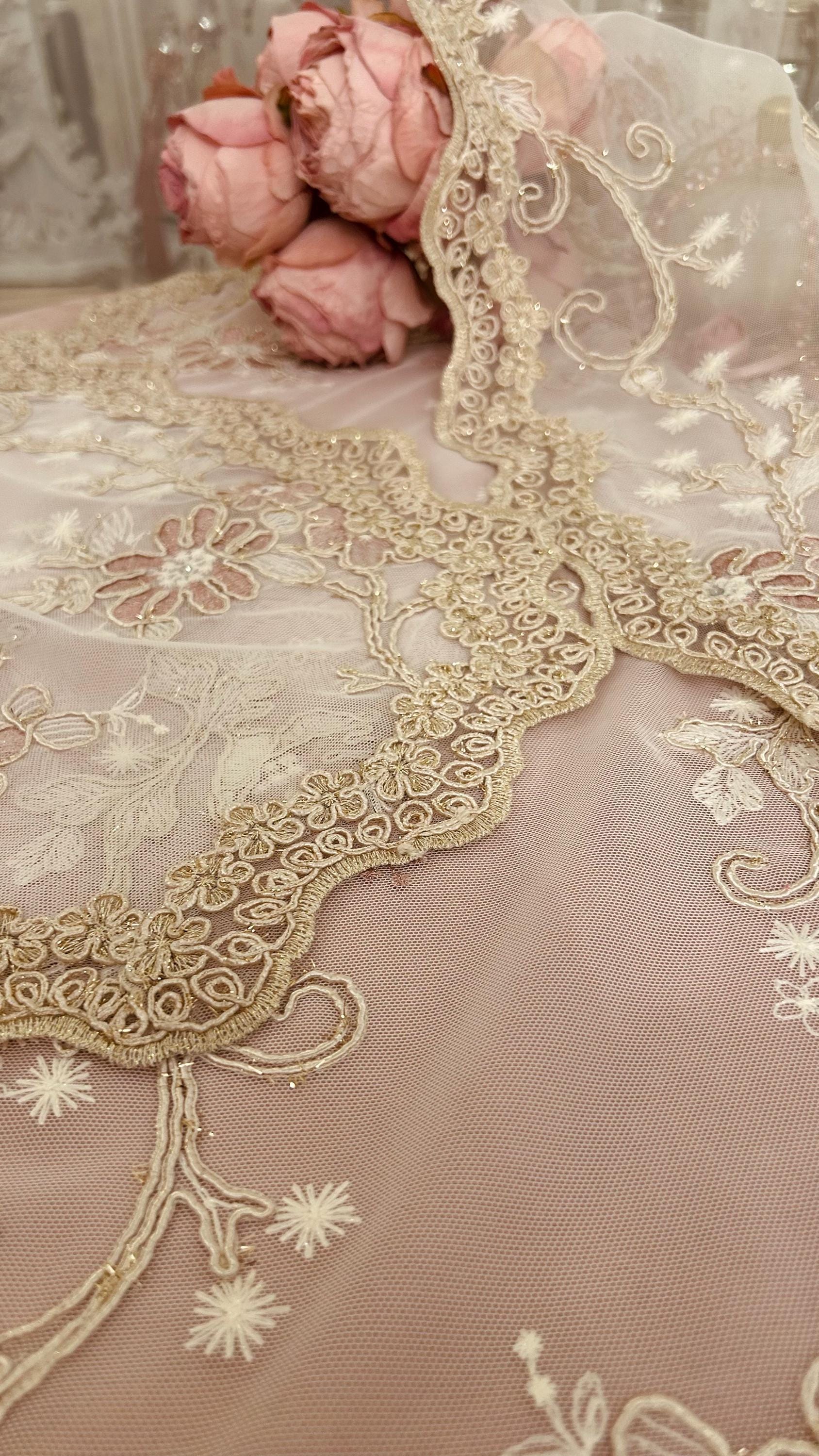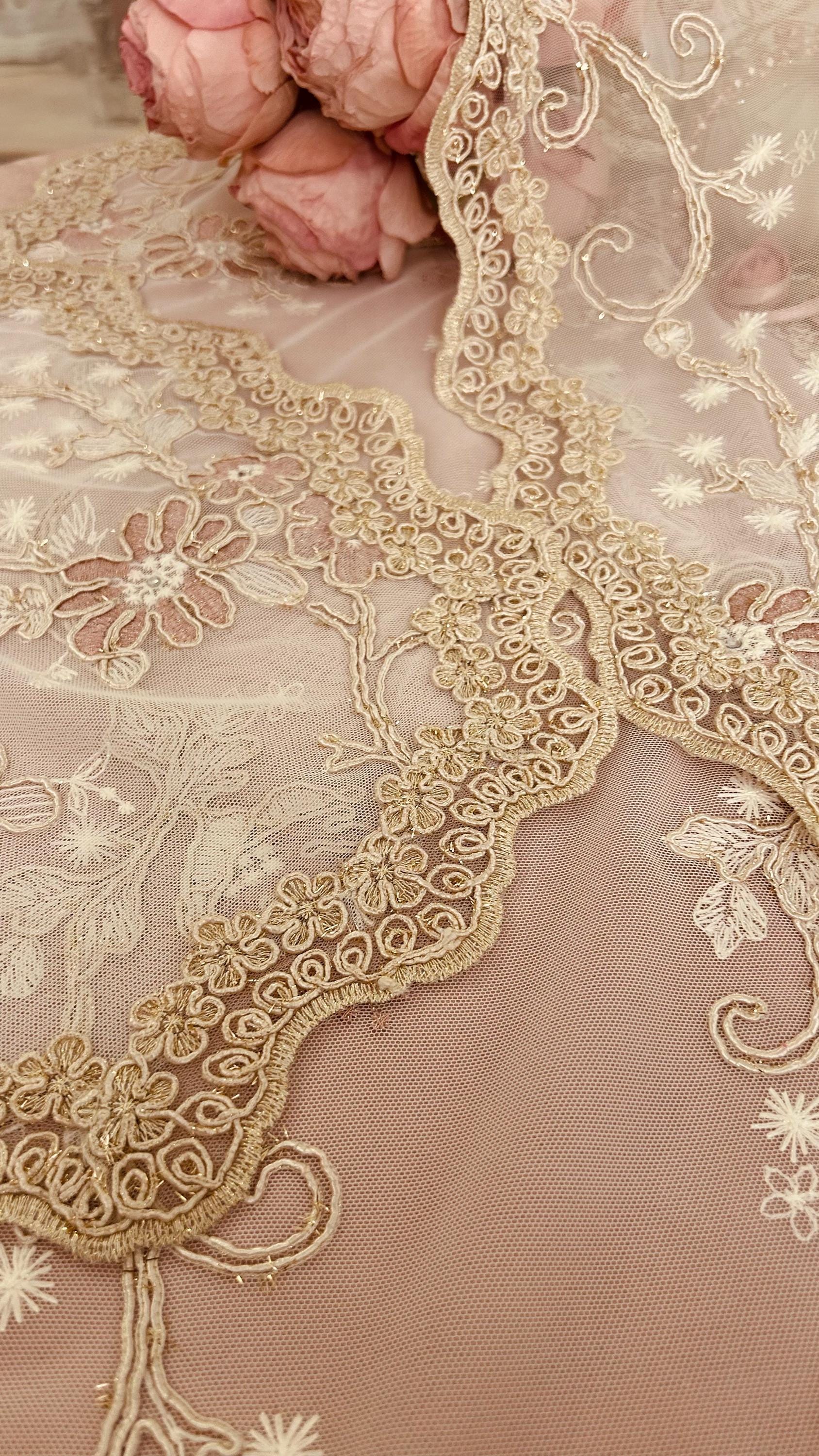 This set is crafted from lightweight sheer tulle embellished with pale gold embroidery that creates a richly detailed floral motif. The delicately pink flowers and tiny sparkles lend the fabric an elegant, understated sheen, while the gold-threaded lace trim frames each doily for a luxurious, harmonious effect.