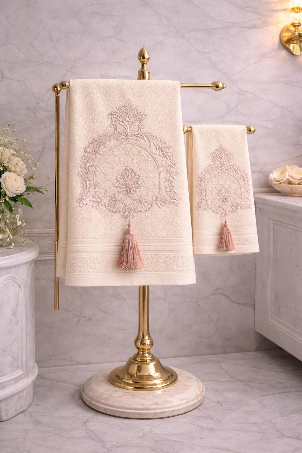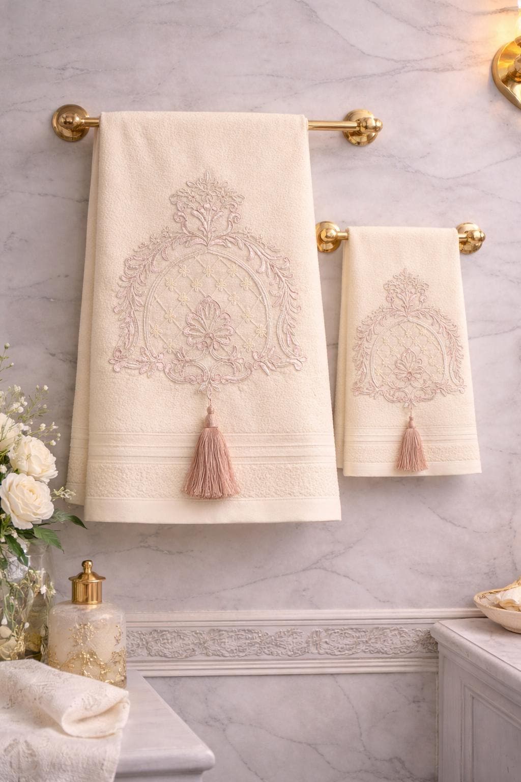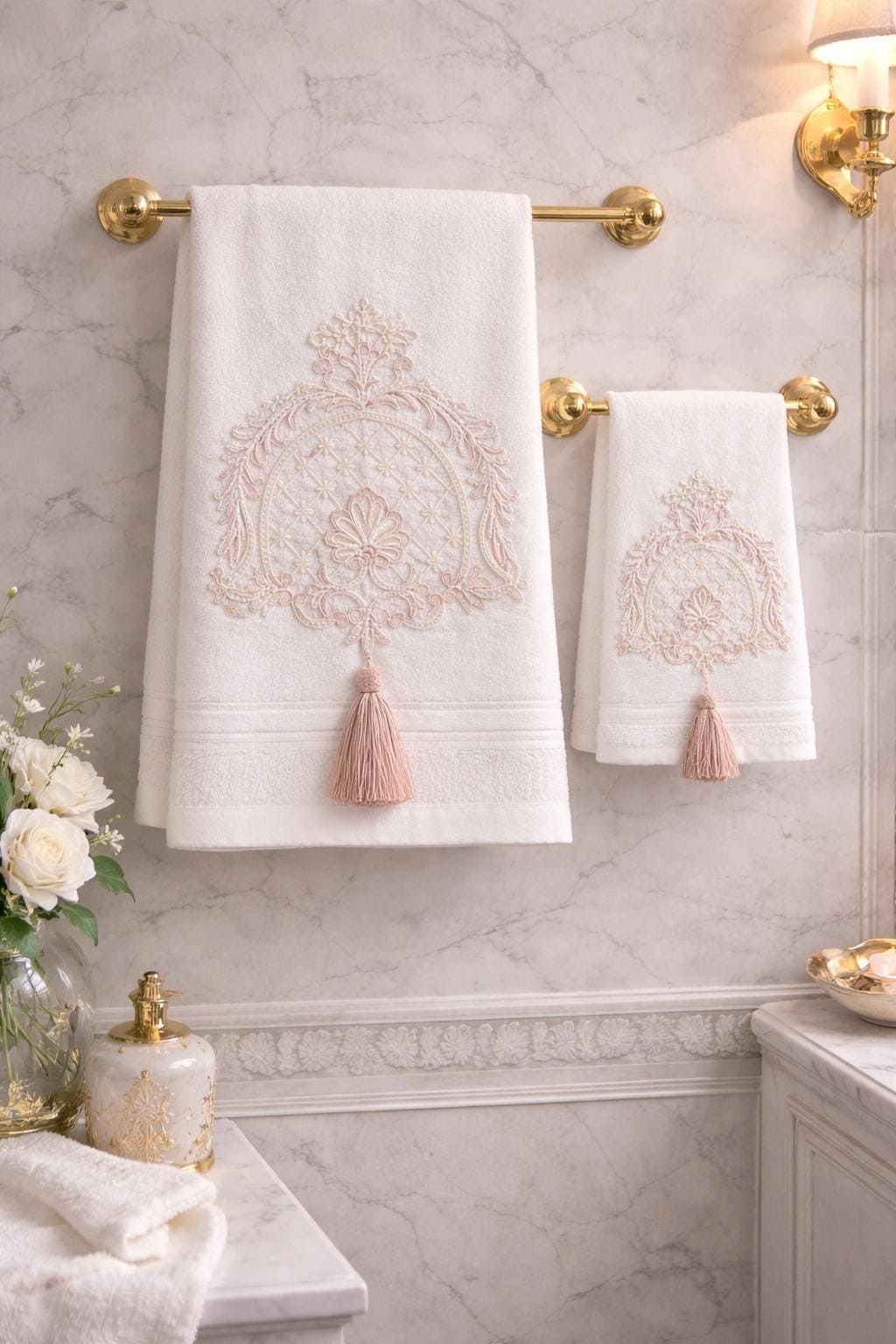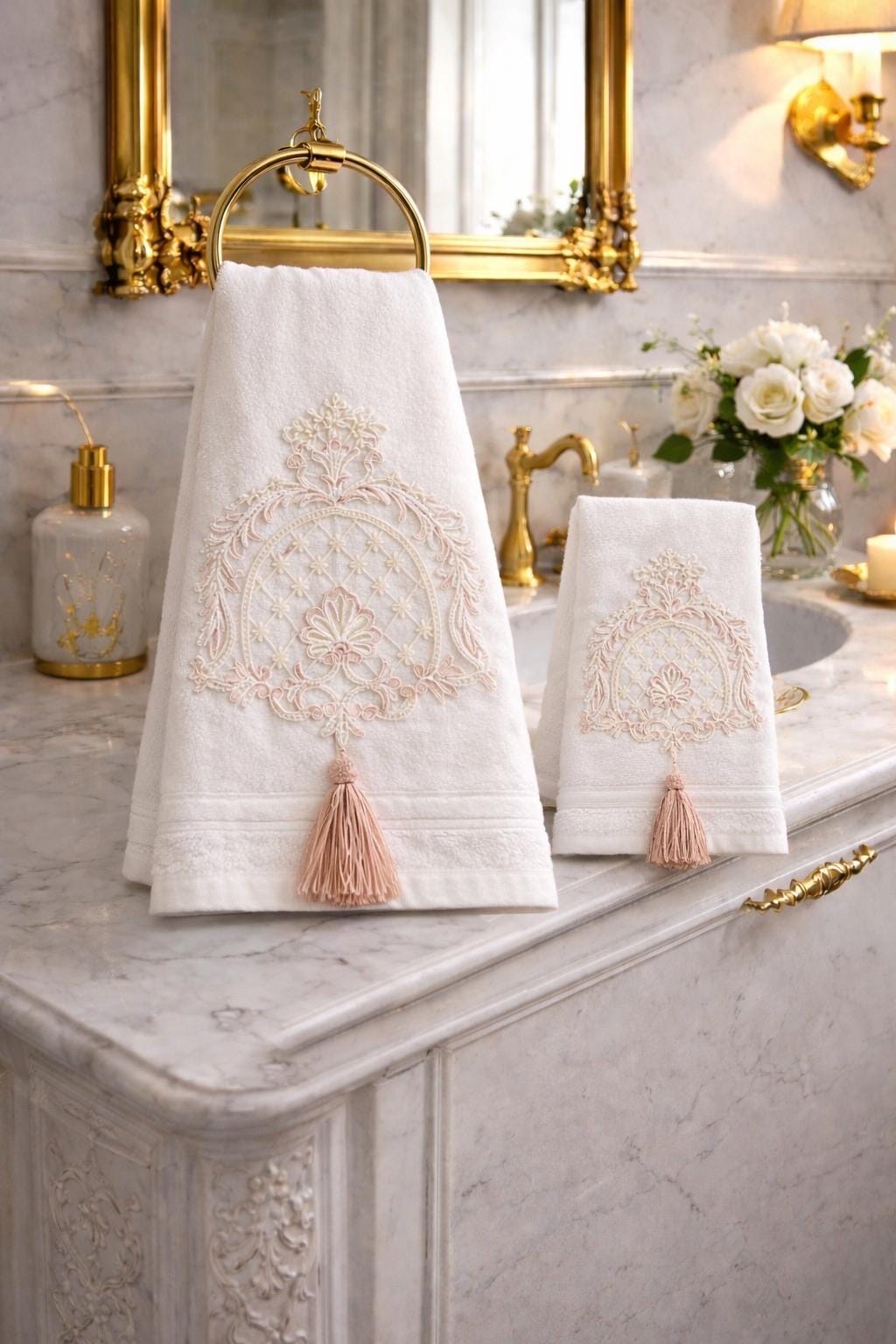 Elegante e raffinato set di due asciugamani in morbida spugna e merletto prezioso .Il set comprende 1 asciugamano di misura cm 100x54 (inches 39,37” x 21,25”) e 1 di cm 58x40( inches 22,83”x15,74”)Disponibili in colore rosa,azzurro,beige a scelta e merletto avorio