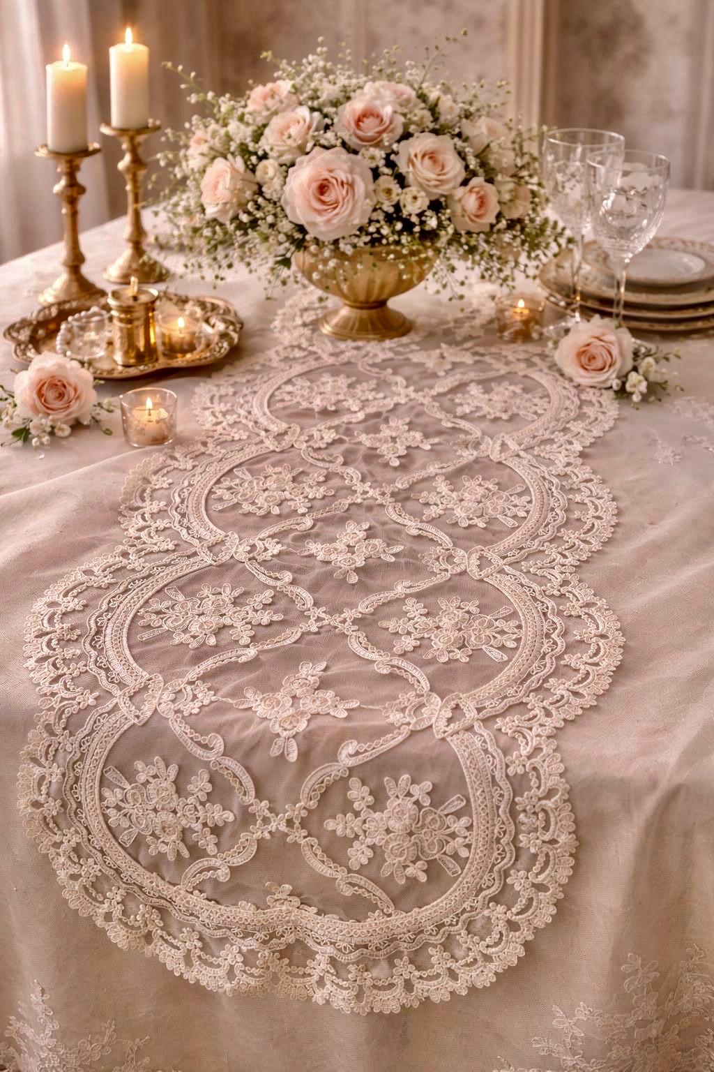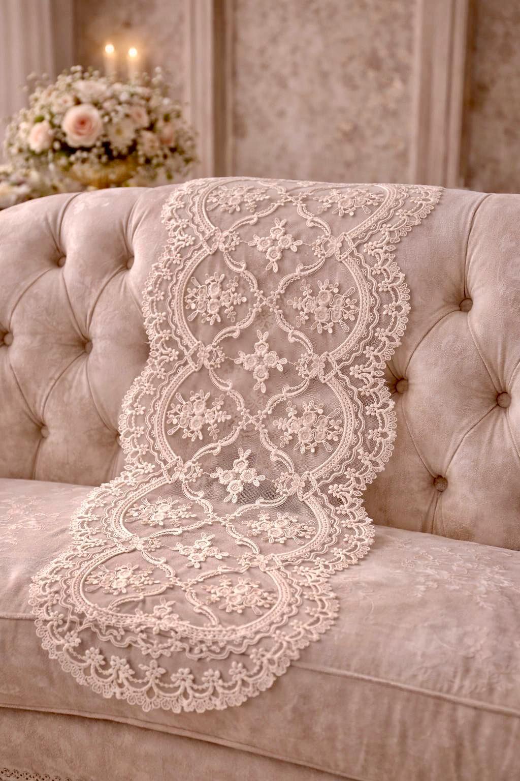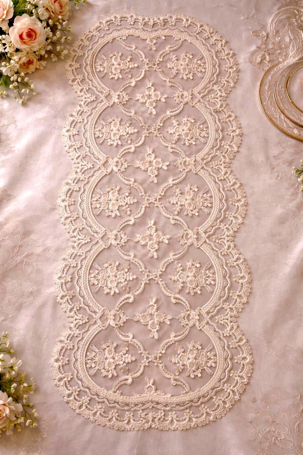 Wonderful runner in rebrodè lace and roses with light gold threads. Handmade in our tailoring workshops, in width 38 cm (14.96 inches), in different length sizes that can be purchased individually or you can purchase the trio consisting of 2 of 38x38 cm and 1 of 38x60. Or purchase them individually.