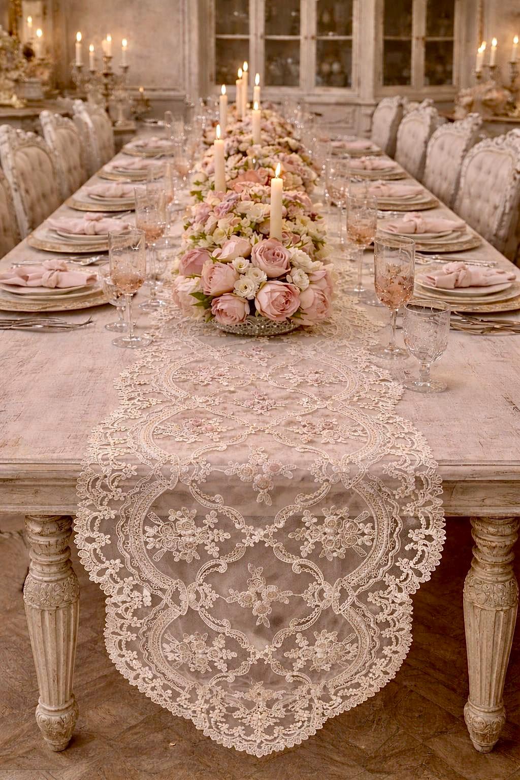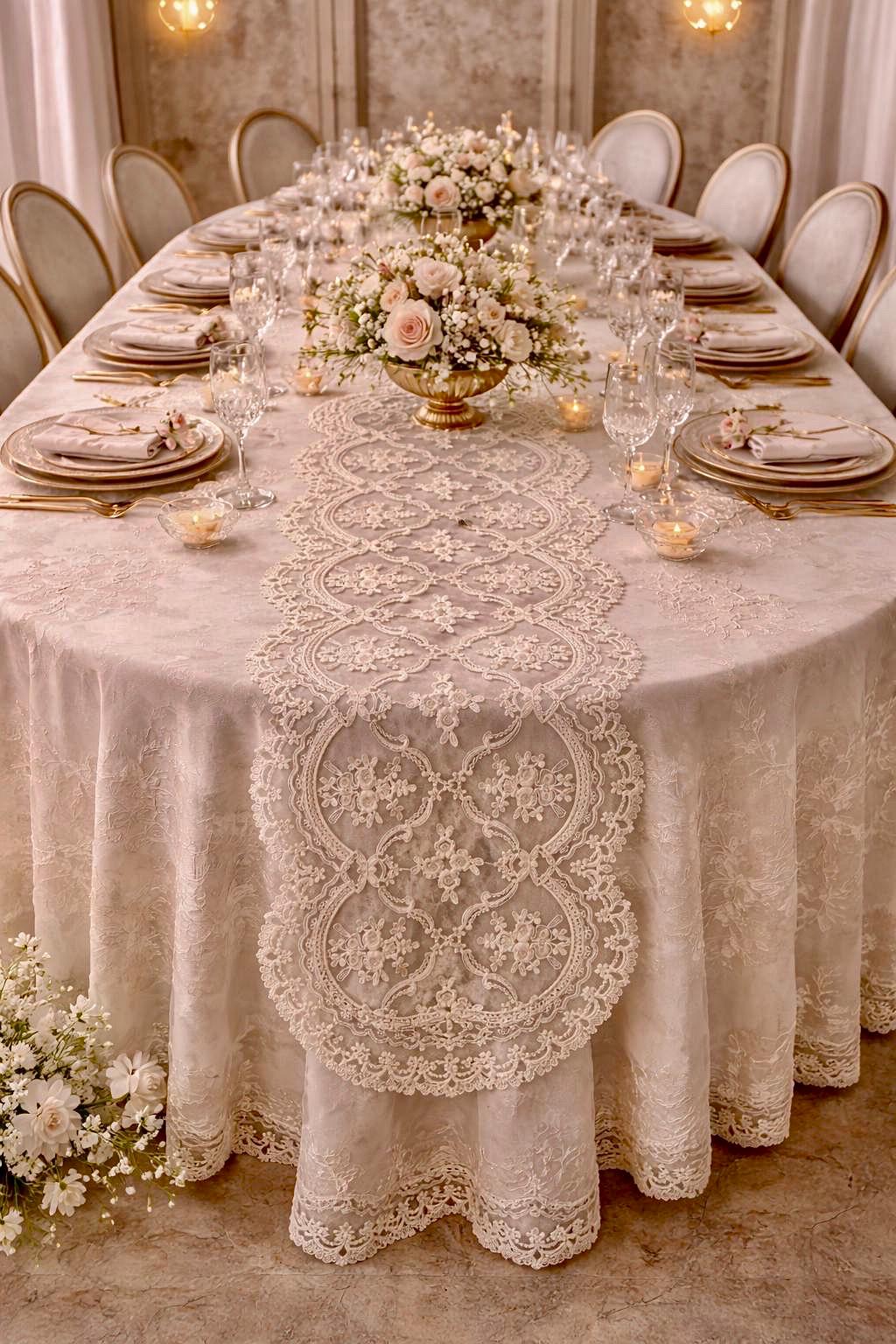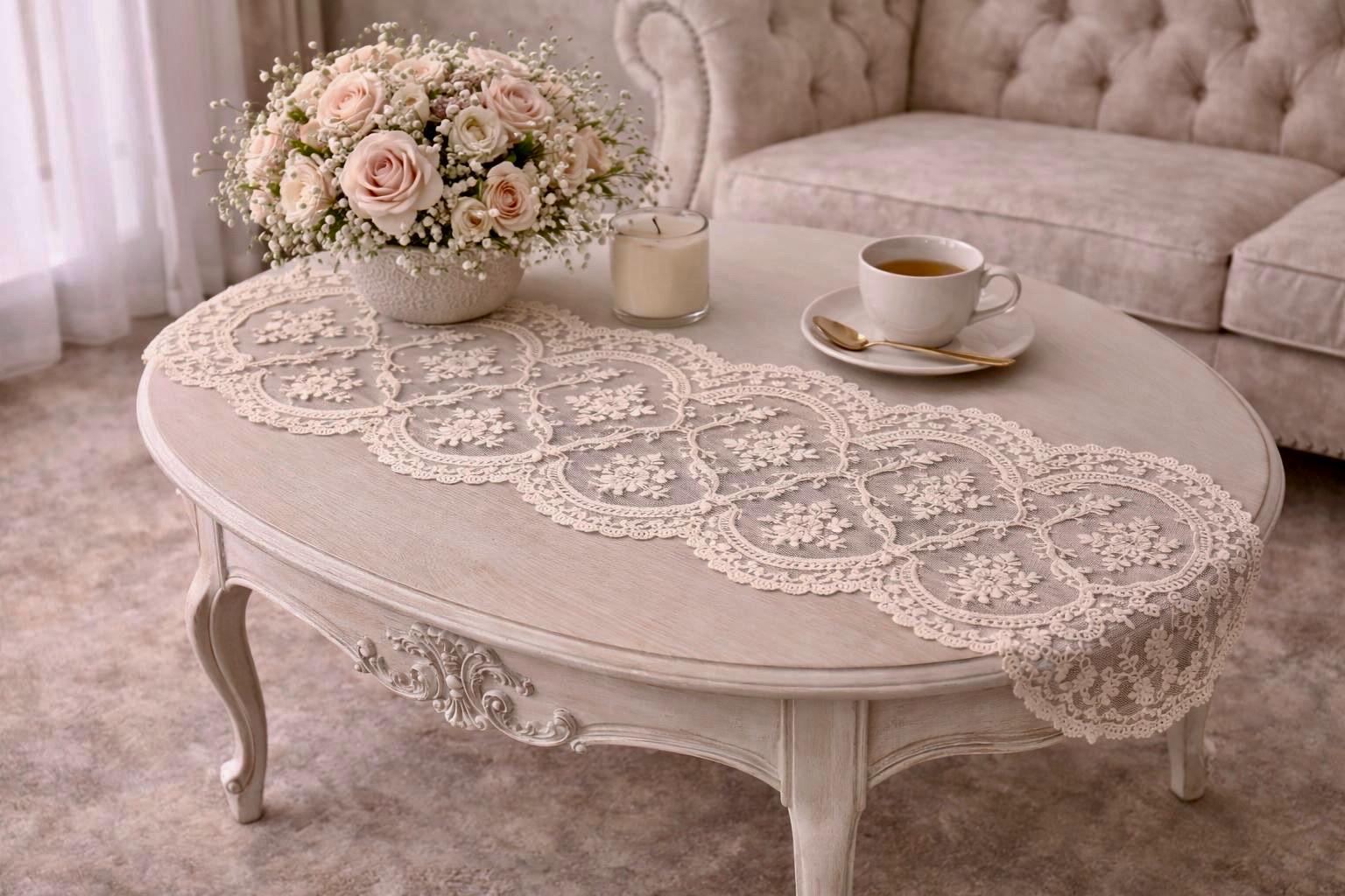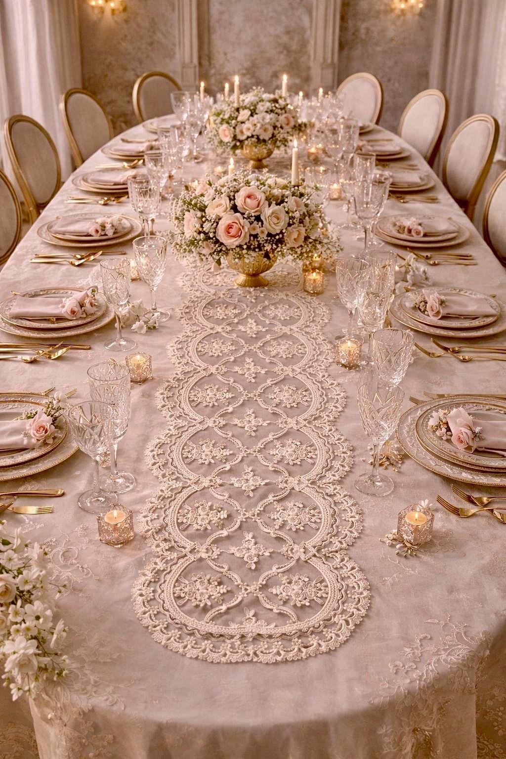 Wonderful runner in rebrodè lace and roses with light gold threads. Handmade in our tailoring workshops, in width 38 cm (14.96 inches), in different length sizes that can be purchased individually or you can purchase the trio consisting of 2 of 38x38 cm and 1 of 38x60. Or purchase them individually.