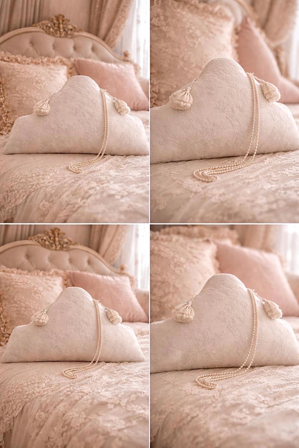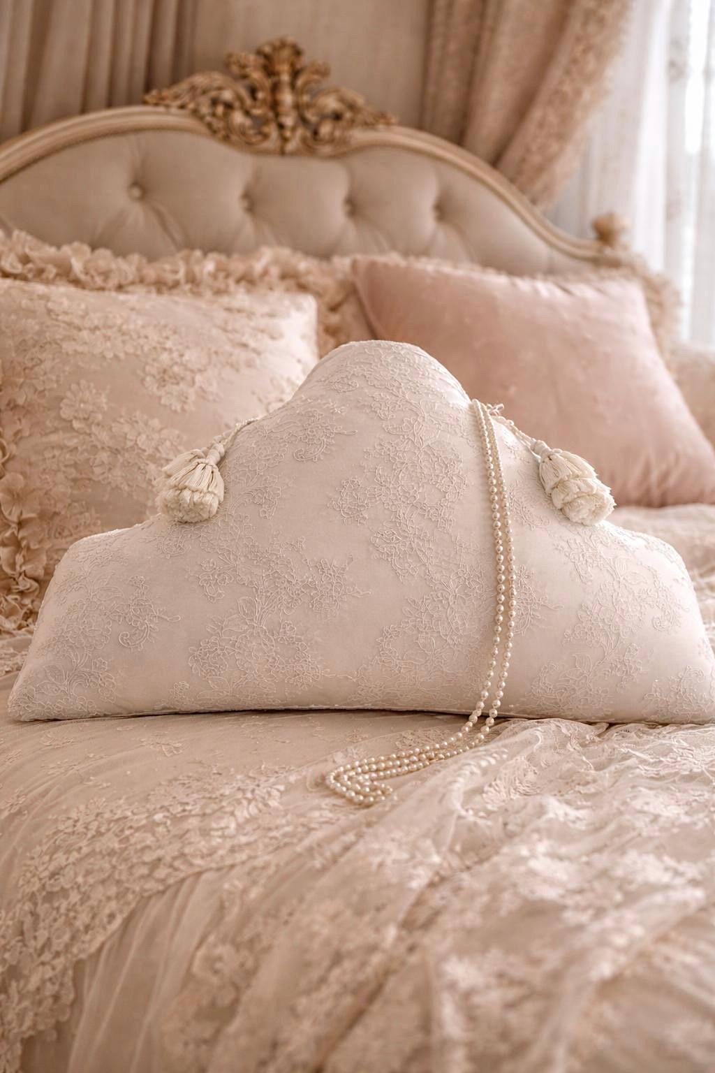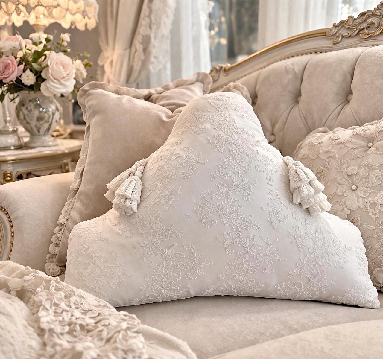 Realizzato in seta dal delicato tono bianco leggermente avorio, presenta nella parte anteriore un prezioso rivestimento in pizzo finemente lavorato, scelto per la sua qualità e per il suo disegno elegante e senza tempo. Il merletto, ricco ma leggero, crea un effetto sofisticato che valorizza ogni dettaglio del cuscino.