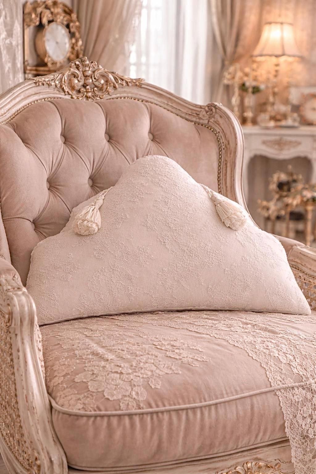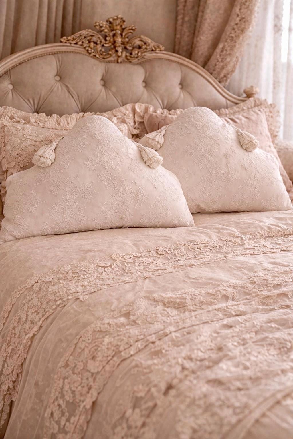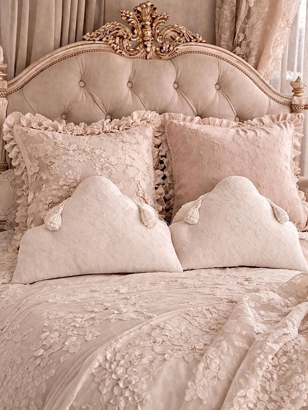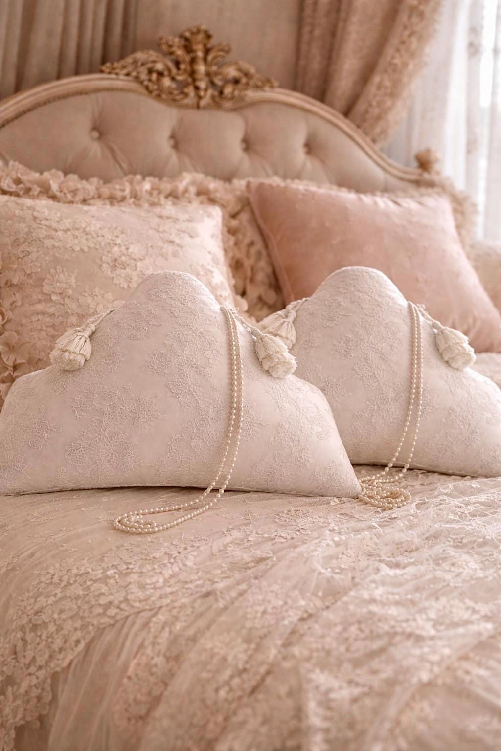 Realizzato in seta dal delicato tono bianco leggermente avorio, presenta nella parte anteriore un prezioso rivestimento in pizzo finemente lavorato, scelto per la sua qualità e per il suo disegno elegante e senza tempo. Il merletto, ricco ma leggero, crea un effetto sofisticato che valorizza ogni dettaglio del cuscino.